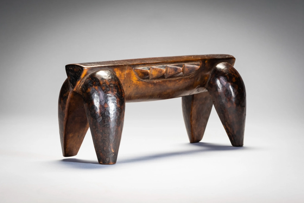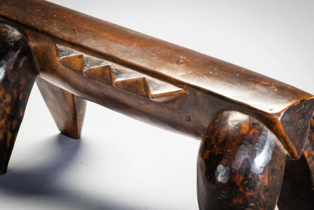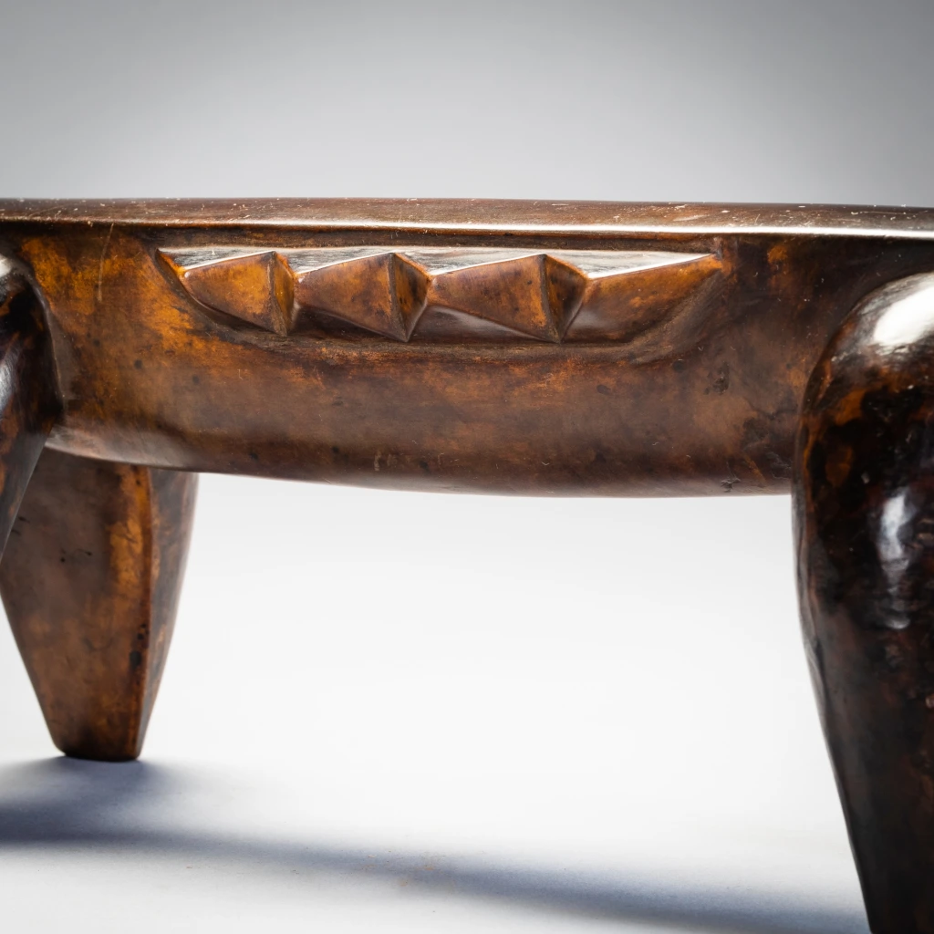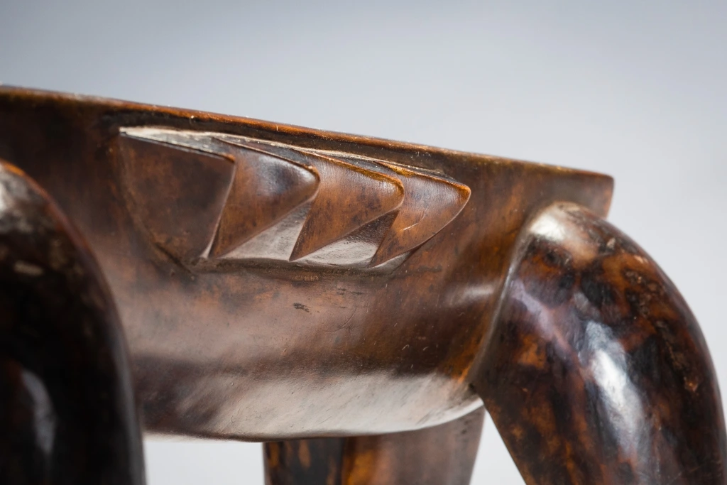 Une pièce épurée et stylisée, de la même main que la célèbre pièce du British Museum. Néanmoins, la décoration diffère, celle-ci n’ayant pas de pyrogravures, se contentant ainsi d’être recouverte d’une belle patine miel foncée. Ses écailles latérales et ses couleurs font penser à une tortue comme celle que l’on peut apercevoir dans les lacs du Nord du KwazuluNatal côtoyant quelques crocodiles.