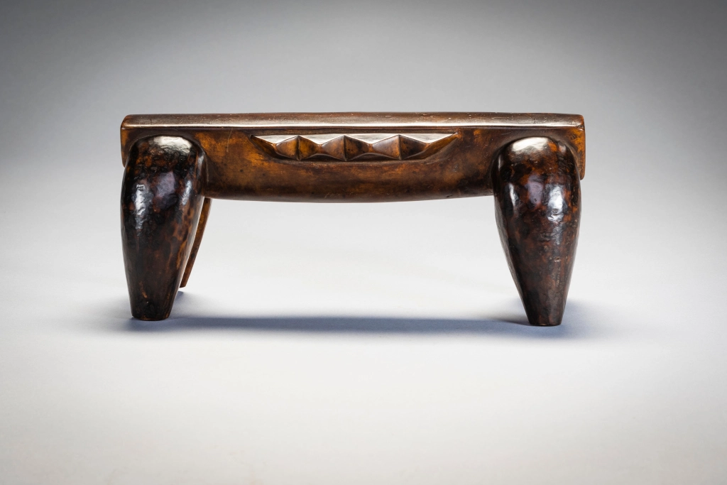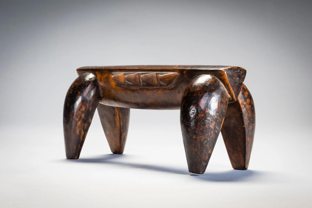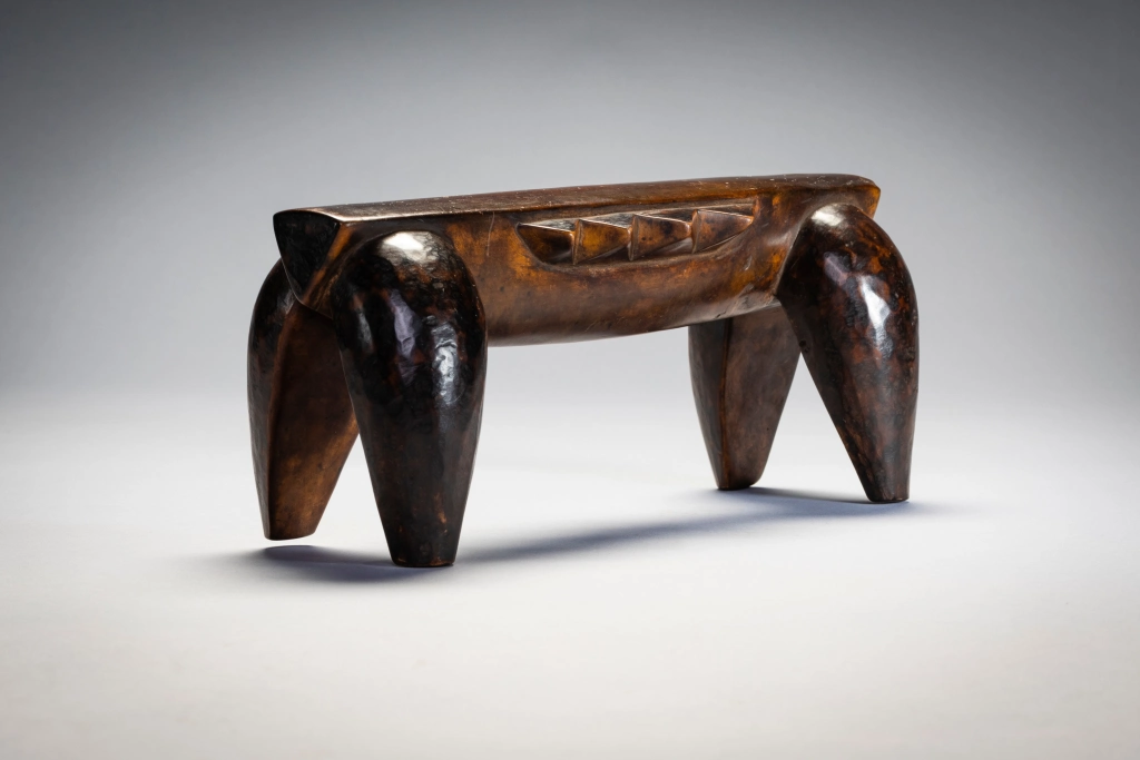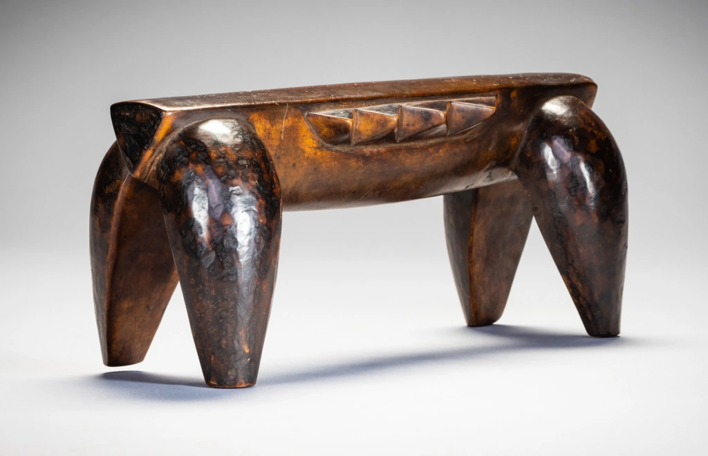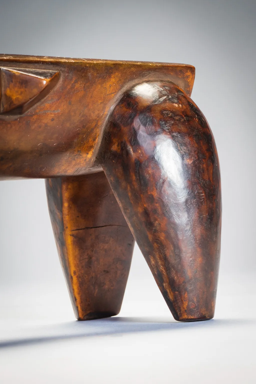Une pièce épurée et stylisée, de la même main que la célèbre pièce du British Museum. Néanmoins, la décoration diffère, celle-ci n’ayant pas de pyrogravures, se contentant ainsi d’être recouverte d’une belle patine miel foncée. Ses écailles latérales et ses couleurs font penser à une tortue comme celle que l’on peut apercevoir dans les lacs du Nord du KwazuluNatal côtoyant quelques crocodiles.