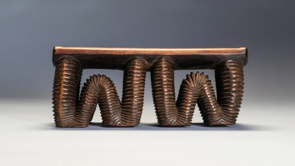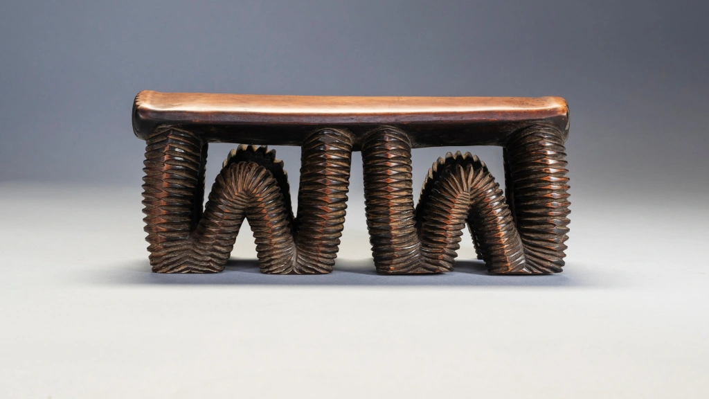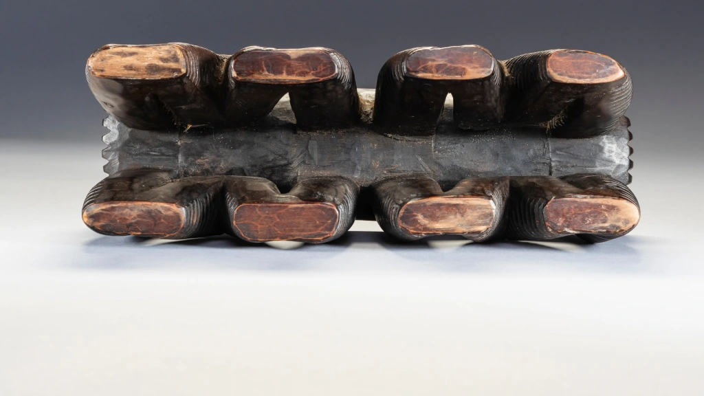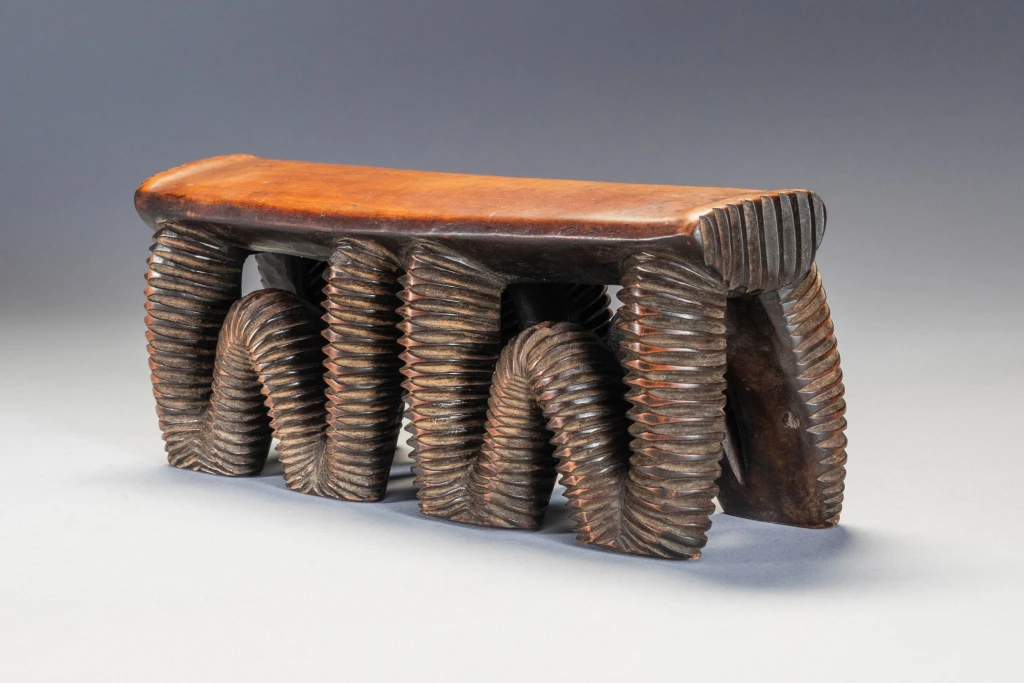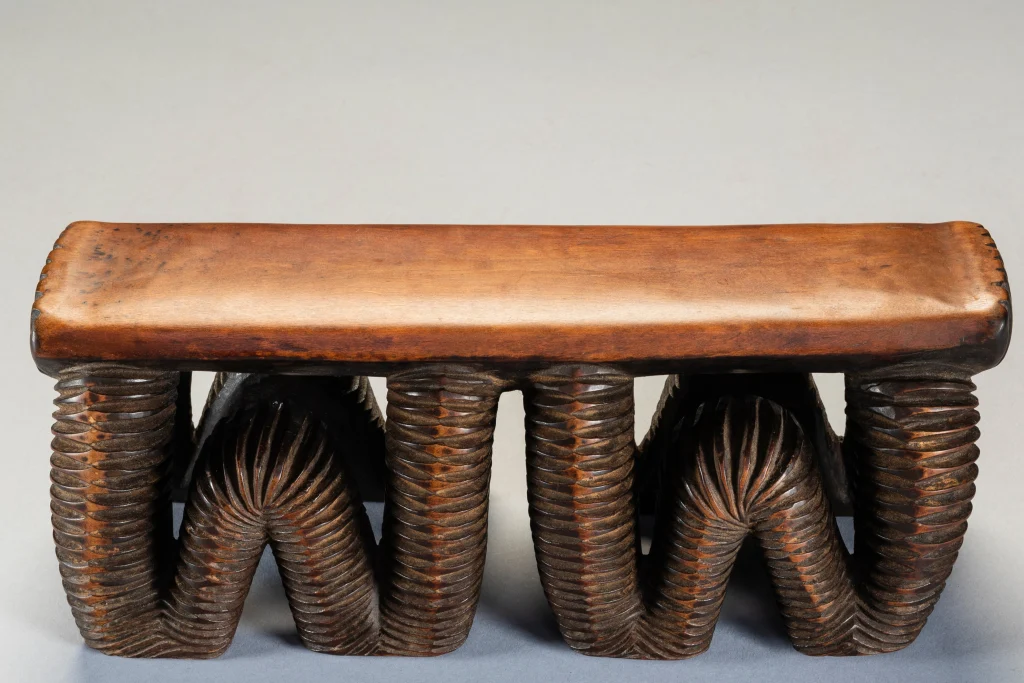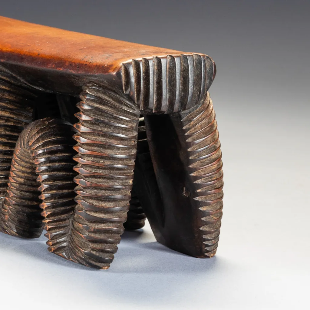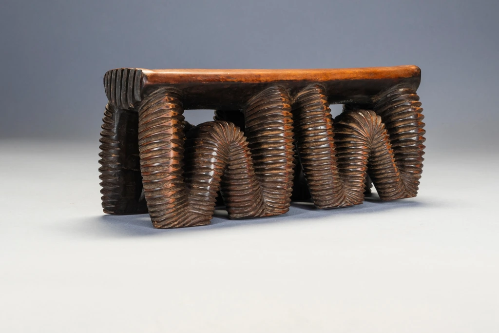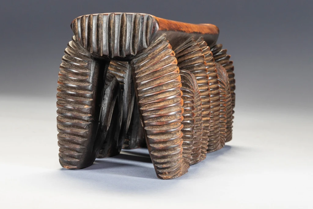 Cet appui-tête considéré comme swazi dans les registres du musée de Rotterdam appartient à l’ensemble d’objets déposés par A. M. Brunner, in 1886. Il se distingue par la forme de son support en boucles profondément creusées de rainures parallèles et noircies. Ce type de décor est caractéristique d’un style nguni du nord et swazi, il rappelle les étonnants récipients qui sont entrés dans la seconde moitié du XIXe siècle dans les collections sud-africaines et européennes. Cet impressionnant appui-tête se compose d’un support rectangulaire soutenu par quatre pieds sinueux, chacun d’entre eux touchant le sol en deux points. Utilisant une technique courante chez les grands récipients en bois zoulou, les pieds sont sculptés de stries sur l’ensemble de leur surface serpentine, ce qui leur confère un impact esthétique spectaculaire.