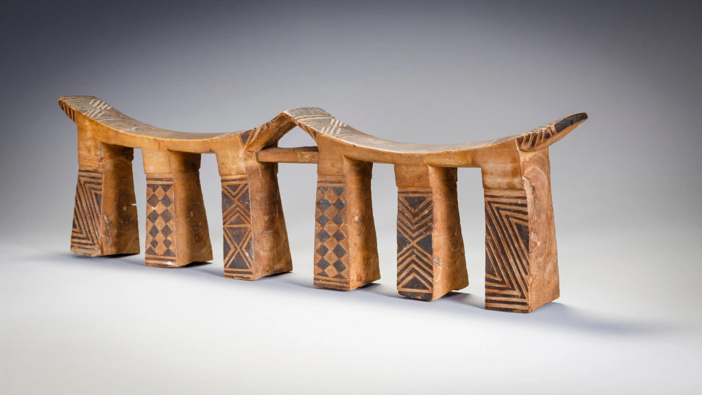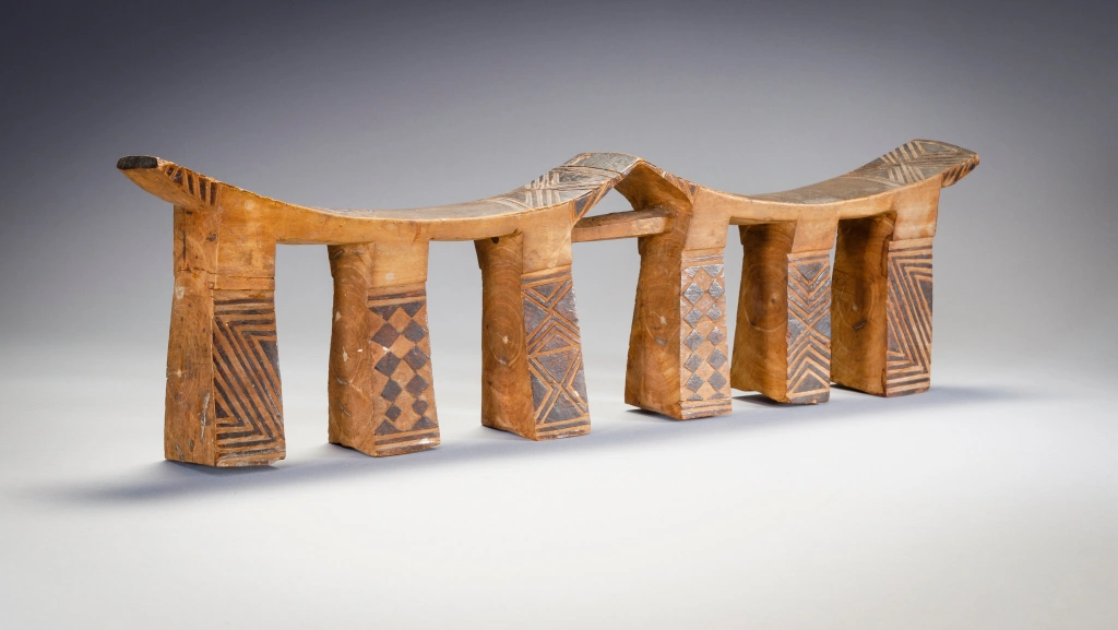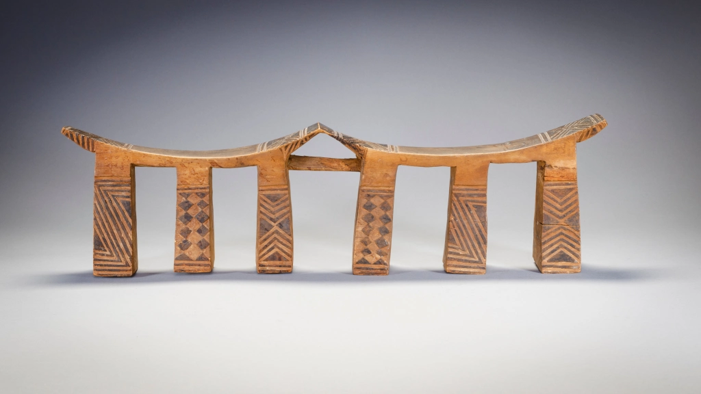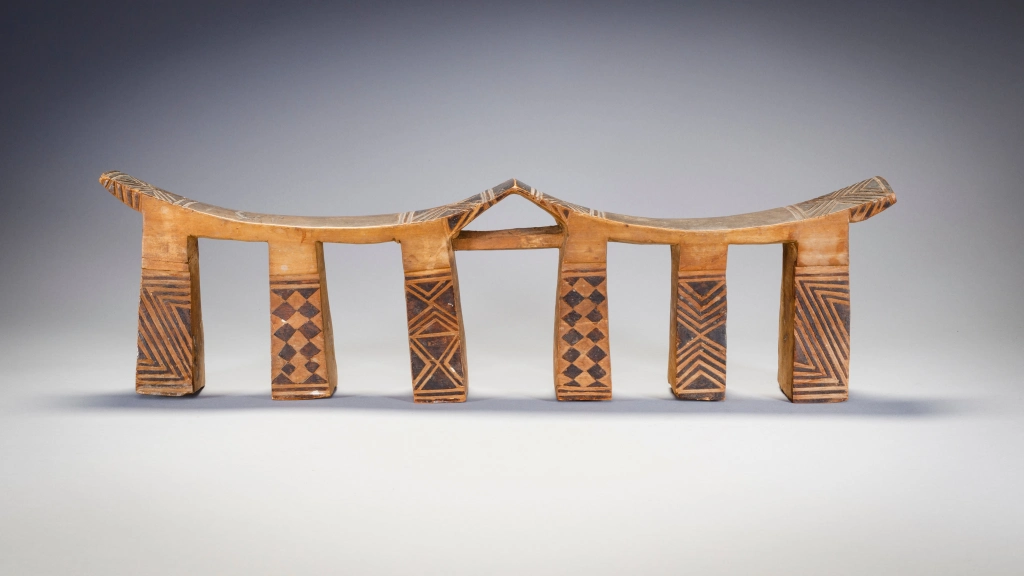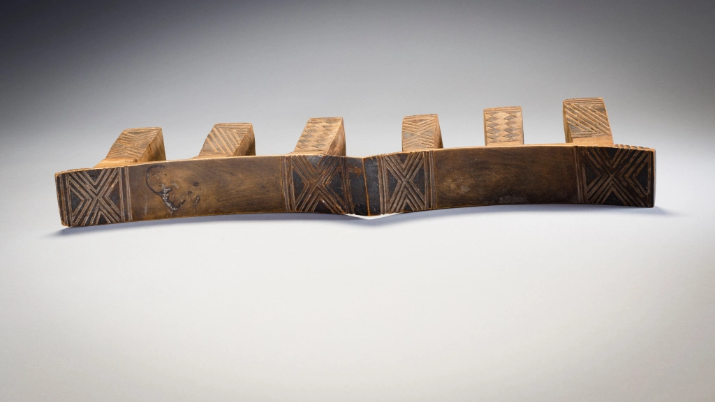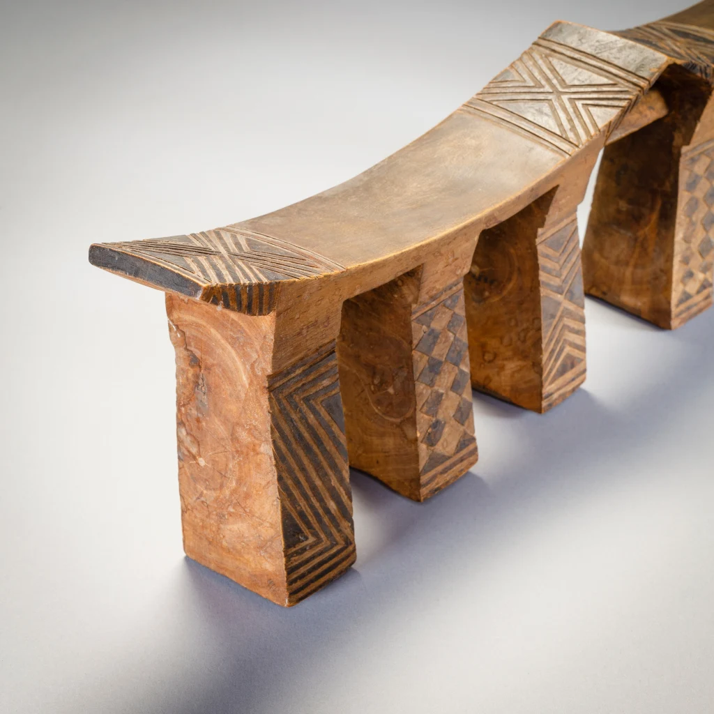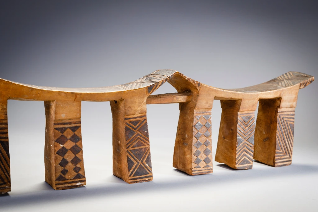 Un appui-tête à six pieds décorés de pyrogravures qui contrastent sur son bois clair. On mesure l’usure du temps aux pieds usagés et fendillés par le poids des deux têtes du couple qui a pu profiter de l’appui-tête pendant de longues années. Ces appuis-tête légers étaient conçus pour le voyage, les Ngunis étant parfois nomades ou bergers et amenés à se déplacer fréquemment.
