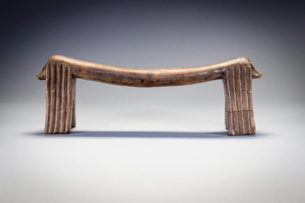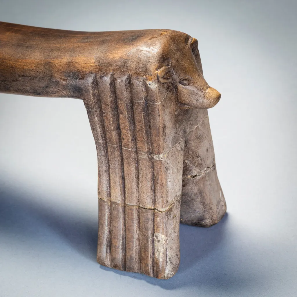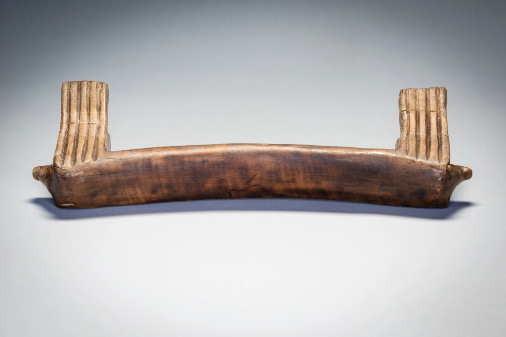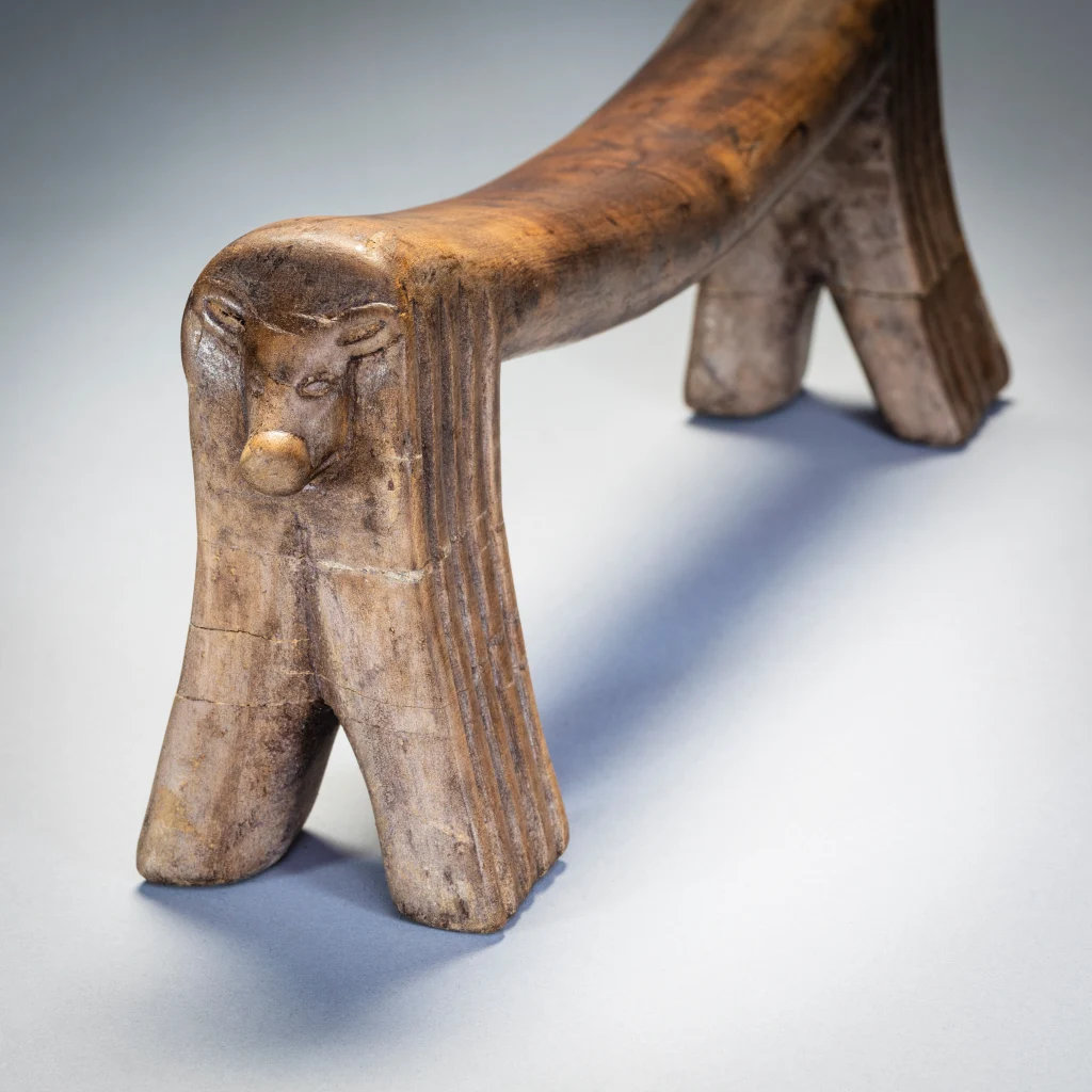 Un appui-tête tout simple avec des pieds cannelés dans le style swazi, mais une courbure typique des Ngunis. Le détail qui n’apparaît pas au premier coup d’œil est la présence d’une tête de vache miniaturisée et finement ciselée à chaque extrémité de la barre d’appui. Cette particularité n’a jamais été retrouvée sur d’autres pièces qu’elles soient zoulou, swazi ou nguni.