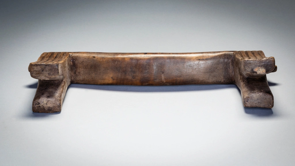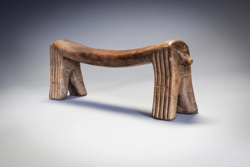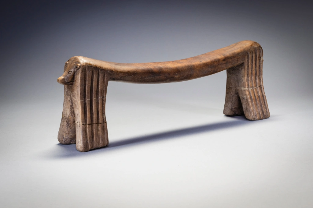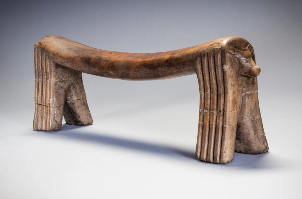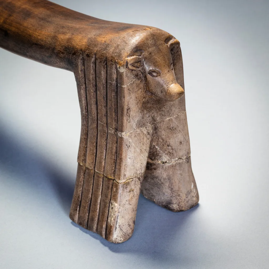 Un appui-tête tout simple avec des pieds cannelés dans le style swazi, mais une courbure typique des Ngunis. Le détail qui n’apparaît pas au premier coup d’œil est la présence d’une tête de vache miniaturisée et finement ciselée à chaque extrémité de la barre d’appui. Cette particularité n’a jamais été retrouvée sur d’autres pièces qu’elles soient zoulou, swazi ou nguni.