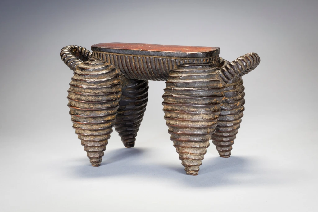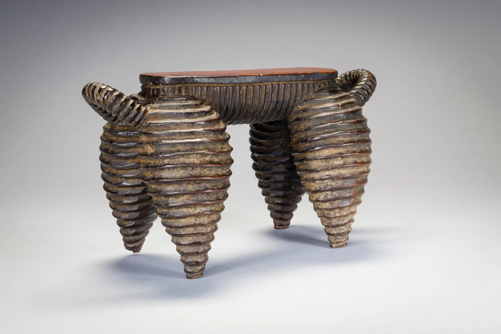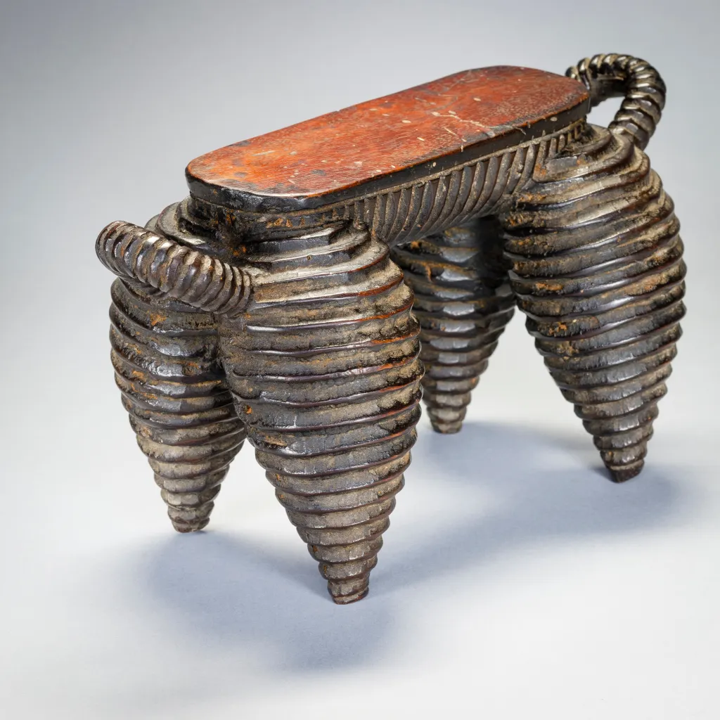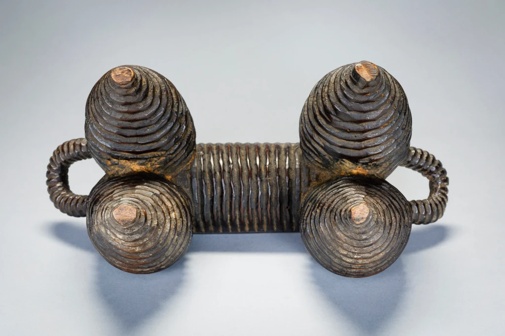 Une pièce exceptionnelle du Nord de Nguni. Elle a une surface striée comme les célèbres vaisselles de la région. Plus petite que N04, on remarque que la plateforme s’arrête à mi-pieds et non pas à l’extrémité des pieds. On peut également noter que ces pièces ont les pieds ventrus de façon parfaitement identiques et proviennent très certainement du même sculpteur. La célèbre pièce du MET Museum qui défrayait la chronique en 2018 est identique, mais légèrement plus ventrue et possède des anses qui remontent moins haut que N04 et N17. Elle provient probablement d’un sculpteur de la même école. Cette célèbre pièce a été achetée en mars 2018 pour plus de 70 000 EUR, un record !