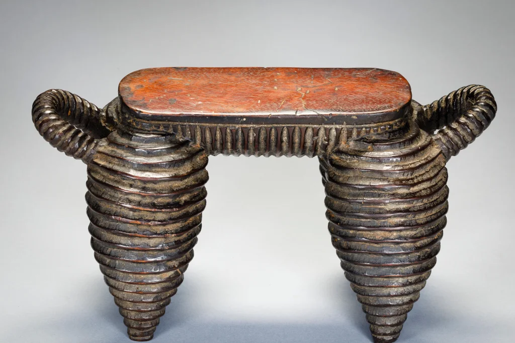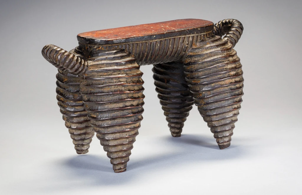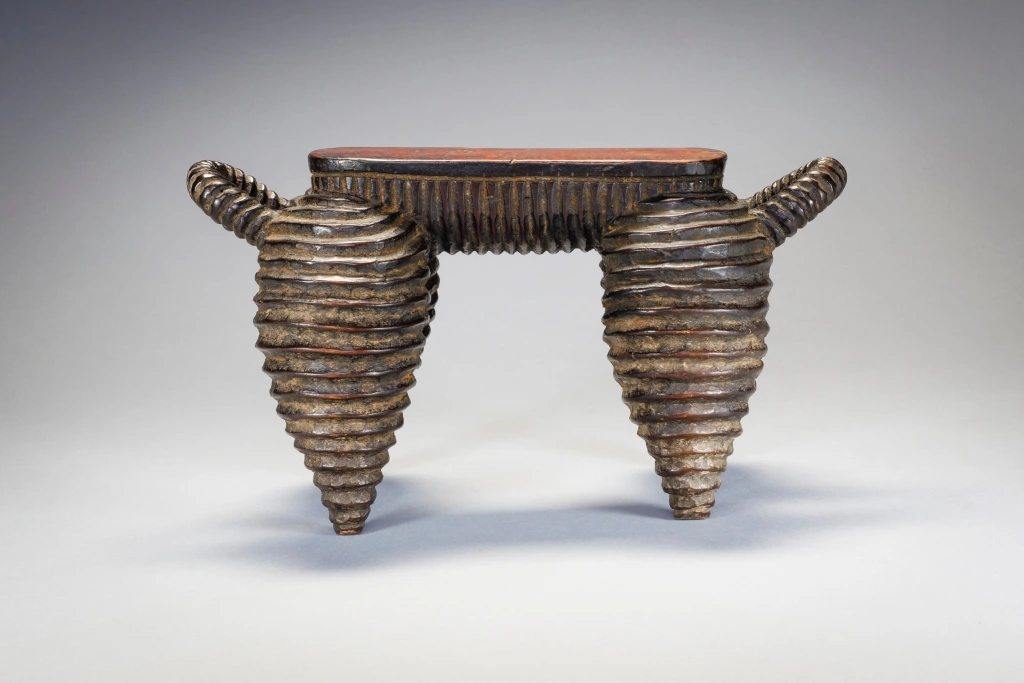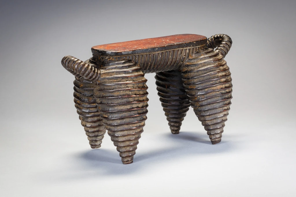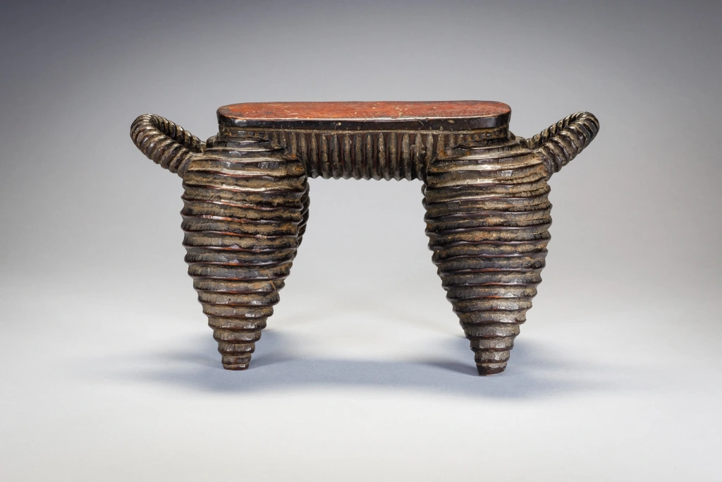 Une pièce exceptionnelle du Nord de Nguni. Elle a une surface striée comme les célèbres vaisselles de la région. Plus petite que N04, on remarque que la plateforme s’arrête à mi-pieds et non pas à l’extrémité des pieds. On peut également noter que ces pièces ont les pieds ventrus de façon parfaitement identiques et proviennent très certainement du même sculpteur. La célèbre pièce du MET Museum qui défrayait la chronique en 2018 est identique, mais légèrement plus ventrue et possède des anses qui remontent moins haut que N04 et N17. Elle provient probablement d’un sculpteur de la même école. Cette célèbre pièce a été achetée en mars 2018 pour plus de 70 000 EUR, un record !