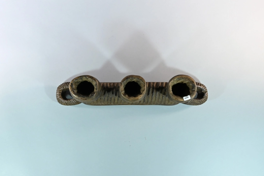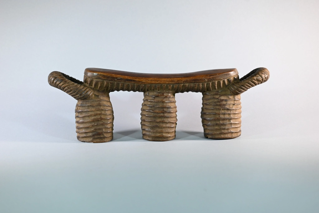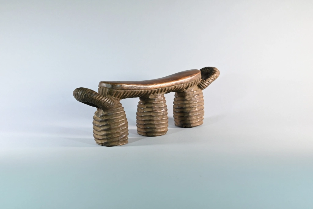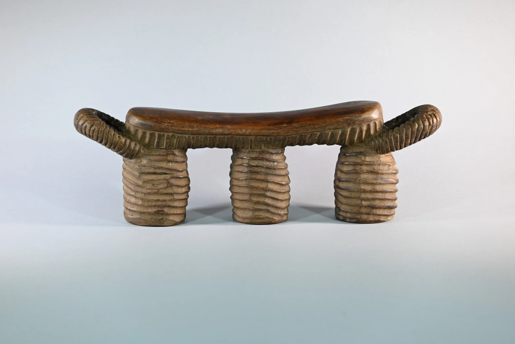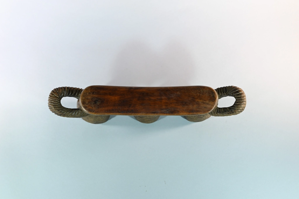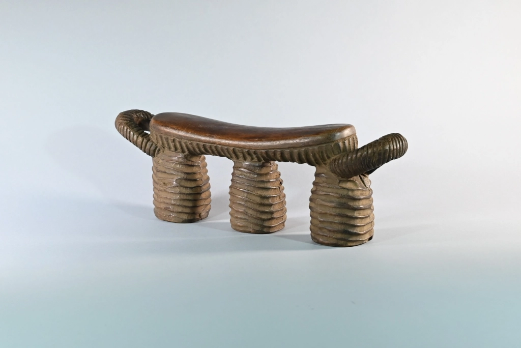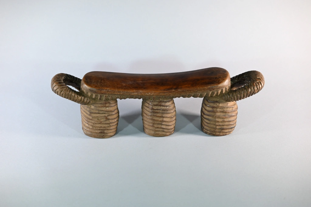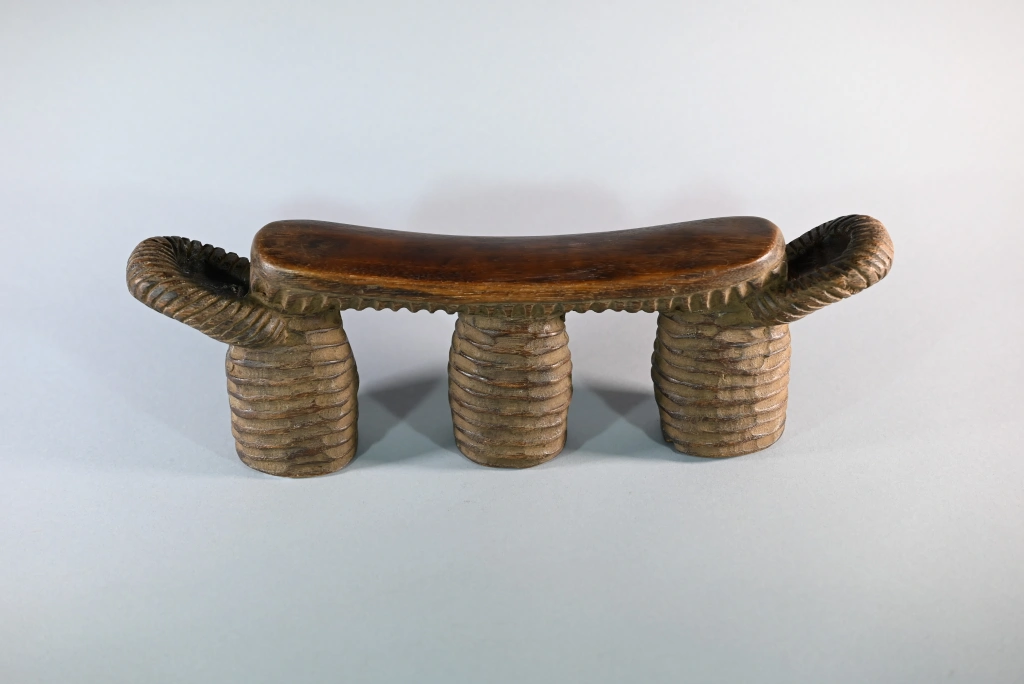 Un appuie-tête typique du style Nguni du Nord, reconnaissable à ses stries couvrant l’ensemble de ses trois jambes ainsi que la sous-face de la barre d’appui, laquelle se termine, comme souvent, par deux poignées saillantes. Sa particularité réside dans le creux de chaque pied, permettant à son propriétaire de protéger ses effets personnels durant son sommeil : argent, bijoux, tabac ou autres biens précieux. Taillé dans un bois particulièrement dur, il date très probablement de la fin du XIXᵉ siècle, bien que nous n’ayons pu identifier son sculpteur.