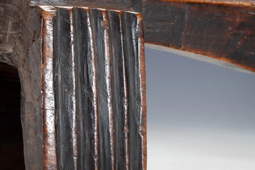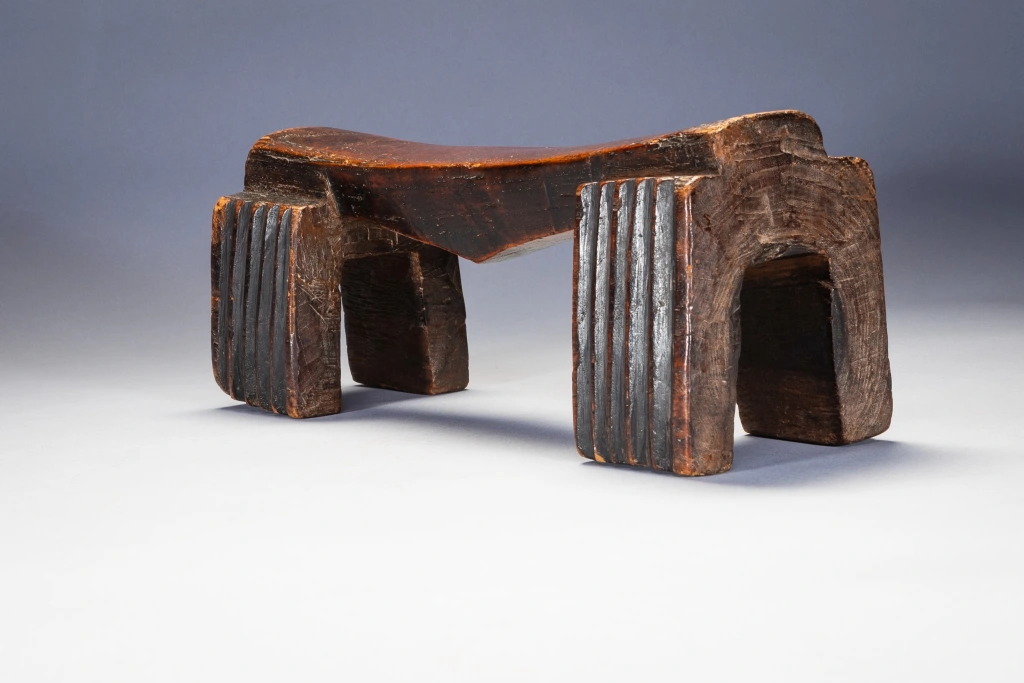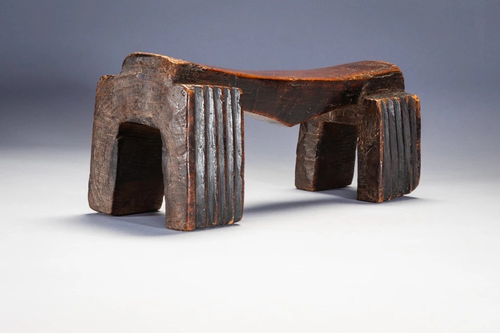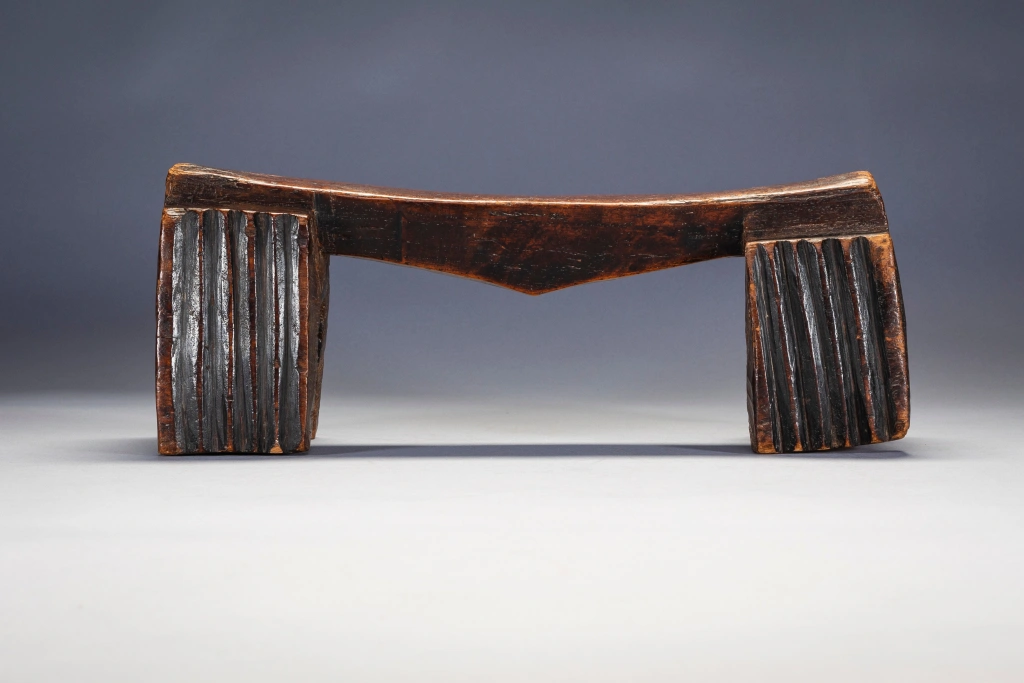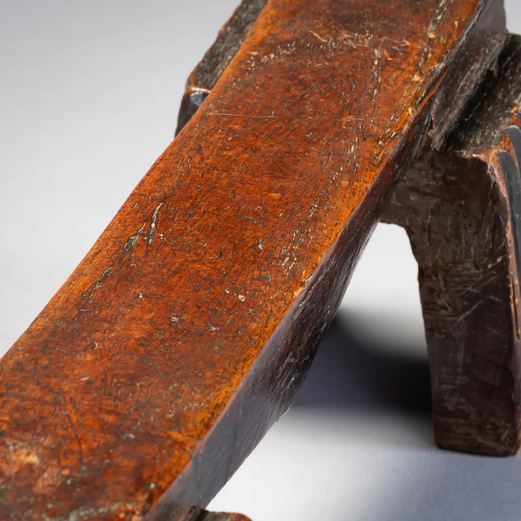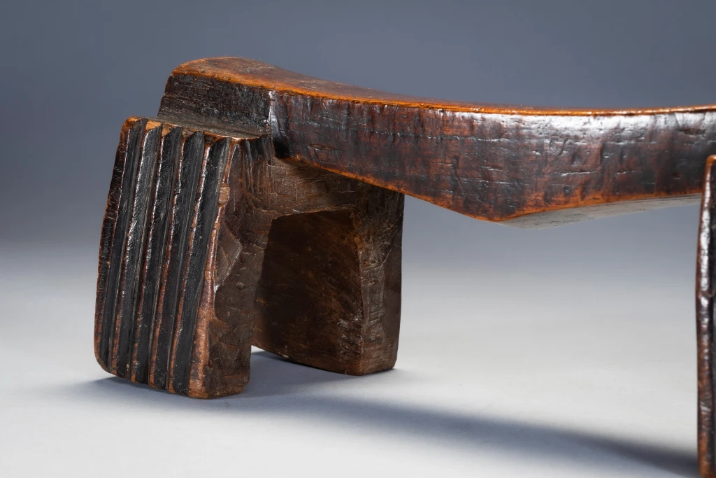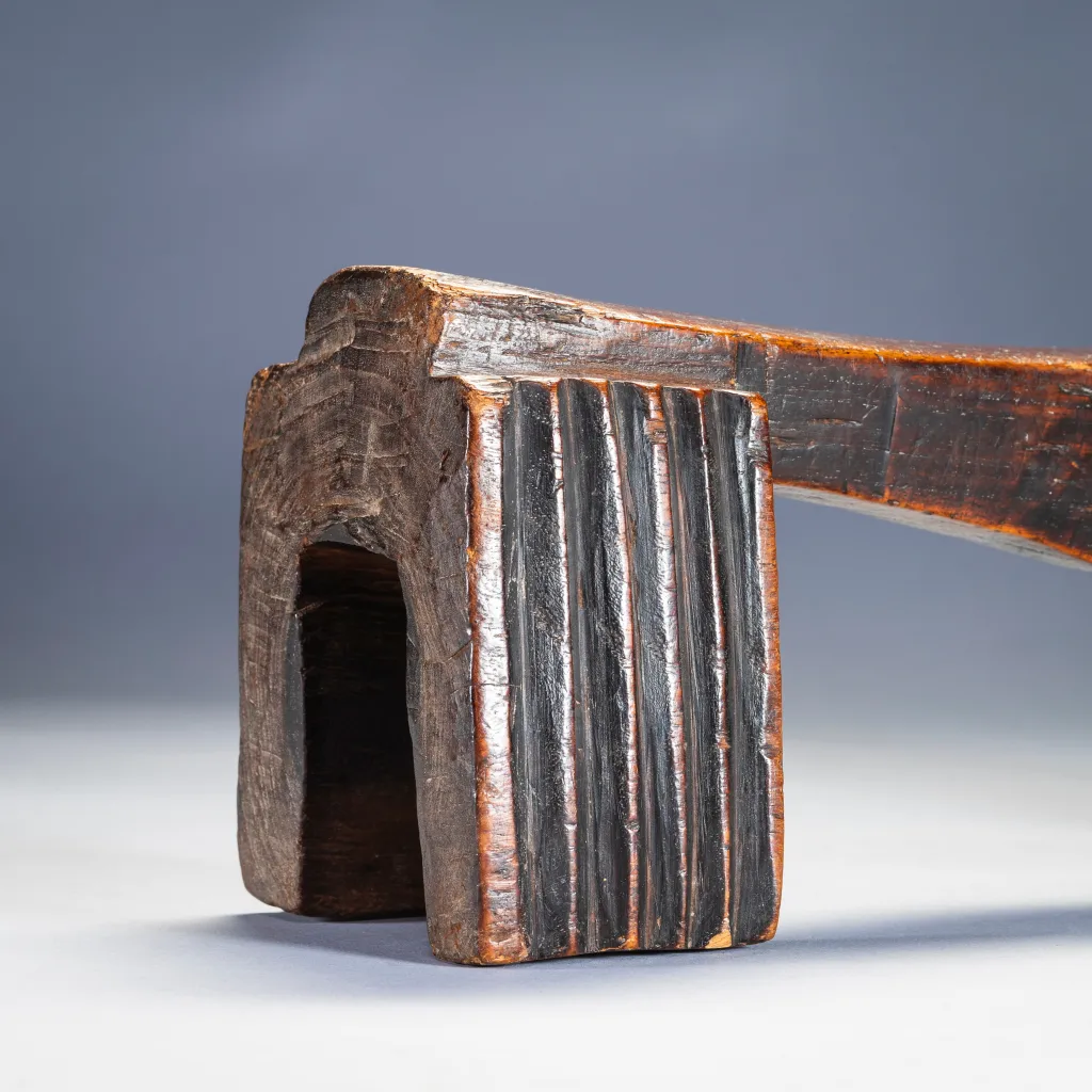 Un petit appui-tête épais avec des pieds carrés très espacés, décorés de cannelures verticales. La plate-forme de couchage incurvée repose sur ces derniers, s’enfonçant légèrement. Plutôt que d’avoir un « sibhono » distinct, sa partie inferieure s’amincit jusqu’à un point central. Cet appui-tête représente un cas intrigant de pollinisation stylistique croisée. Bien qu’il soit classiquement zoulou dans sa composition générale et sa présence, le détail central trouvé sur la face inférieure de son support horizontal ressemble davantage aux appuis-tête du Swaziland. Cela renforce la réalité des frontières fluides en Afrique australe, où les références des traditions artistiques d’une culture apparaissent souvent dans celles de leurs voisins.