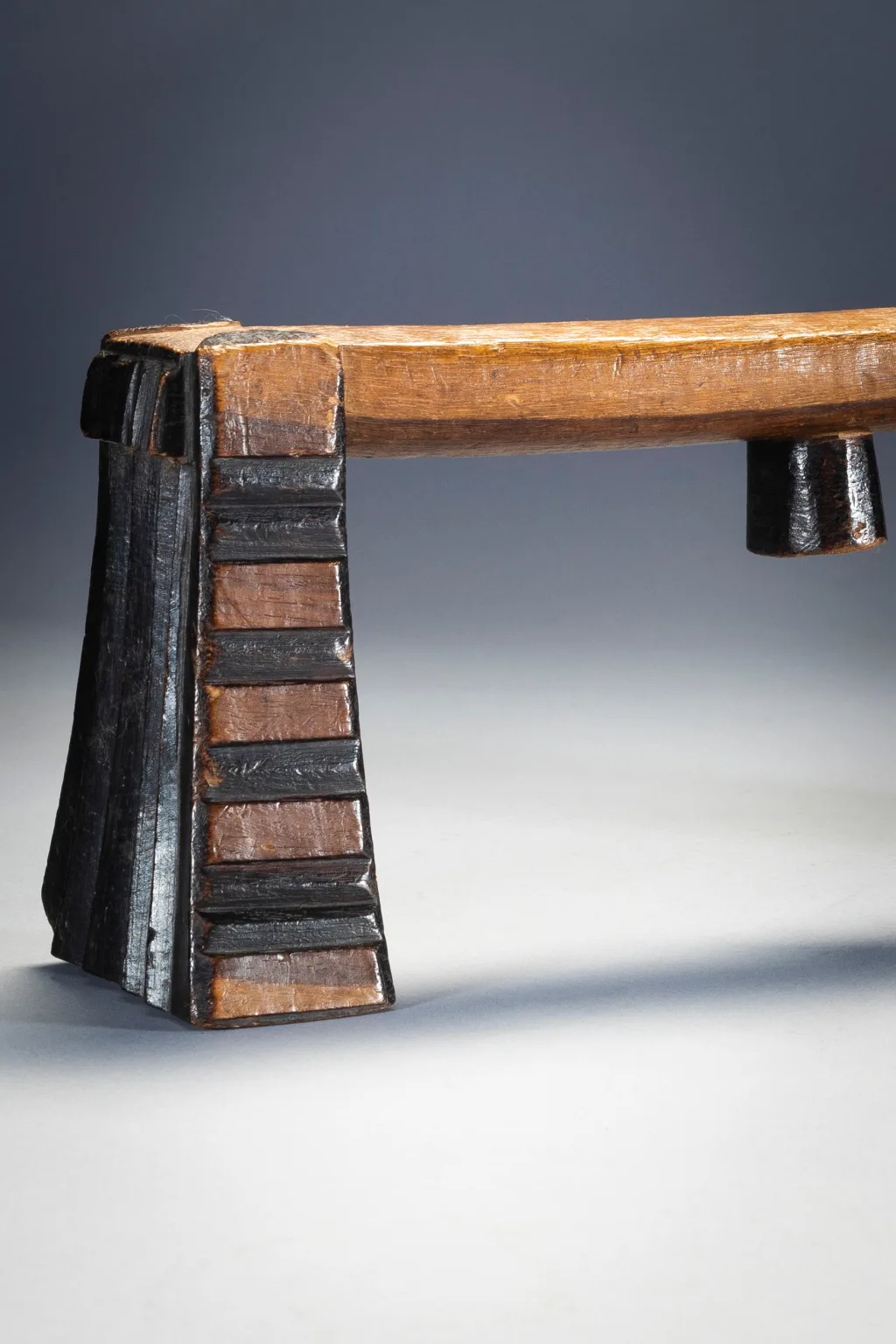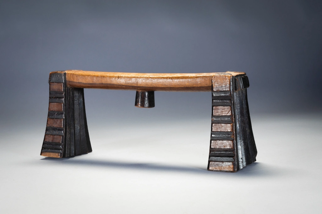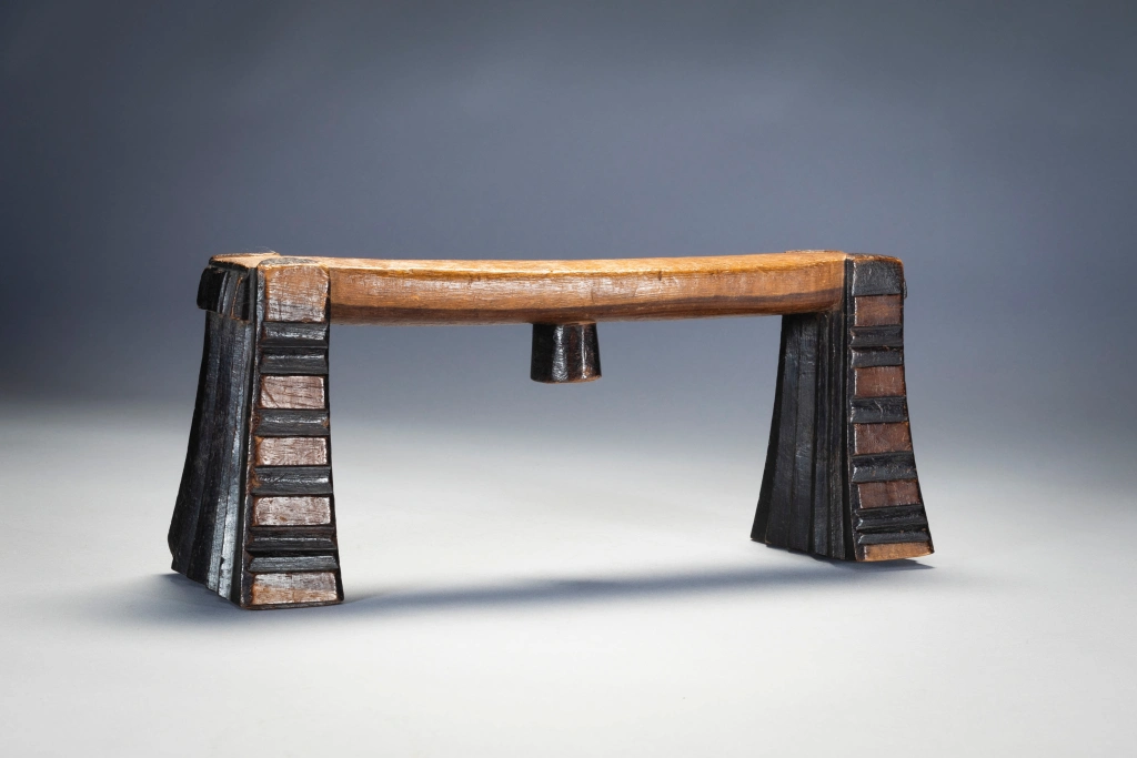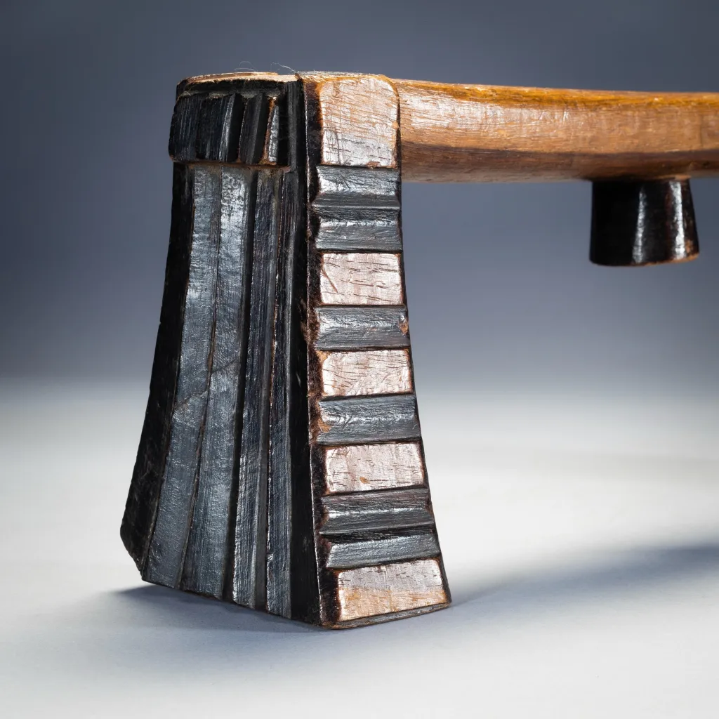Ses cannelures horizontales, sa forme ouverte et verticale et la façon dont la plate-forme de couchage est placée rendent immédiatement cet appui-tête reconnaissable comme Swazi. Joliment équilibré, il est l’œuvre d’un artisan créatif et compétent. La sculpture en creux est rehaussée par des pieds contenant une alternance de sections noircies et unies. Cet appui-tête a été collecté par Gordon Crawford l’auteur du célèbre livre sur l’art Swazi « Sicebile ».