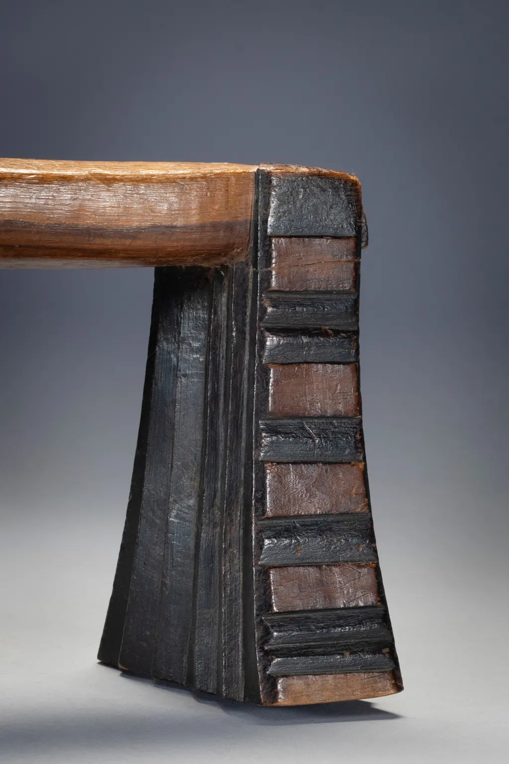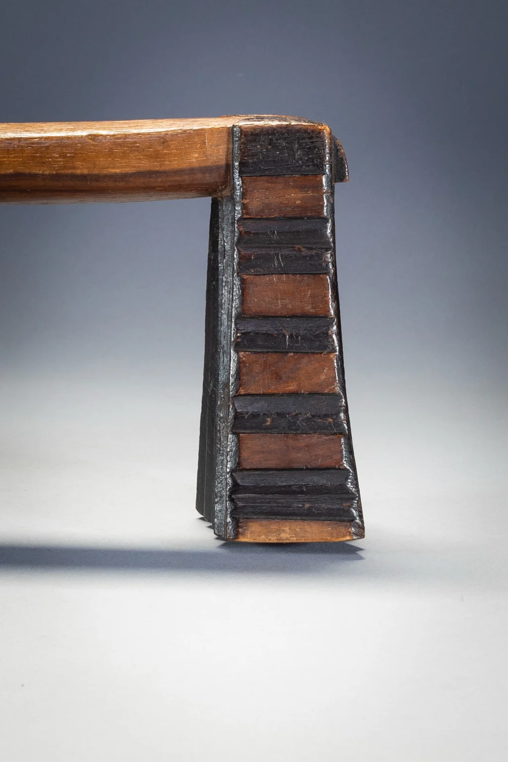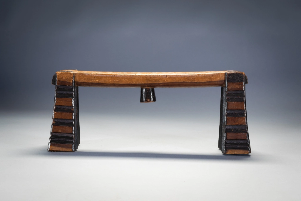 Ses cannelures horizontales, sa forme ouverte et verticale et la façon dont la plate-forme de couchage est placée rendent immédiatement cet appui-tête reconnaissable comme Swazi. Joliment équilibré, il est l’œuvre d’un artisan créatif et compétent. La sculpture en creux est rehaussée par des pieds contenant une alternance de sections noircies et unies. Cet appui-tête a été collecté par Gordon Crawford l’auteur du célèbre livre sur l’art Swazi « Sicebile ».