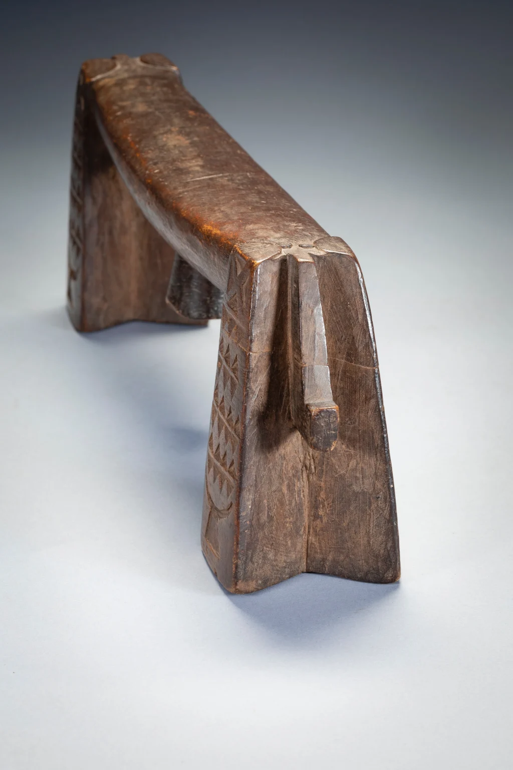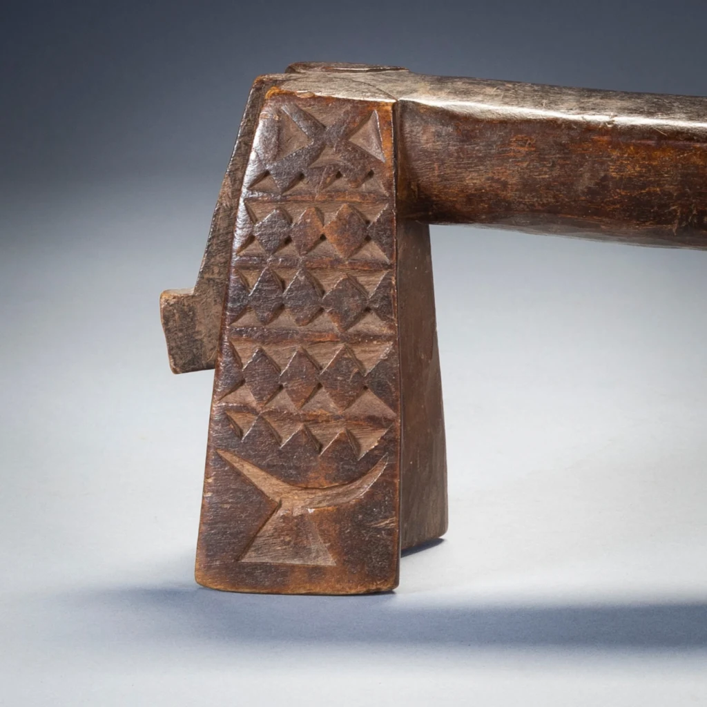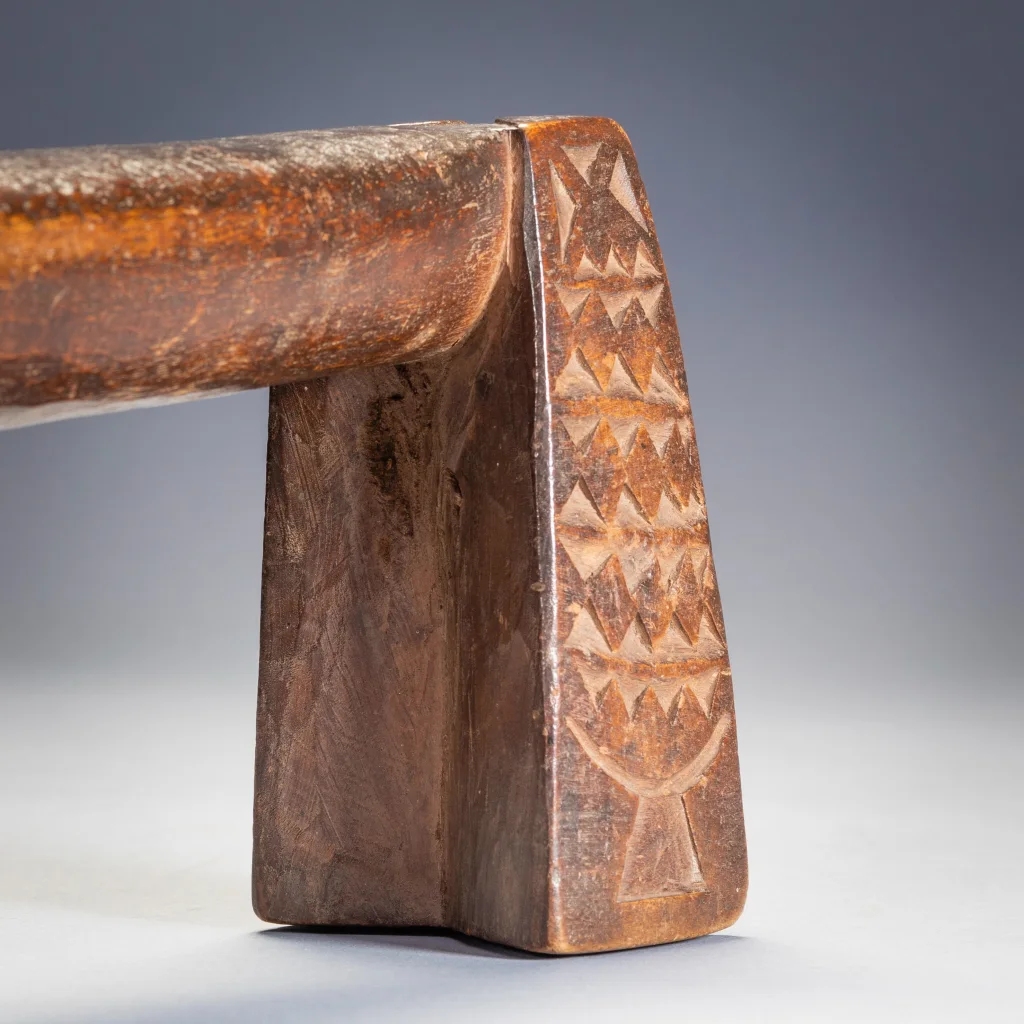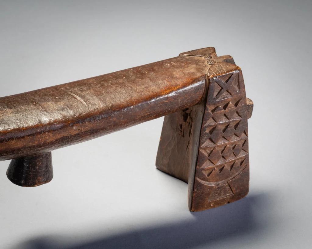 C’est une paire de petits « sicamelo » ayant probablement appartenu à l’origine à un mari et à sa femme. Presque identiques, ils sont l’œuvre du même sculpteur et présentent des extensions de barres transversales abaissées qui représenteraient des queues ou des têtes de bétail. Leur forme swazie précoce suggère qu’ils datent probablement du XIXe siècle, mais ils ont été collectés en 2006 par Tjeerd Flentge à Mpopu, près de Tshaneni, dans le nord de l’Eswatini. Sculptés dans un bois léger et patinés par un usage prolongé, ces appuis-tête sont dans un état remarquable, si l’on considère qu’ils ont plus de cent ans. On ne sait rien de leur histoire, mais ils étaient manifestement très appréciés par leurs propriétaires, peut-être en tant que reliques ancestrales, et bien entretenus. D’après l’expérience de Goodall en matière de collecte sur le terrain, il imagine que ces appuis-tête ont probablement été enveloppés dans du tissu et rangés dans un coffre appartenant à la matriarche de la ferme.Les jambes sont recouvertes de motifs détaillés de triangles. Des décorations aussi fines sont rarement présentes sur les appuie-tête swazis, probablement parce qu’il est difficile de les sculpter dans des bois plus durs. De tels motifs sont incisés sur des appuie-tête zoulous en bois tendre de figuier sauvage, et c’est d’ailleurs dans ce bois que sont fabriqués ces appuie-tête. Les motifs stylisés de l’appui-tête au bas de chaque pied sont encore plus inhabituels que les autres décorations. Bien qu’ils semblent avoir la forme d’appuis-tête d’Afrique de l’Est, ces motifs s’inspirent plus vraisemblablement des appuis-tête des îles Tonga voisines. Le bois utilisé est très léger – il provient du figuier sauvage. D’après mon expérience, les appuis-tête de ce style sont souvent fabriqués en bois léger. J’en possède deux d’un style similaire à celui-ci et tous deux sont également faits d’un bois très léger et faible. Je crois que nous, collectionneurs, aimons les bois durs et lourds, mais parfois les sculpteurs africains aiment utiliser des bois plus légers. D’après mon expérience, il s’agit d’un style plus ancien que les Swazis ont cessé de fabriquer vers 1930. Il est donc probable qu’il soit un peu plus ancien que cela. J’ai la chance de l’avoir encore en bon état. Si vous observez les appuis-tête Ngoni, vous constaterez que certains d’entre eux présentent des caractéristiques similaires aux « queues » à l’extrémité de celui-ci. Les Ngoni ont quitté le Swaziland vers 1840. C’est ce qui explique les caractéristiques similaires.