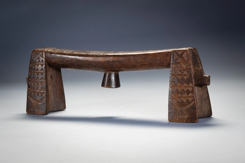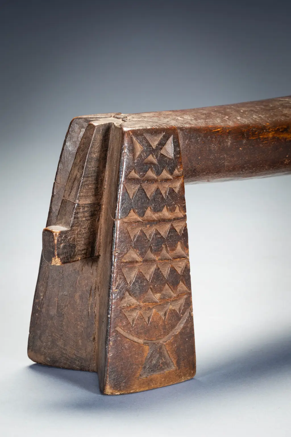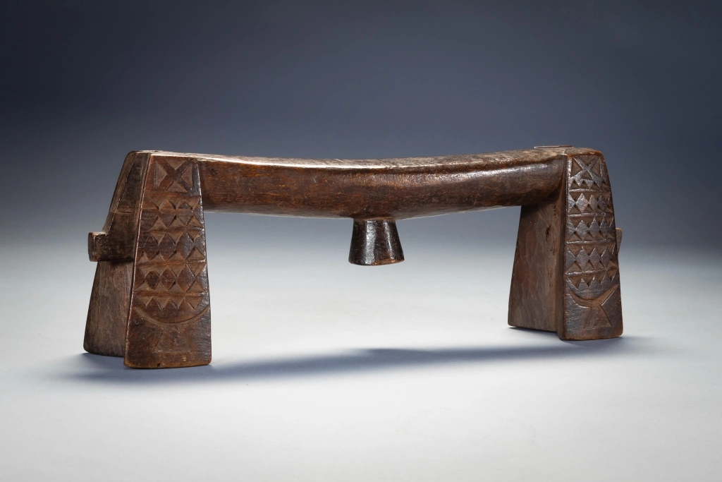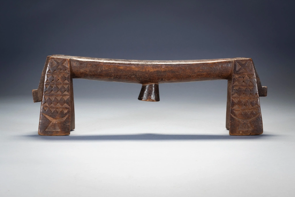 C’est une paire de petits « sicamelo » ayant probablement appartenu à l’origine à un mari et à sa femme. Presque identiques, ils sont l’œuvre du même sculpteur et présentent des extensions de barres transversales abaissées qui représenteraient des queues ou des têtes de bétail. Leur forme swazie précoce suggère qu’ils datent probablement du XIXe siècle, mais ils ont été collectés en 2006 par Tjeerd Flentge à Mpopu, près de Tshaneni, dans le nord de l’Eswatini. Sculptés dans un bois léger et patinés par un usage prolongé, ces appuis-tête sont dans un état remarquable, si l’on considère qu’ils ont plus de cent ans. On ne sait rien de leur histoire, mais ils étaient manifestement très appréciés par leurs propriétaires, peut-être en tant que reliques ancestrales, et bien entretenus. D’après l’expérience de Goodall en matière de collecte sur le terrain, il imagine que ces appuis-tête ont probablement été enveloppés dans du tissu et rangés dans un coffre appartenant à la matriarche de la ferme.Les jambes sont recouvertes de motifs détaillés de triangles. Des décorations aussi fines sont rarement présentes sur les appuie-tête swazis, probablement parce qu’il est difficile de les sculpter dans des bois plus durs. De tels motifs sont incisés sur des appuie-tête zoulous en bois tendre de figuier sauvage, et c’est d’ailleurs dans ce bois que sont fabriqués ces appuie-tête. Les motifs stylisés de l’appui-tête au bas de chaque pied sont encore plus inhabituels que les autres décorations. Bien qu’ils semblent avoir la forme d’appuis-tête d’Afrique de l’Est, ces motifs s’inspirent plus vraisemblablement des appuis-tête des îles Tonga voisines. Le bois utilisé est très léger – il provient du figuier sauvage. D’après mon expérience, les appuis-tête de ce style sont souvent fabriqués en bois léger. J’en possède deux d’un style similaire à celui-ci et tous deux sont également faits d’un bois très léger et faible. Je crois que nous, collectionneurs, aimons les bois durs et lourds, mais parfois les sculpteurs africains aiment utiliser des bois plus légers. D’après mon expérience, il s’agit d’un style plus ancien que les Swazis ont cessé de fabriquer vers 1930. Il est donc probable qu’il soit un peu plus ancien que cela. J’ai la chance de l’avoir encore en bon état. Si vous observez les appuis-tête Ngoni, vous constaterez que certains d’entre eux présentent des caractéristiques similaires aux « queues » à l’extrémité de celui-ci. Les Ngoni ont quitté le Swaziland vers 1840. C’est ce qui explique les caractéristiques similaires.