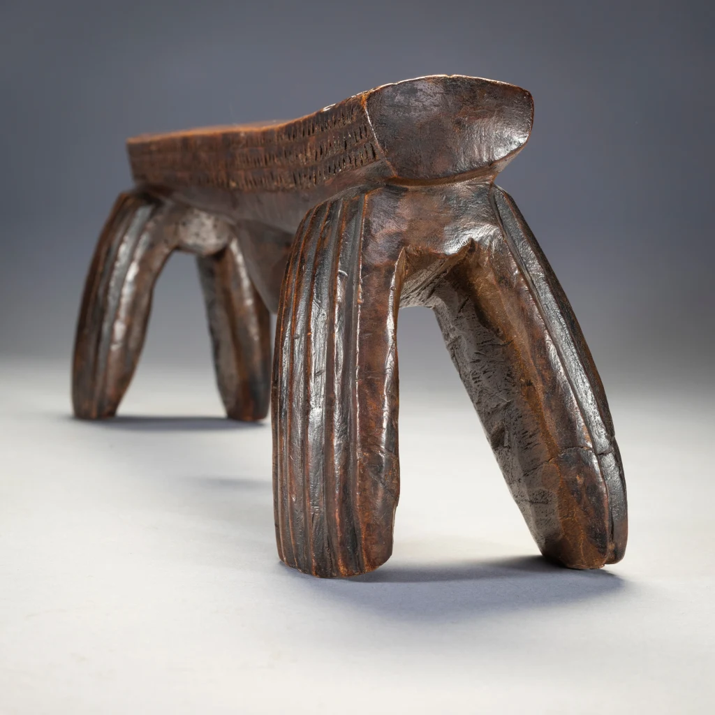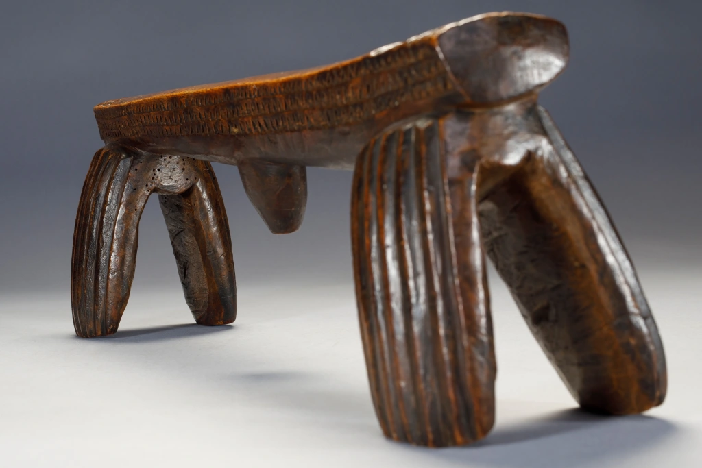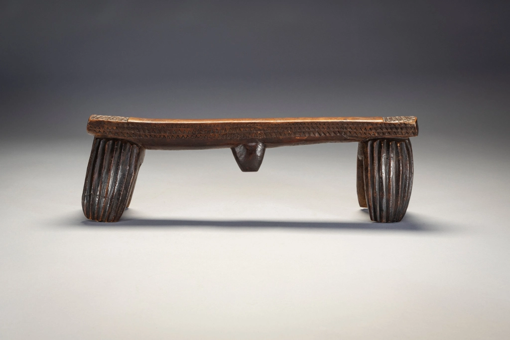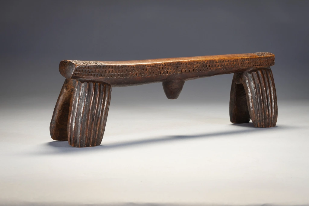 Selon Gordon Crowford en 2014 : »Ils n’apparaissent pas très souvent. Beaucoup de gens ne réalisent pas que le type ngoni d’appui-tête à quatre pieds était, autrefois, vers les années 1820, le type d’appui-tête le plus courant au Swaziland. Ces modèles étaient souvent ornés d’une « trompe d’éléphant ».Les Ngoni sont originaires du Swaziland et ceux de sang swazi ont conservé ce style ancien. D’autres peuples ont été absorbés par les Ngoni, mais ont conservé leurs propres styles d’appui-tête, c’est pour cette raison que l’on retrouve des appuis-tête de type Shona qui ont été collectés auprès des Ngoni. Les Swazis restés au Swaziland ont lentement modifié leur style d’appui-tête en fusionnant les quatre pieds souvent arrondis comme ceux qui sont aujourd’hui associés à certains appuis-tête zoulous en deux pieds. »Les styles ont évolué et il semble qu’il y ait eu un changement en faveur de la simplicité. Plus faciles à sculpter et plus robustes, les quatre pieds ronds ont commencé à se toucher, créant une forme de huit si l’appui-tête était retourné. Cette forme composite aurait pu ensuite se transformer en un seul pied de chaque côté, prenant le profil rectangulaire que l’on connaît aujourd’hui. Une fois cette forme à deux pieds établie, certains facteurs ont conduit à sa conservation. Crawford a suggéré qu’en raison de l’insécurité politique, les groupes swazis, lorsqu’ils migraient et se retrouvaient dans des lieux étrangers, essayaient activement de maintenir leur identité culturelle. Cette impulsion conservatrice a peut-être conduit à étouffer des nouvelles innovations dans les styles d’appui-tête. Une fois établis au Swaziland, l’absence d’influence extérieure peut également avoir conduit les sculpteurs swazis à être extrêmement conservateurs à cet égard.Cet appui-tête swazi est important, car il s’agit de l’un des deux seuls exemples avec S002 du type à quatre pieds mentionné ci-dessus. L’aspect général et les cannelures des pieds sont plutôt grossiers et asymétriques, tandis que les décorations triangulaires détaillées le long des côtés et sur le dessus des extrémités de la plate-forme sont, de manière surprenante, beaucoup plus finement réalisées. On pourrait même supposer que l’appui-tête a été fabriqué à la hâte.