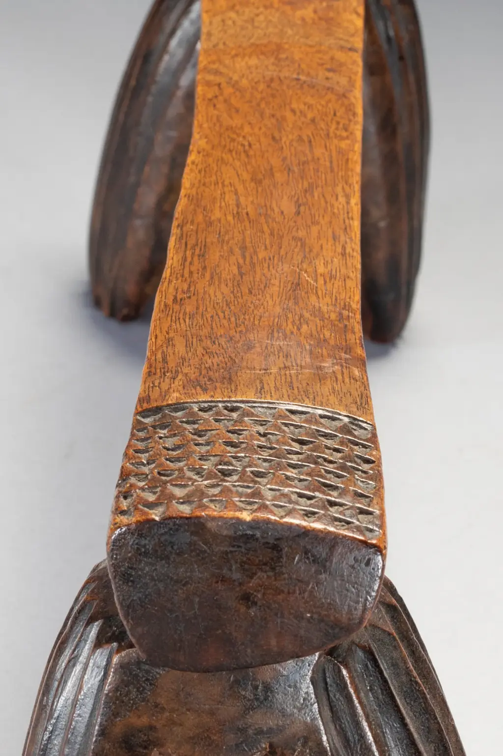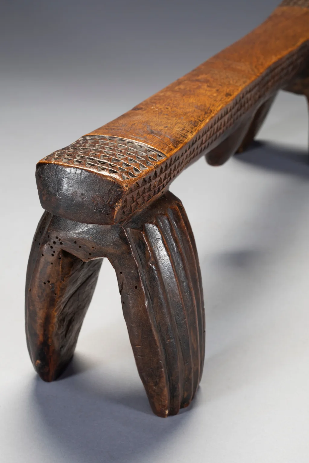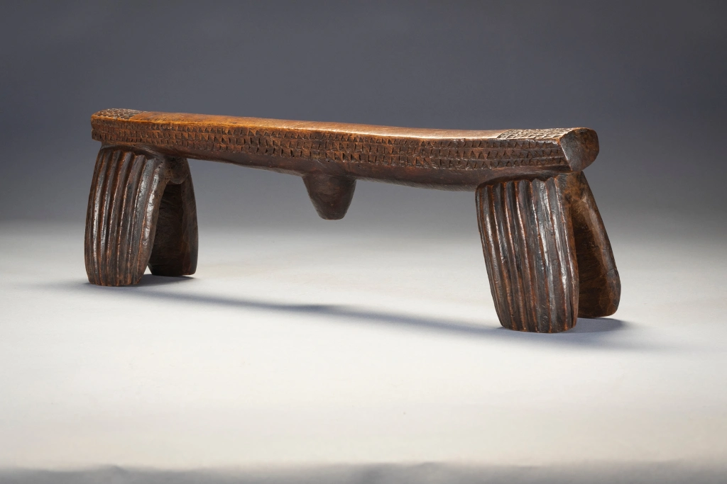 Selon Gordon Crowford en 2014 : »Ils n’apparaissent pas très souvent. Beaucoup de gens ne réalisent pas que le type ngoni d’appui-tête à quatre pieds était, autrefois, vers les années 1820, le type d’appui-tête le plus courant au Swaziland. Ces modèles étaient souvent ornés d’une « trompe d’éléphant ».Les Ngoni sont originaires du Swaziland et ceux de sang swazi ont conservé ce style ancien. D’autres peuples ont été absorbés par les Ngoni, mais ont conservé leurs propres styles d’appui-tête, c’est pour cette raison que l’on retrouve des appuis-tête de type Shona qui ont été collectés auprès des Ngoni. Les Swazis restés au Swaziland ont lentement modifié leur style d’appui-tête en fusionnant les quatre pieds souvent arrondis comme ceux qui sont aujourd’hui associés à certains appuis-tête zoulous en deux pieds. »Les styles ont évolué et il semble qu’il y ait eu un changement en faveur de la simplicité. Plus faciles à sculpter et plus robustes, les quatre pieds ronds ont commencé à se toucher, créant une forme de huit si l’appui-tête était retourné. Cette forme composite aurait pu ensuite se transformer en un seul pied de chaque côté, prenant le profil rectangulaire que l’on connaît aujourd’hui. Une fois cette forme à deux pieds établie, certains facteurs ont conduit à sa conservation. Crawford a suggéré qu’en raison de l’insécurité politique, les groupes swazis, lorsqu’ils migraient et se retrouvaient dans des lieux étrangers, essayaient activement de maintenir leur identité culturelle. Cette impulsion conservatrice a peut-être conduit à étouffer des nouvelles innovations dans les styles d’appui-tête. Une fois établis au Swaziland, l’absence d’influence extérieure peut également avoir conduit les sculpteurs swazis à être extrêmement conservateurs à cet égard.Cet appui-tête swazi est important, car il s’agit de l’un des deux seuls exemples avec S002 du type à quatre pieds mentionné ci-dessus. L’aspect général et les cannelures des pieds sont plutôt grossiers et asymétriques, tandis que les décorations triangulaires détaillées le long des côtés et sur le dessus des extrémités de la plate-forme sont, de manière surprenante, beaucoup plus finement réalisées. On pourrait même supposer que l’appui-tête a été fabriqué à la hâte.