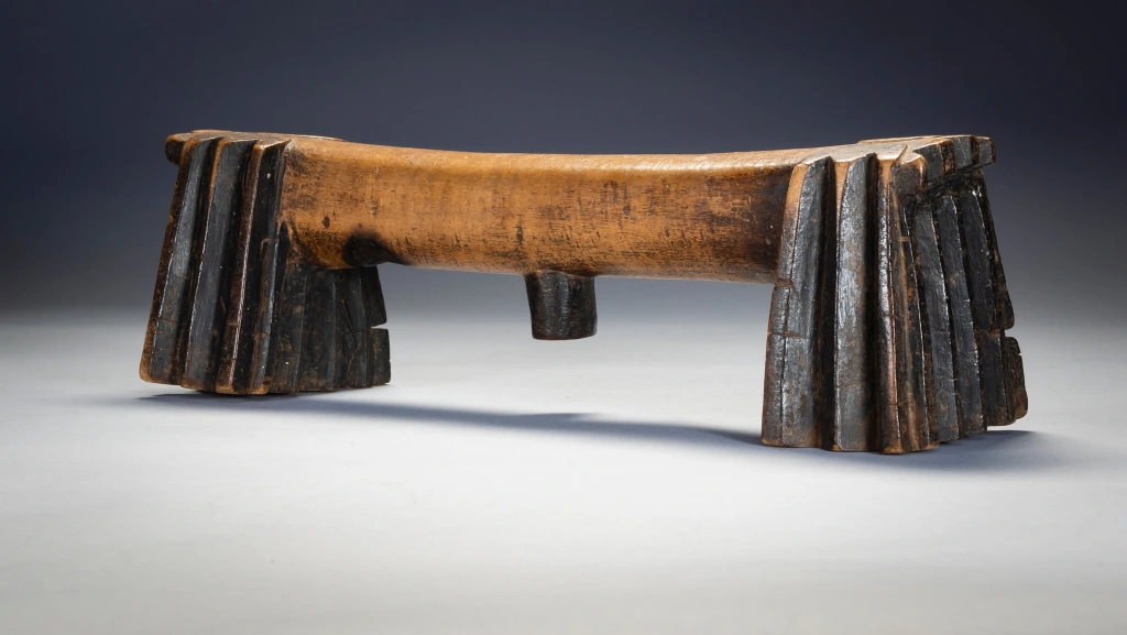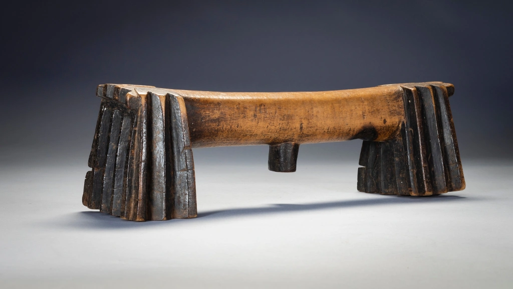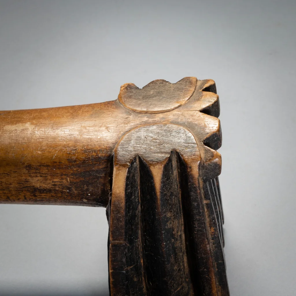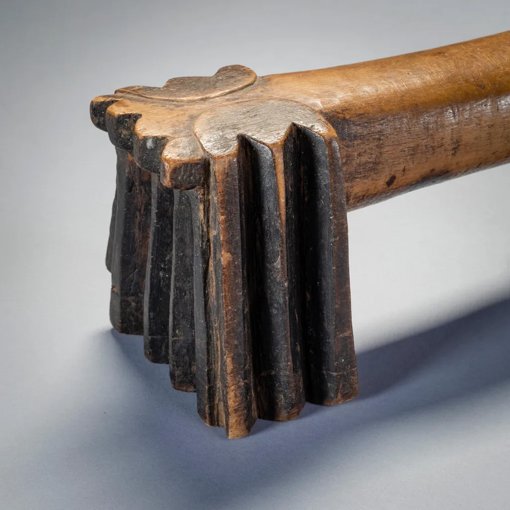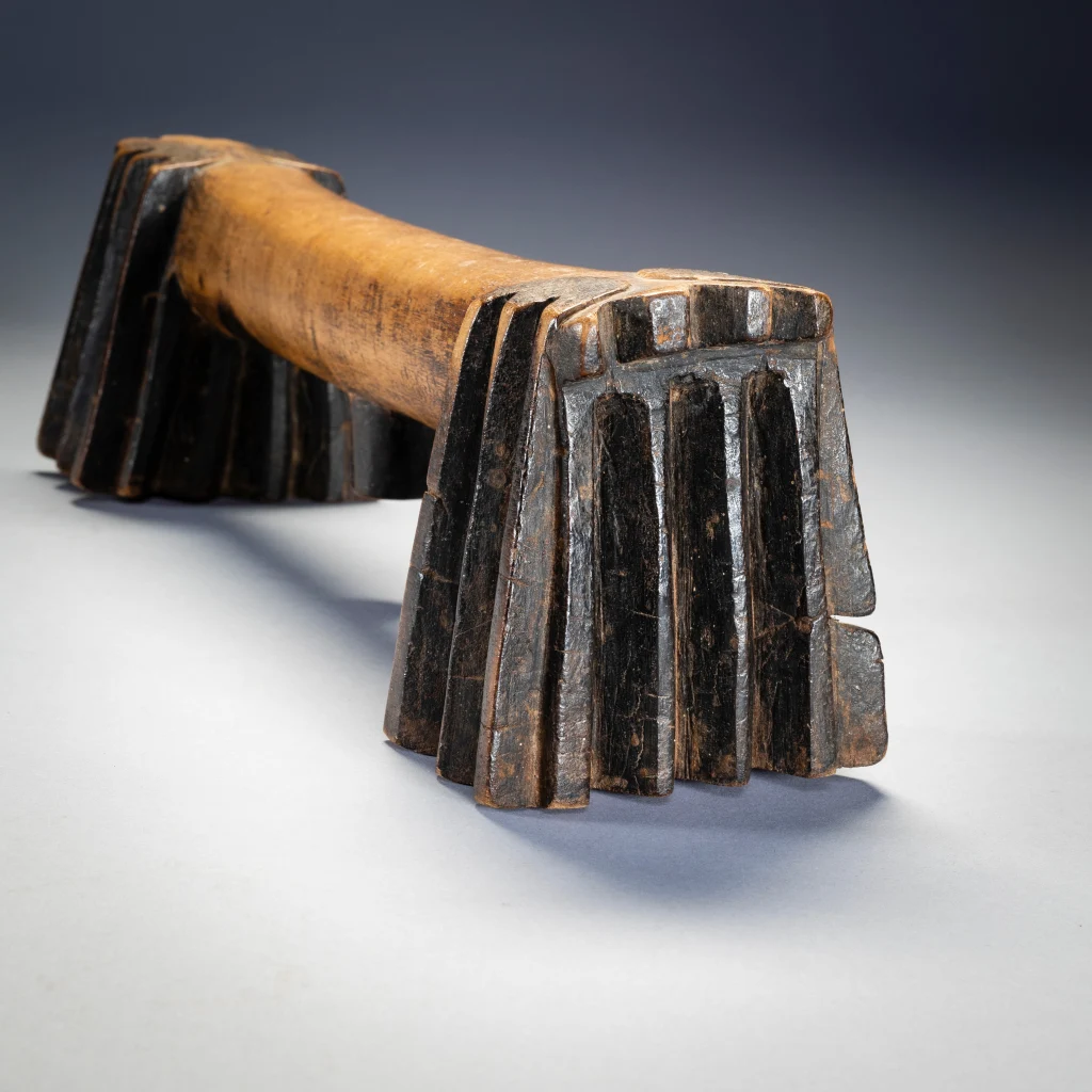 La plate-forme arrondie inhabituellement épaisse et les pattes courtes, profondément cannelées sur tous les côtés, donnent à ce sicamelo une présence trapue. Sa plate-forme s’enfonce dans les pieds, mais en ressort sous la forme d’une fine extension à quatre boutons, évoquant les cornes d’un taureau massif.Bien utilisé, cet appui-tête présente une patine et d’autres signes indiquant qu’il a vécu dans une hutte de Swazi. Une marque de brûlure ronde sous la plate-forme a probablement été causée par une bougie. Les appuis-tête servaient fréquemment le soir de bougeoir avant d’aller dormir. La cire chaude qui coulait sur le bois chauffait l’appui-tête le temps de s’endormir lors des nuit fraiches.