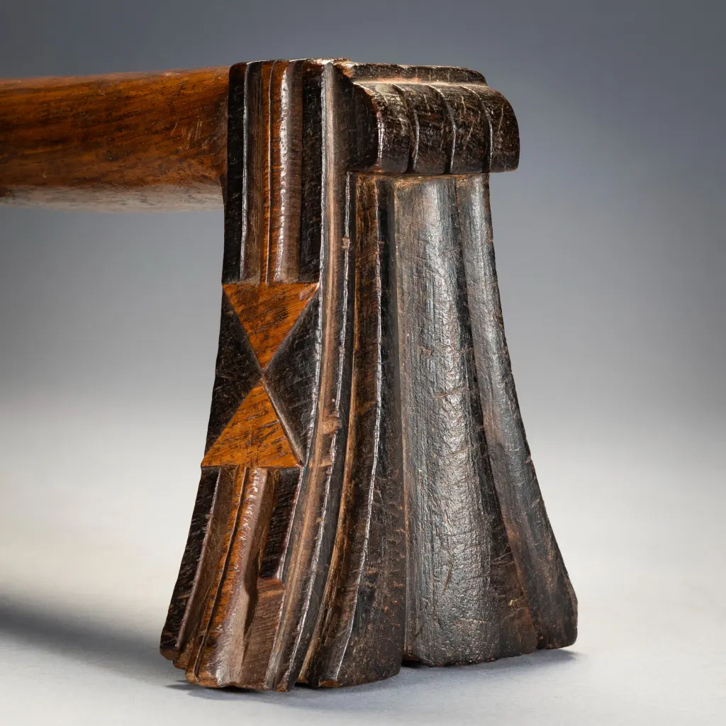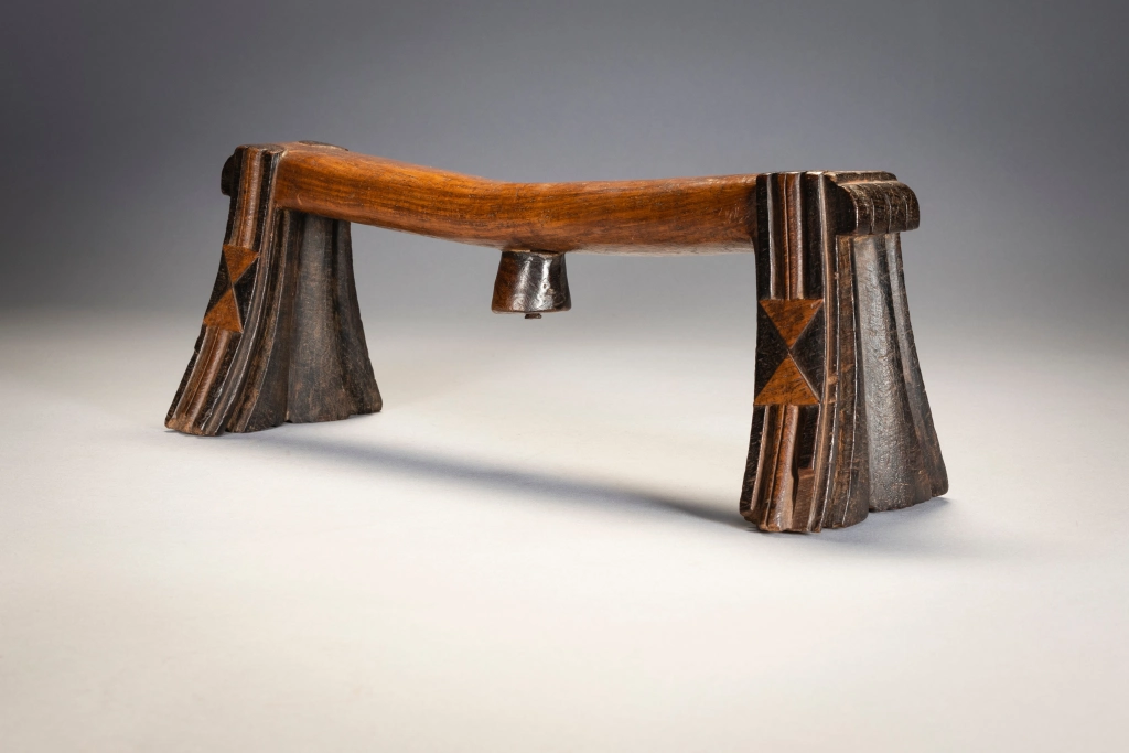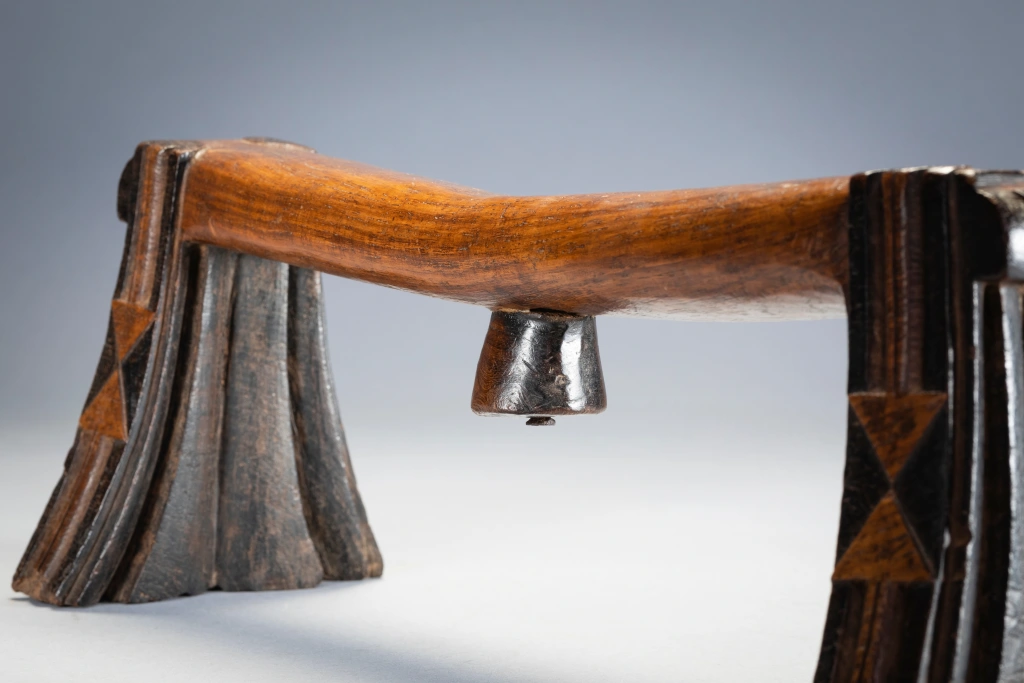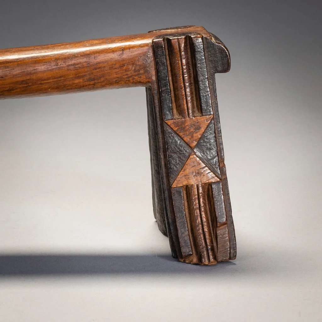 Ce célèbre appui-tête swazi appartenait au mari d’un couple âgé de la région de Nkamanzi (Eswatini), sous la direction du chef Gija Dlamini. Les pieds sont évasés et présentent des cannelures stylisées inhabituelles sur les côtés intérieurs et extérieurs. Comme les plis d’une jupe, ces cannelures semblent être suspendues aux larges extensions de la barre transversale, avec un ensemble de plis très larges au milieu de la cale, puis des plis plus étroits vers l’extérieur. Cet appui-tête a appartenu au mari, Sipane Hlawe. Il s’agit d’une pièce remarquable avec sa plate-forme incurvée et ses motifs triangulaires bicolores bissectant sur le côté des pieds. Il a été sculpte dans le bois de Kiaat, un arbre dur au bois rougé de la région.