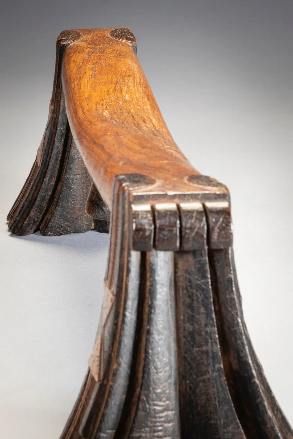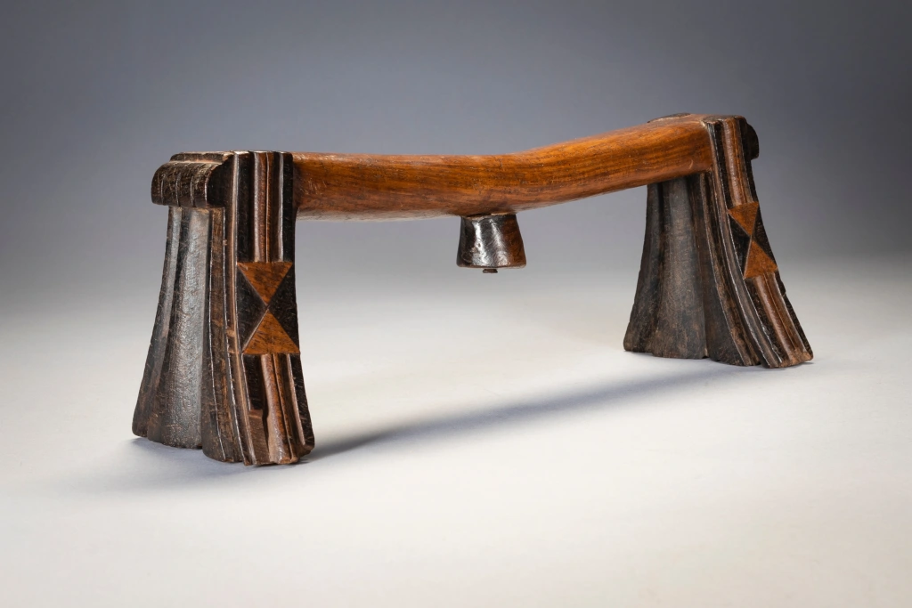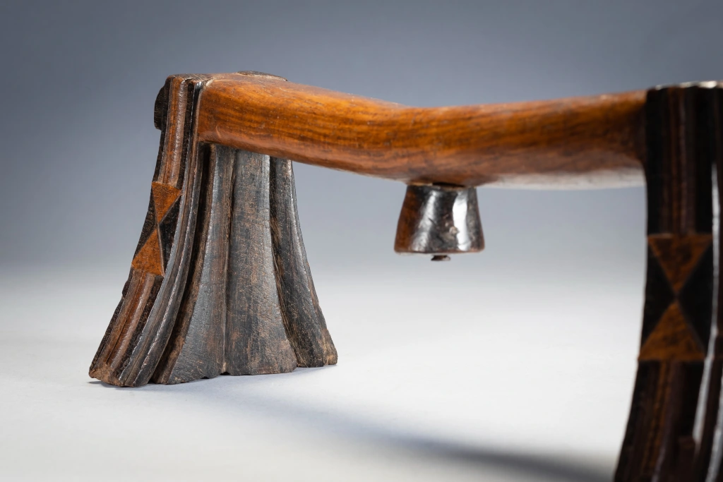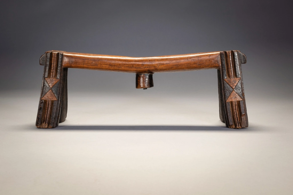 Ce célèbre appui-tête swazi appartenait au mari d’un couple âgé de la région de Nkamanzi (Eswatini), sous la direction du chef Gija Dlamini. Les pieds sont évasés et présentent des cannelures stylisées inhabituelles sur les côtés intérieurs et extérieurs. Comme les plis d’une jupe, ces cannelures semblent être suspendues aux larges extensions de la barre transversale, avec un ensemble de plis très larges au milieu de la cale, puis des plis plus étroits vers l’extérieur. Cet appui-tête a appartenu au mari, Sipane Hlawe. Il s’agit d’une pièce remarquable avec sa plate-forme incurvée et ses motifs triangulaires bicolores bissectant sur le côté des pieds. Il a été sculpte dans le bois de Kiaat, un arbre dur au bois rougé de la région.