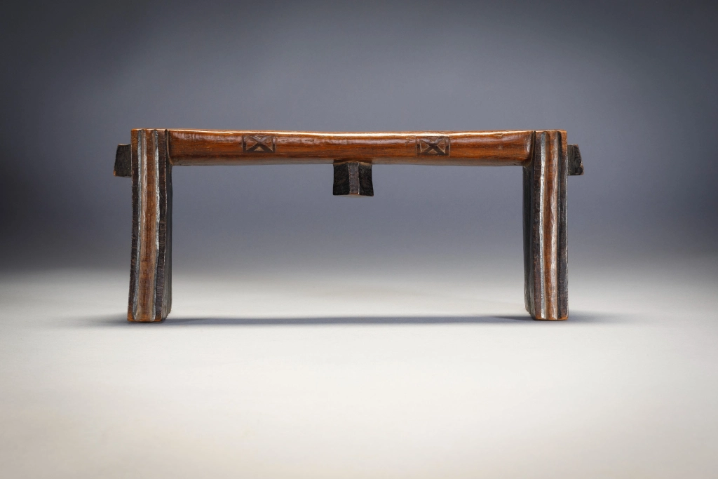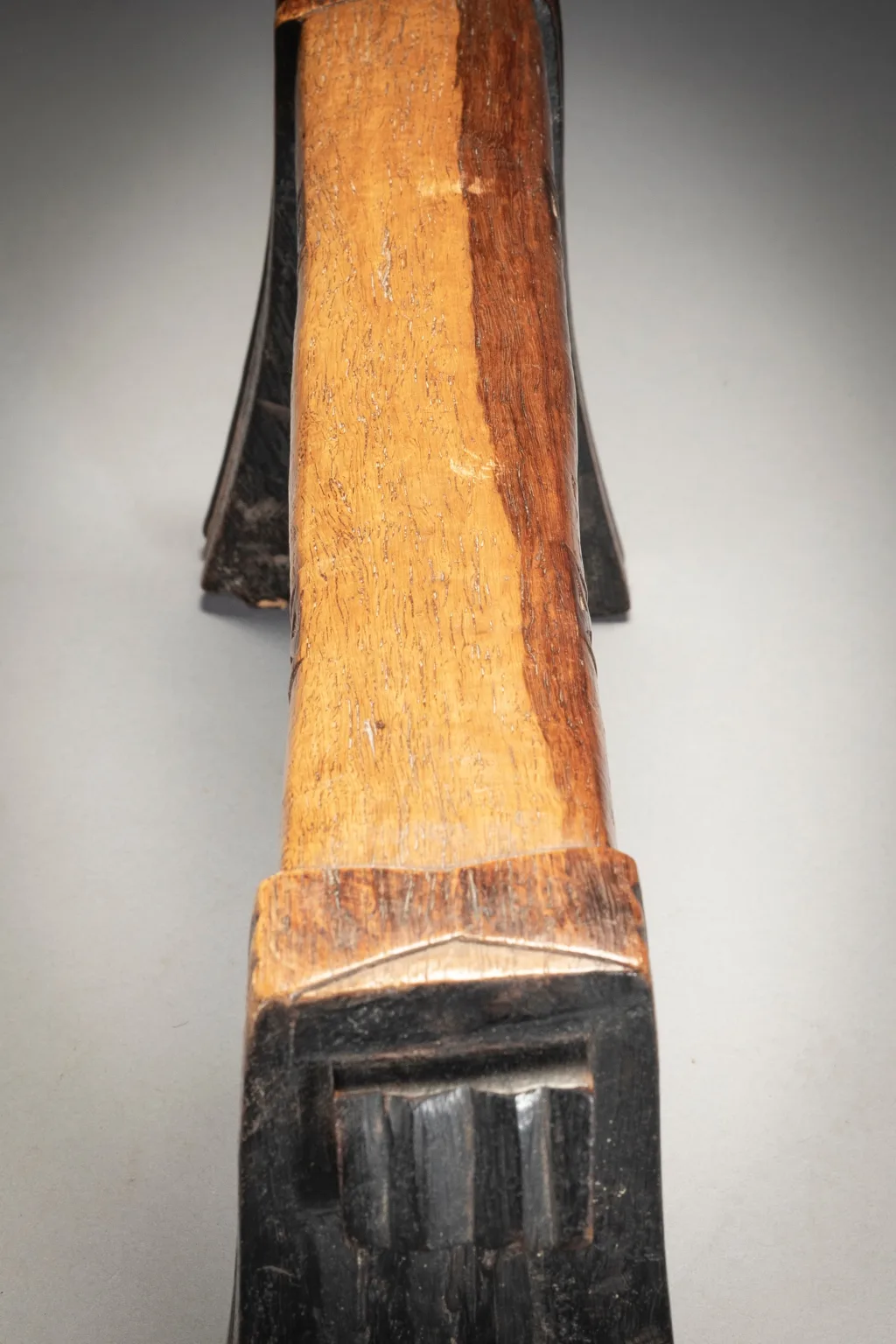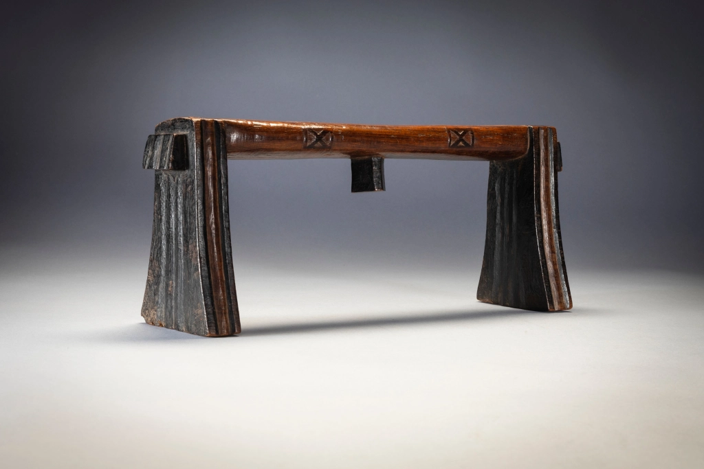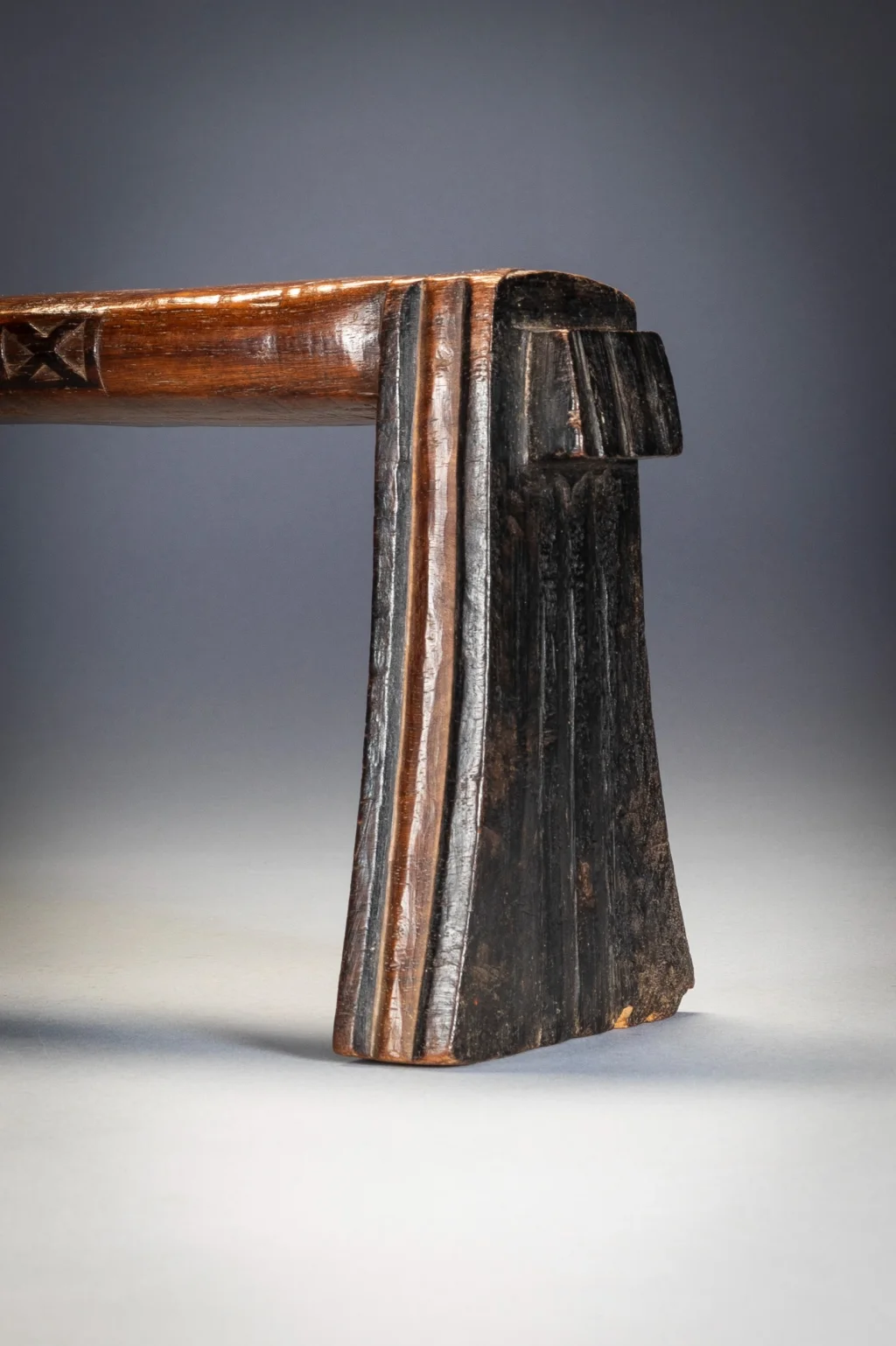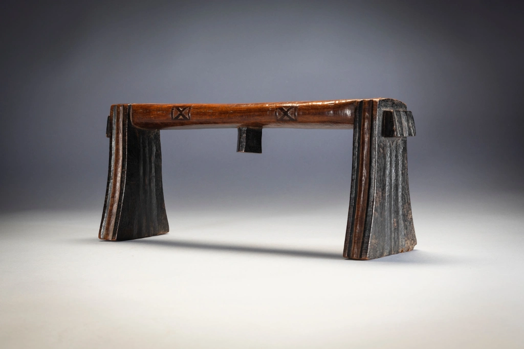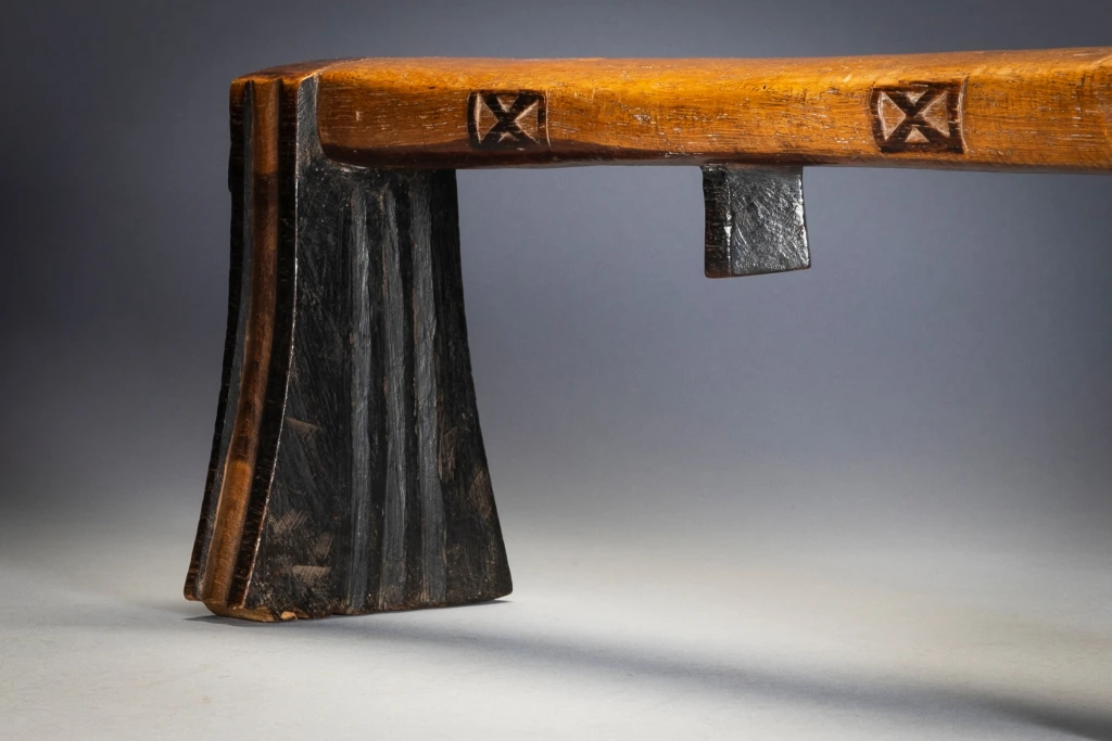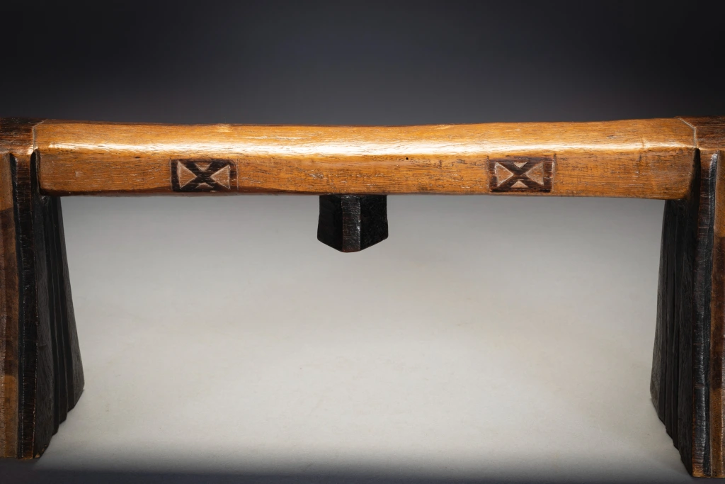 Cet appui-tête est d’une forme remarquable, avec des pieds fins et des oreilles à facettes, et est l’œuvre d’un sculpteur expérimenté. Il est décoré: de cannelures sur les pieds, de motifs en X sur les côtés de la plate-forme et d’oreilles angulaires jointes sur les plates-formes subtilement incurvées.Dans un cas comme celui-ci, il est intéressant de voir comment ils ne se sont pas usés avec le temps.Il s’agit d’un sicamelo d’âge moyen, dont les parties pyrogravées foncées ont commencé à s’user dans les zones les plus utilisées, et dont le bois de kiaat bicolore a commencé à acquérir une riche patine brillante.