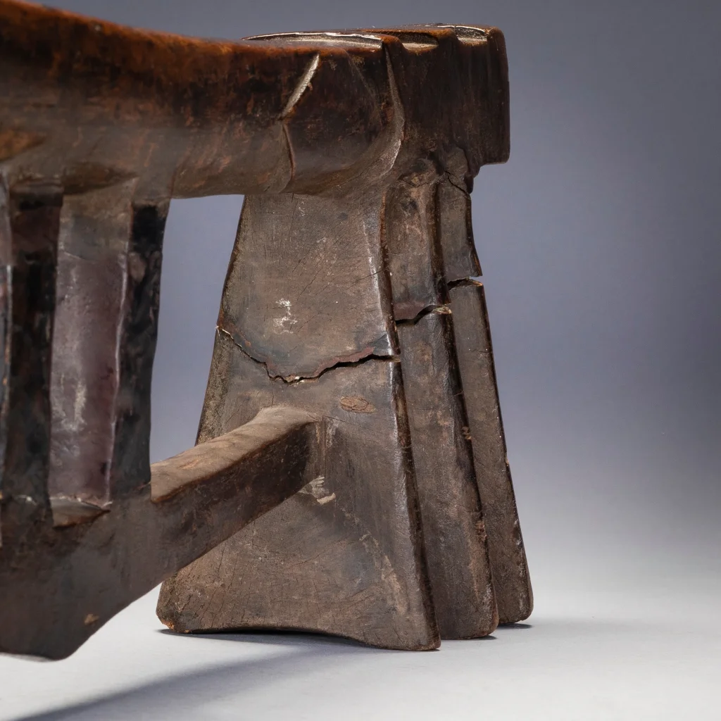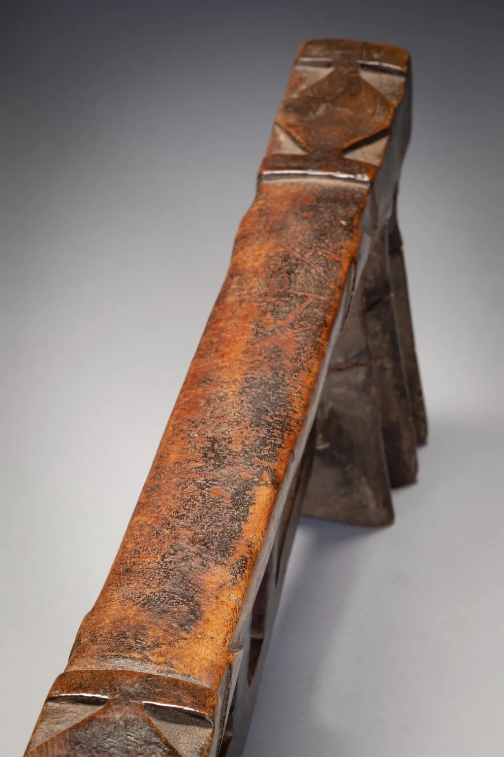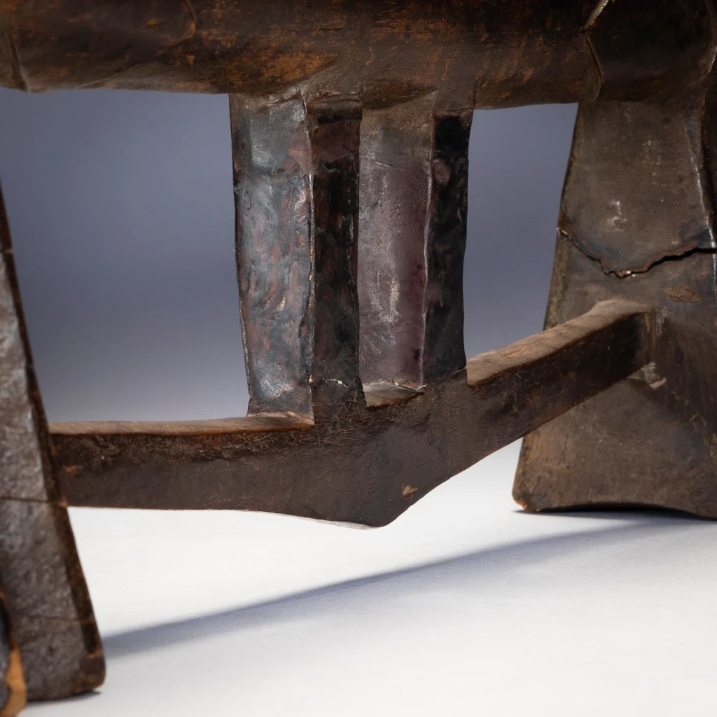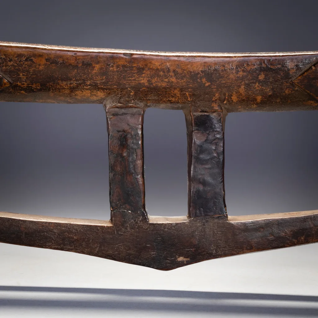 Ce grand appui-tête sombre possède une présence incroyable. Il a été collecté au Swaziland au début des années 90. Sa forme, avec des doubles montants jusqu’à l’axe, n’a jamais été vue auparavant. Il a aussi la particularité d’avoir un double arbre reliant la » lame » en forme de V à la face inférieure de la plate-forme. Ses pieds sont profondément cannelés et les extrémités de sa plate-forme sont décorées de puissants motifs en relief. Une patine sombre et incrustée se trouve sur ses pieds et une patine chaude et usée se trouve sur sa plate-forme. Les deux témoignent de son âge et de ses années d’utilisation.