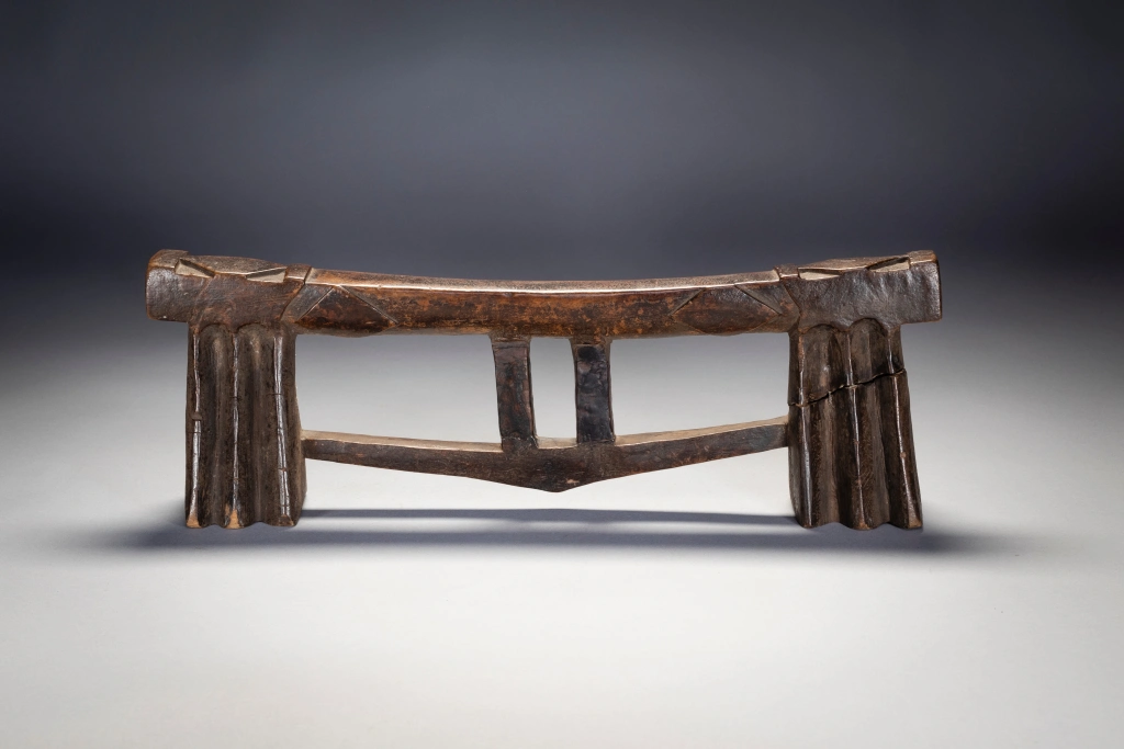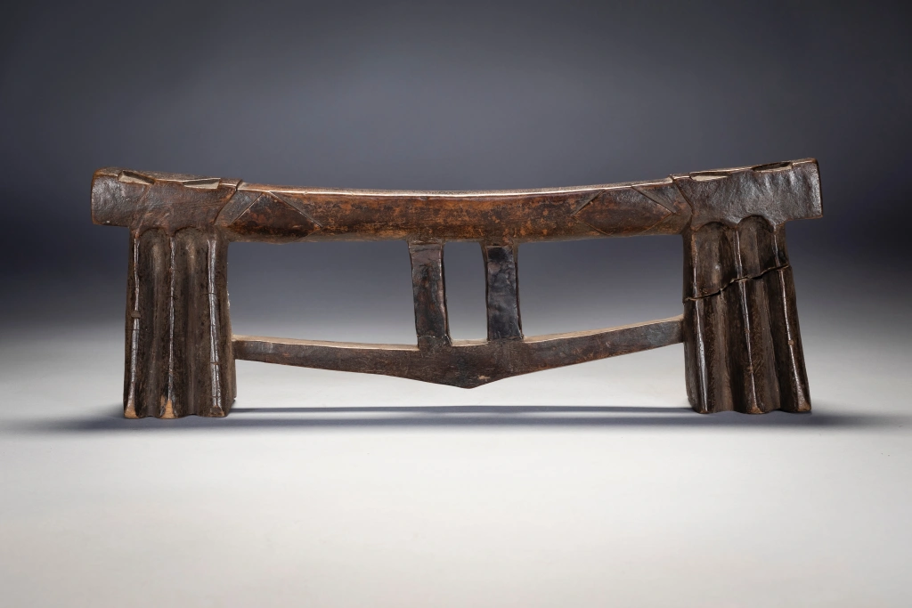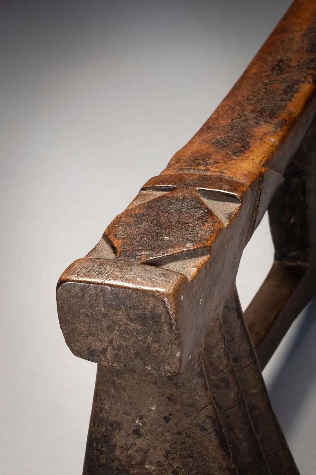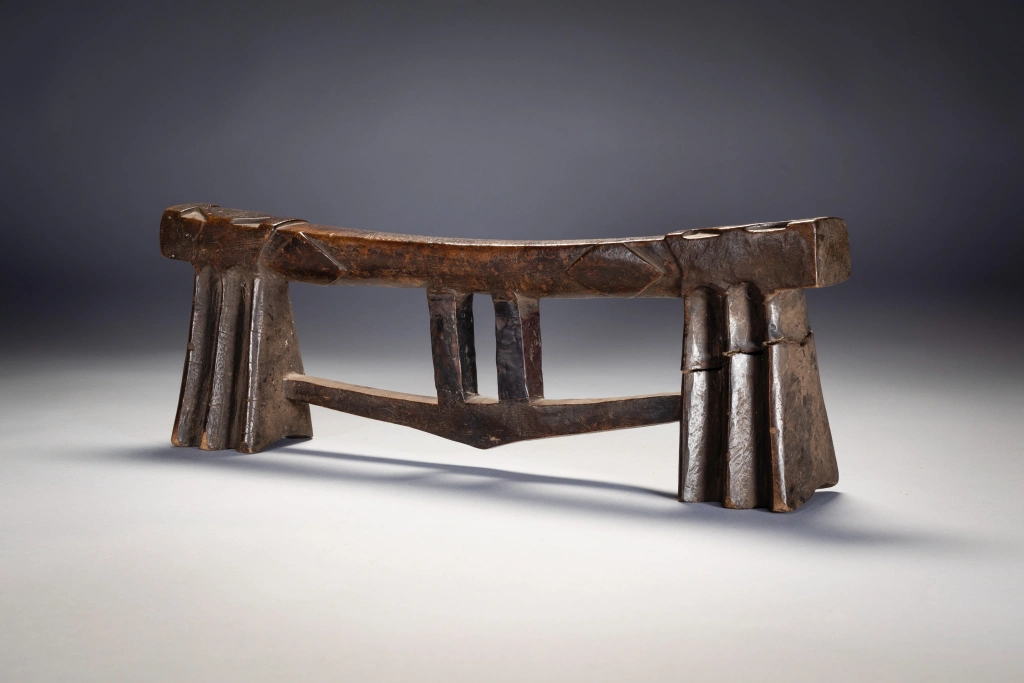 Ce grand appui-tête sombre possède une présence incroyable. Il a été collecté au Swaziland au début des années 90. Sa forme, avec des doubles montants jusqu’à l’axe, n’a jamais été vue auparavant. Il a aussi la particularité d’avoir un double arbre reliant la » lame » en forme de V à la face inférieure de la plate-forme. Ses pieds sont profondément cannelés et les extrémités de sa plate-forme sont décorées de puissants motifs en relief. Une patine sombre et incrustée se trouve sur ses pieds et une patine chaude et usée se trouve sur sa plate-forme. Les deux témoignent de son âge et de ses années d’utilisation.