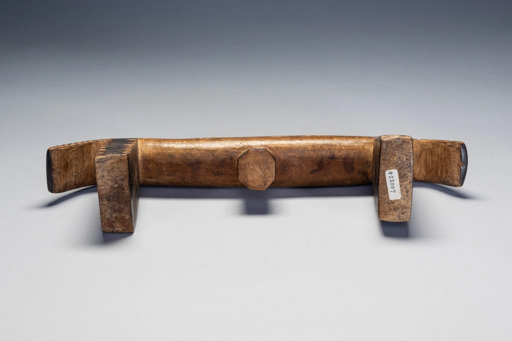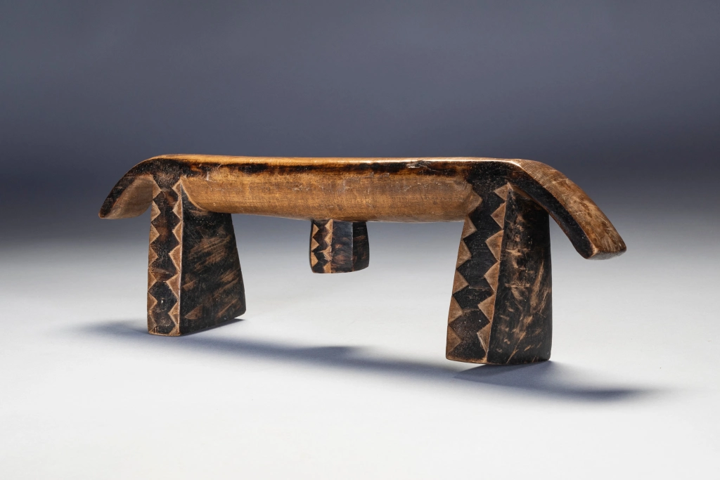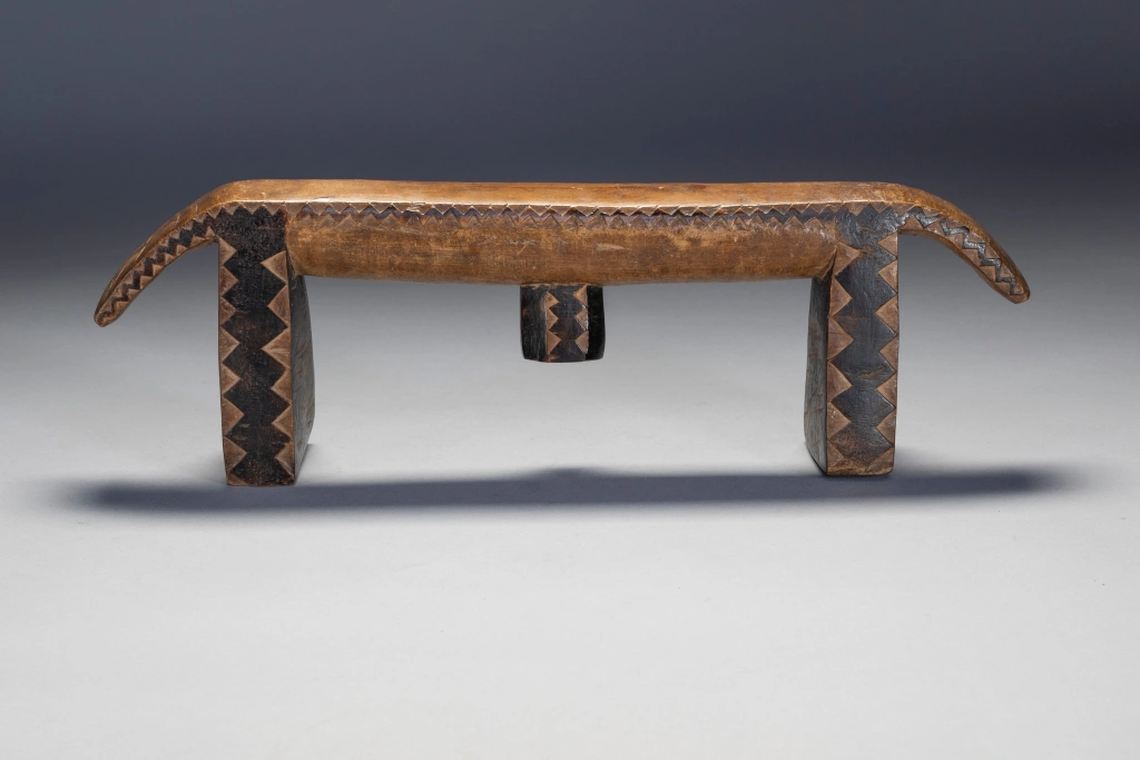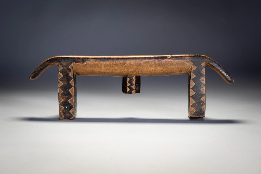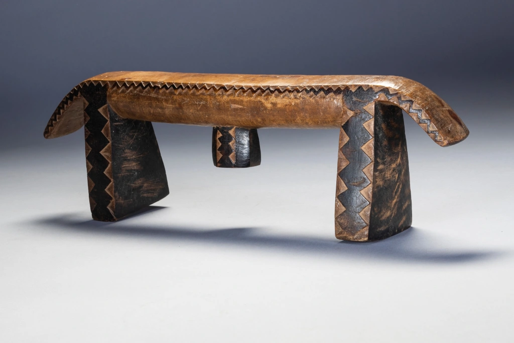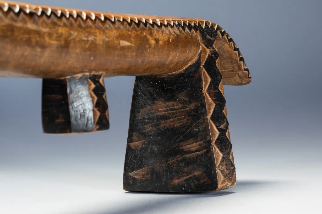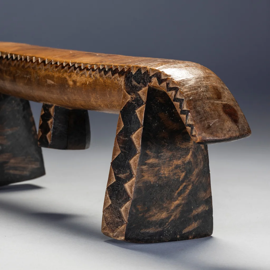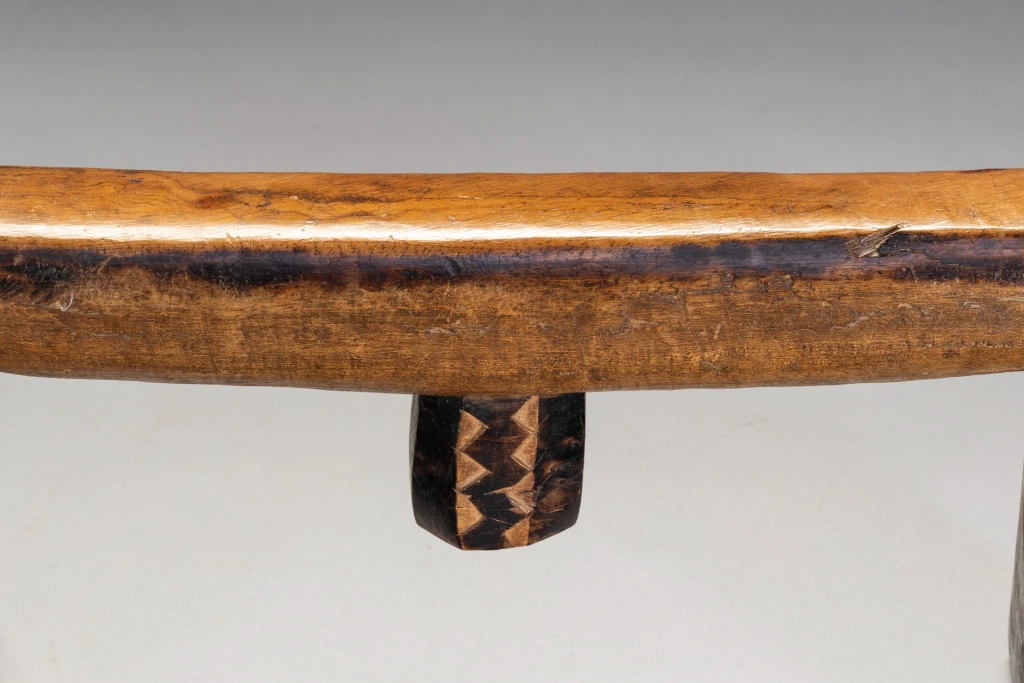 Cette pièce est totalement inhabituelle et est très célèbre auprès des experts. Il s’agit d’un appui-tête swazi unique avec de longues barres transversales incurvées vers le bas. Elles sont presque comme des queues qui pendent au-delà des pieds. Des motifs en zigzag décorent la longueur de la plate-forme et des motifs en chevrons de type zoulou ornent les pieds et l’ergot. Collecté en 2007 par Gordon Crawford dans la propriété de Khumalo, située dans la région de Sigcaweni, au centre du Swaziland, l’appui-tête aurait été sculpté par Hlobo Mkhabela, qui vivait à 2 km au nord de la ville de Siphofaneni, près du magasin Mkaya.