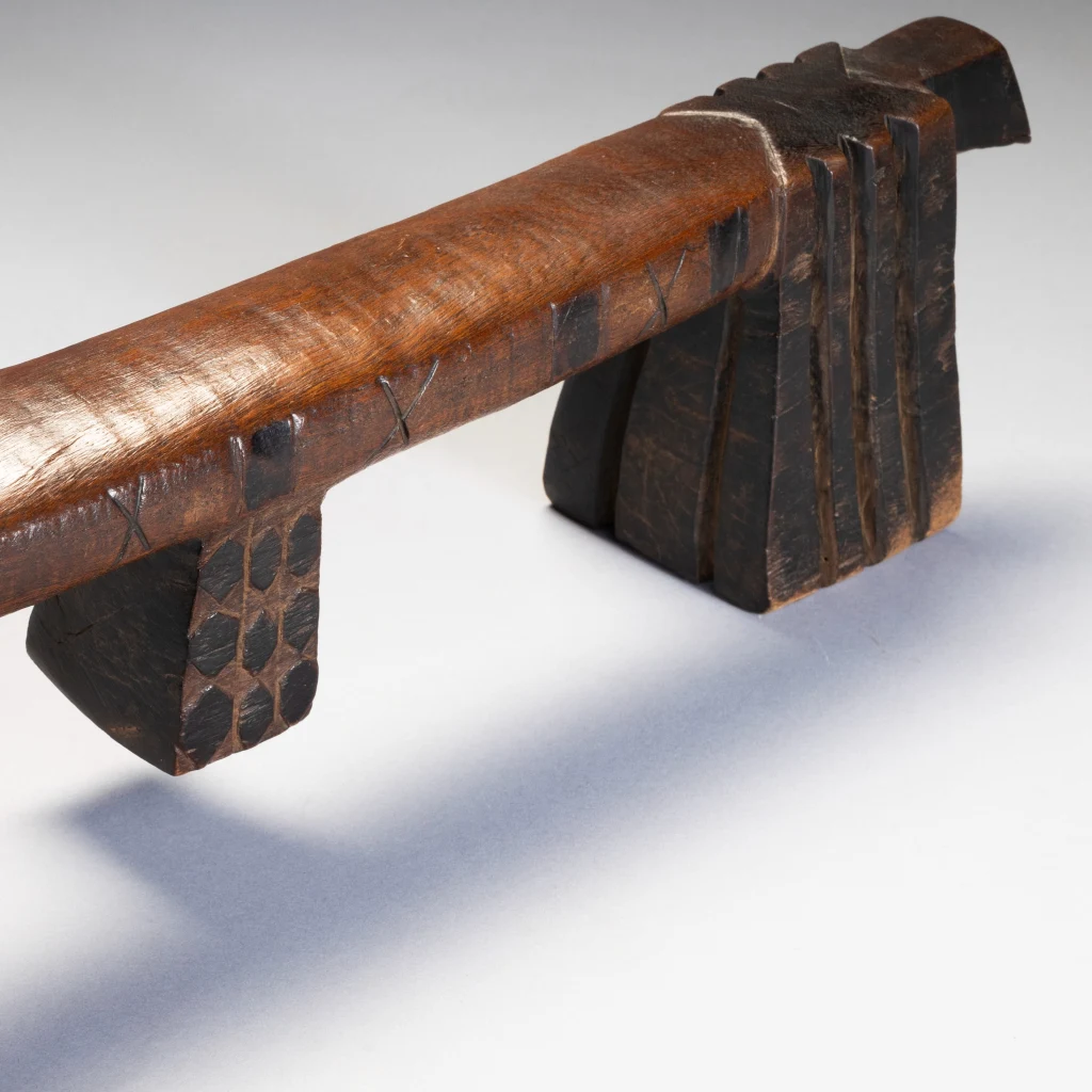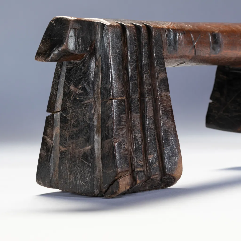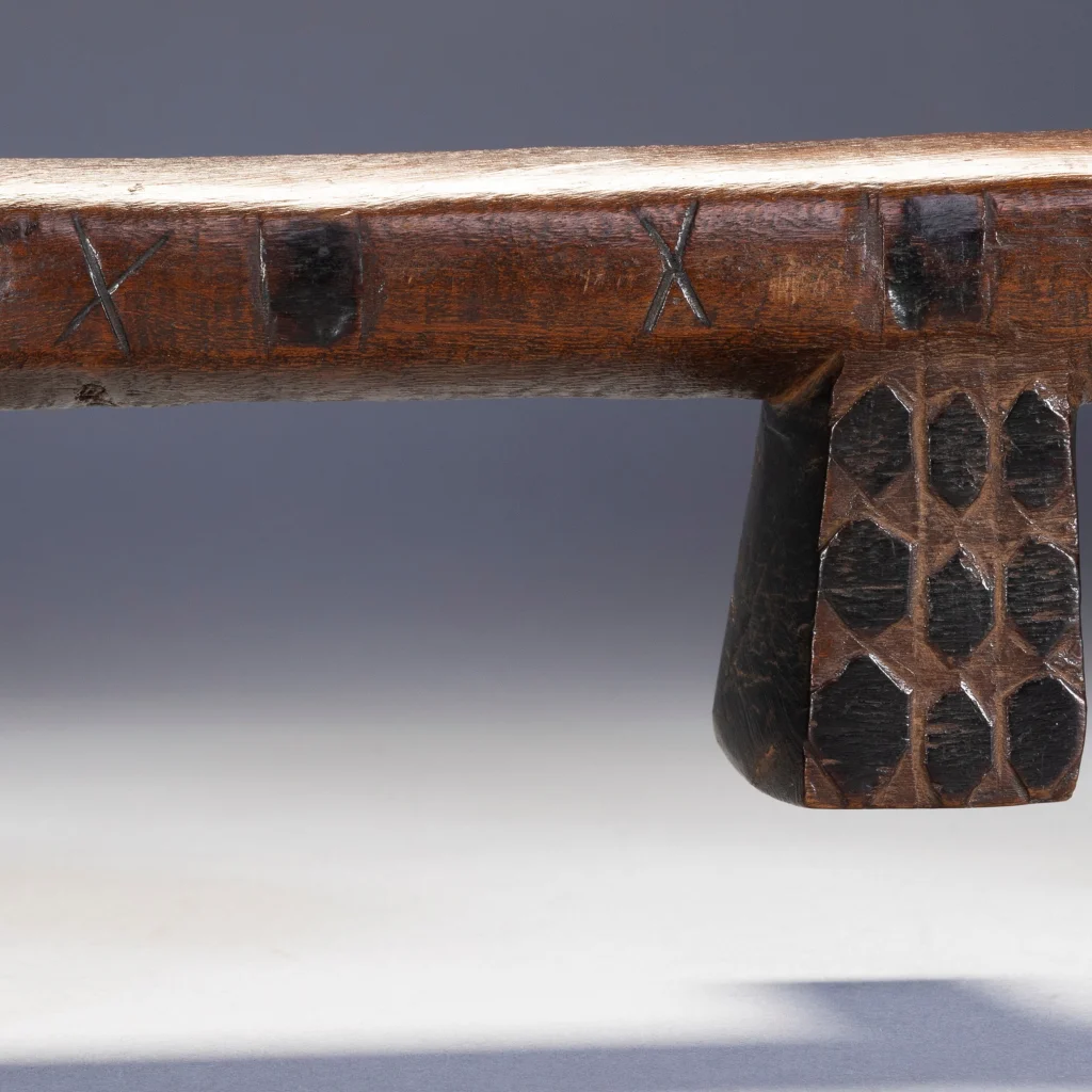 Cet ancien appui-tête est de la forme classique swazie, mais il est intéressant en raison des petites extensions de sa barre transversale pointues et de ses décorations sur l’ergot. Il a été collecté par Gordon Crawford en 2007 au sud d’Eswatini. Son imposante patte centrale et les côtés foncés de sa plate-forme sont décorés de points sombres.Il appartenait à Sam Mdluli, membre d’un des régiments de guerriers du roi sous les ordres du chef Cokohoma Dlamini de la région de Mbelebeleni. Chez les swazies. La jupe plissée en cuir de la veuve est la « sidvwaba », portée par les femmes mariées, et qui a donné son nom aux deux pieds de l’appui-tête swazi. Le reste de sa tenue est un vêtement de deuil traditionnel, son mari étant décédé récemment. Les vêtements de deuil sont généralement portés par la famille du défunt, et la femme doit continuer à les porter jusqu’à ce qu’ils soient convaincus que la période de deuil est terminée. Cette période peut durer d’un an à deux ans. Pendant cette période, la malheureuse femme est considérée comme porteuse de malchance et c’est une période difficile pour elle. À la fin de l’année, les Swazis organisent généralement une cérémonie de purification au cours de laquelle les vêtements et autres biens de la personne décédée sont sortis de sa hutte et distribués aux membres de sa famille. Même si la famille du défunt mari peut décider de prolonger son calvaire, la tenue de la veuve est généralement retirée à ce moment-là et brûlée lors de la cérémonie de purification. D’autres objets, dont l’appui-tête, peuvent également être brûlés à ce moment-là.