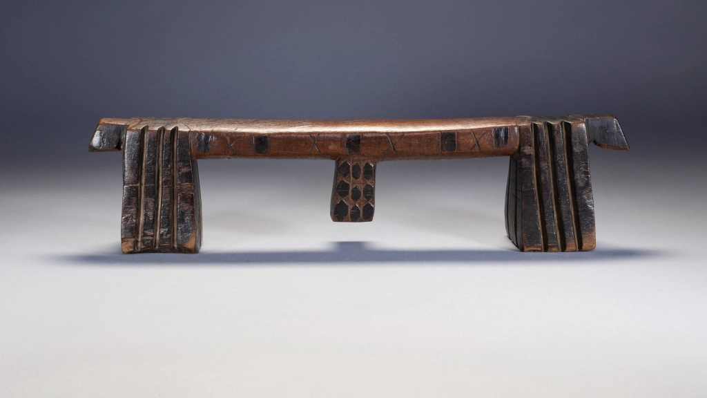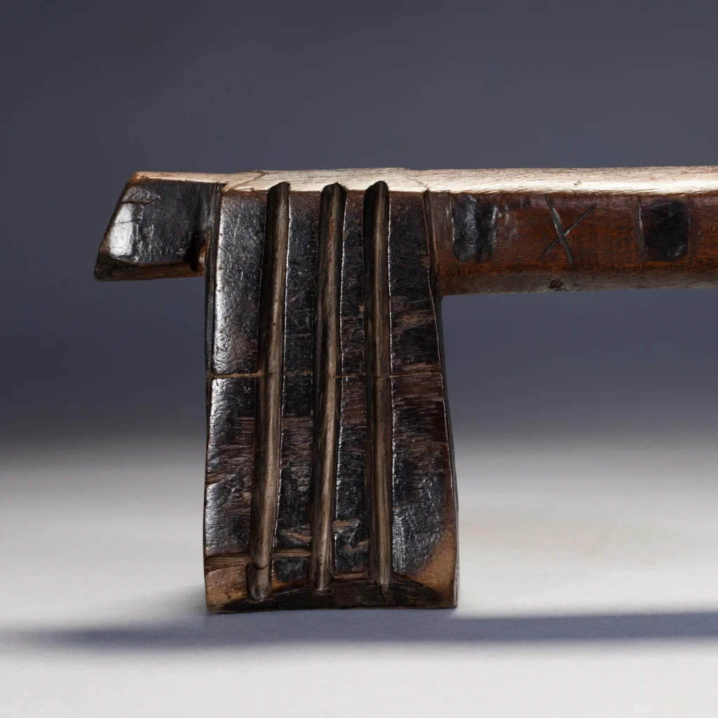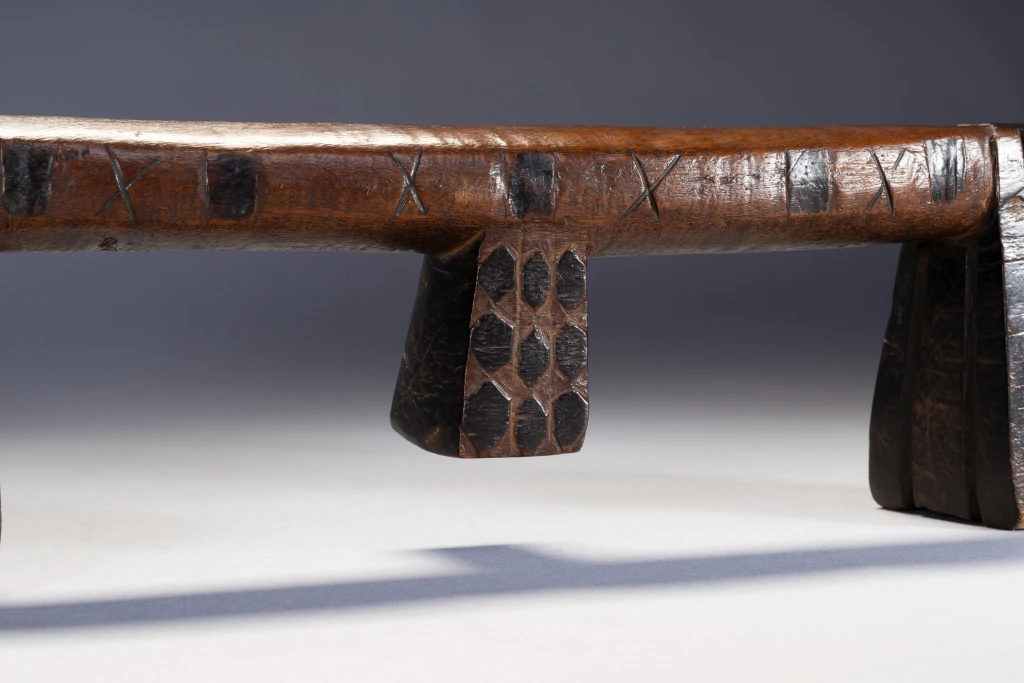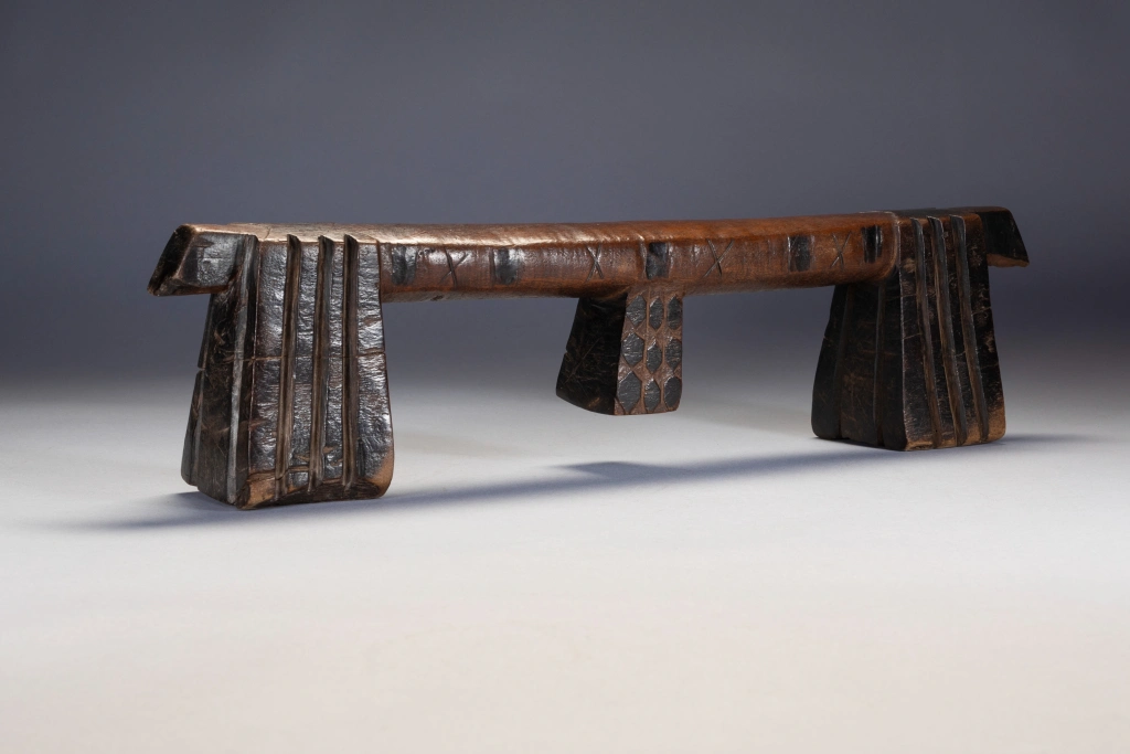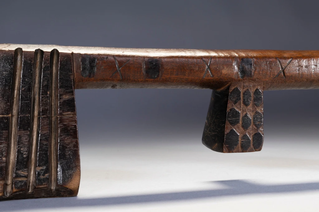 Cet ancien appui-tête est de la forme classique swazie, mais il est intéressant en raison des petites extensions de sa barre transversale pointues et de ses décorations sur l’ergot. Il a été collecté par Gordon Crawford en 2007 au sud d’Eswatini. Son imposante patte centrale et les côtés foncés de sa plate-forme sont décorés de points sombres.Il appartenait à Sam Mdluli, membre d’un des régiments de guerriers du roi sous les ordres du chef Cokohoma Dlamini de la région de Mbelebeleni. Chez les swazies. La jupe plissée en cuir de la veuve est la « sidvwaba », portée par les femmes mariées, et qui a donné son nom aux deux pieds de l’appui-tête swazi. Le reste de sa tenue est un vêtement de deuil traditionnel, son mari étant décédé récemment. Les vêtements de deuil sont généralement portés par la famille du défunt, et la femme doit continuer à les porter jusqu’à ce qu’ils soient convaincus que la période de deuil est terminée. Cette période peut durer d’un an à deux ans. Pendant cette période, la malheureuse femme est considérée comme porteuse de malchance et c’est une période difficile pour elle. À la fin de l’année, les Swazis organisent généralement une cérémonie de purification au cours de laquelle les vêtements et autres biens de la personne décédée sont sortis de sa hutte et distribués aux membres de sa famille. Même si la famille du défunt mari peut décider de prolonger son calvaire, la tenue de la veuve est généralement retirée à ce moment-là et brûlée lors de la cérémonie de purification. D’autres objets, dont l’appui-tête, peuvent également être brûlés à ce moment-là.
