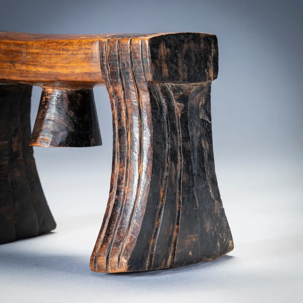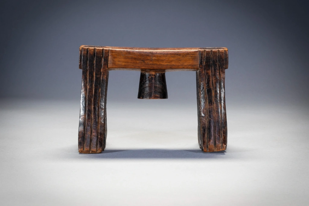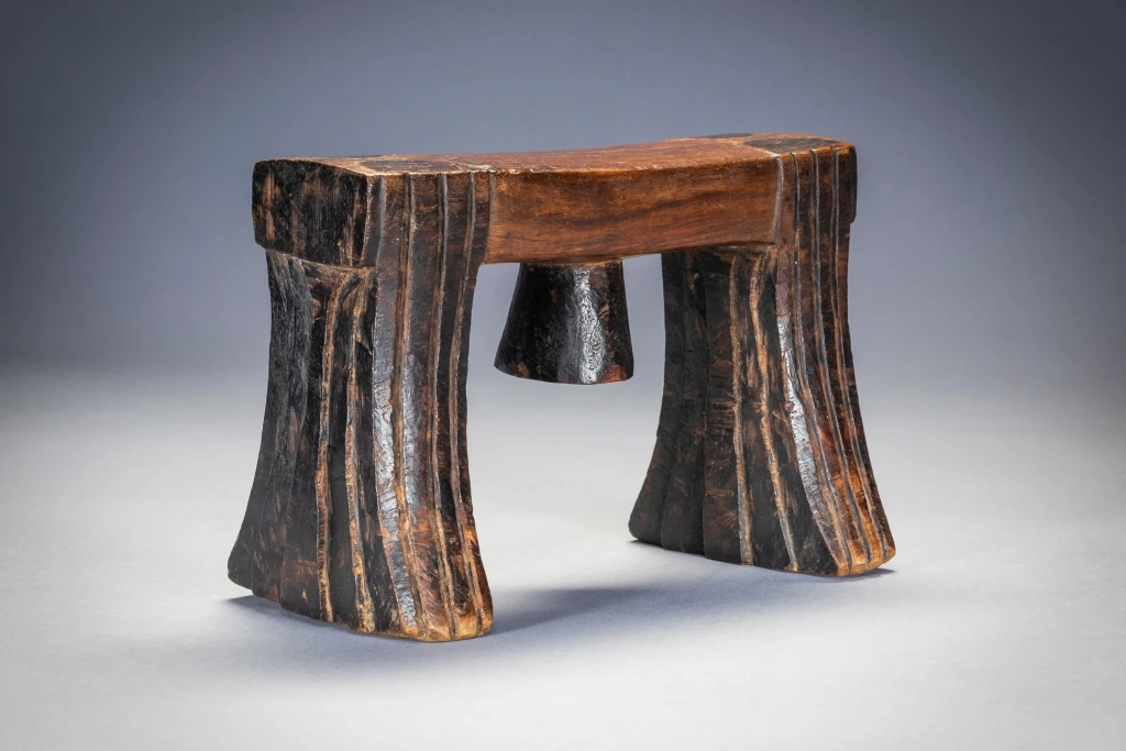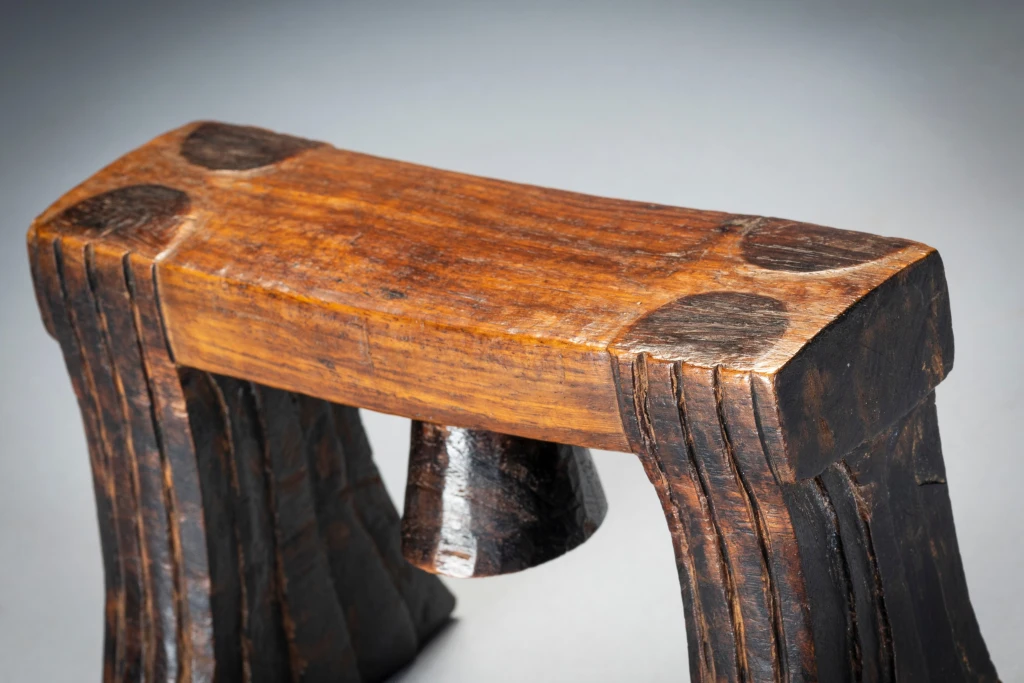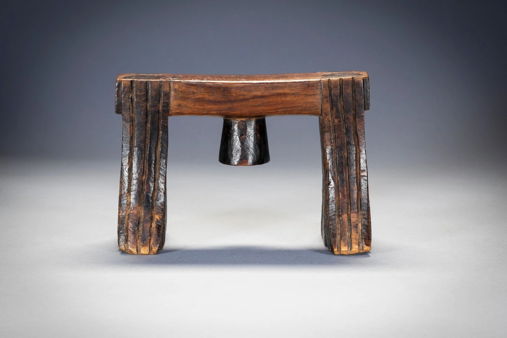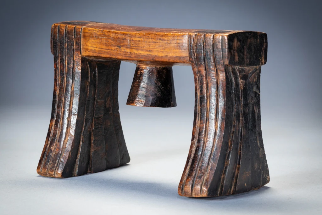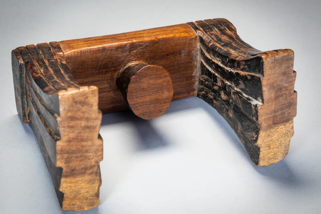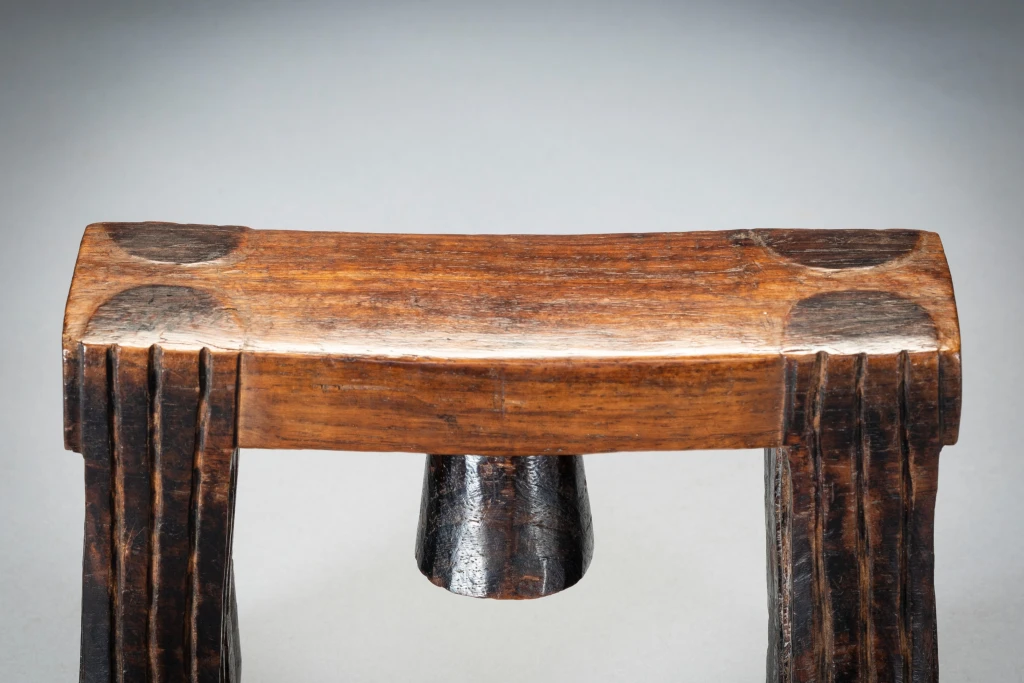Cet appui-tête swazi a été obtenu il y a plusieurs années lors d’un échange avec Paul Mikula à Durban, en Afrique du Sud. Il avait obtenu presque tout ce qui était sorti du milieu en peu de temps d’un ancien coureur du nom de Tony Vein. Tony Vein a pris de l’âge et, aux dernières nouvelles, a déménagé au Swaziland. Les appuis-tête swazis de petites tailles souvent accrochés au cou auraient été utilisés lors des déplacements. Les proportions sont un peu comme celles qui sont utilisées par leurs voisins Tsonga. À notre connaissance, moins d’une dizaine d’exemplaires de cette taille sont connus. Cet exemplaire a été recueilli dans un village vers l’an 2000 et aurait plus de cinquante ans d’âge. Les appuis-tête du Swaziland sont généralement taillés dans du « » ou un arbre de bois de sang, ainsi nommé pour sa sève couleur sang. C’est un bois très populaire utilisé pour les meublés et est connu sous le nom de Mukwa ou Kiaat.