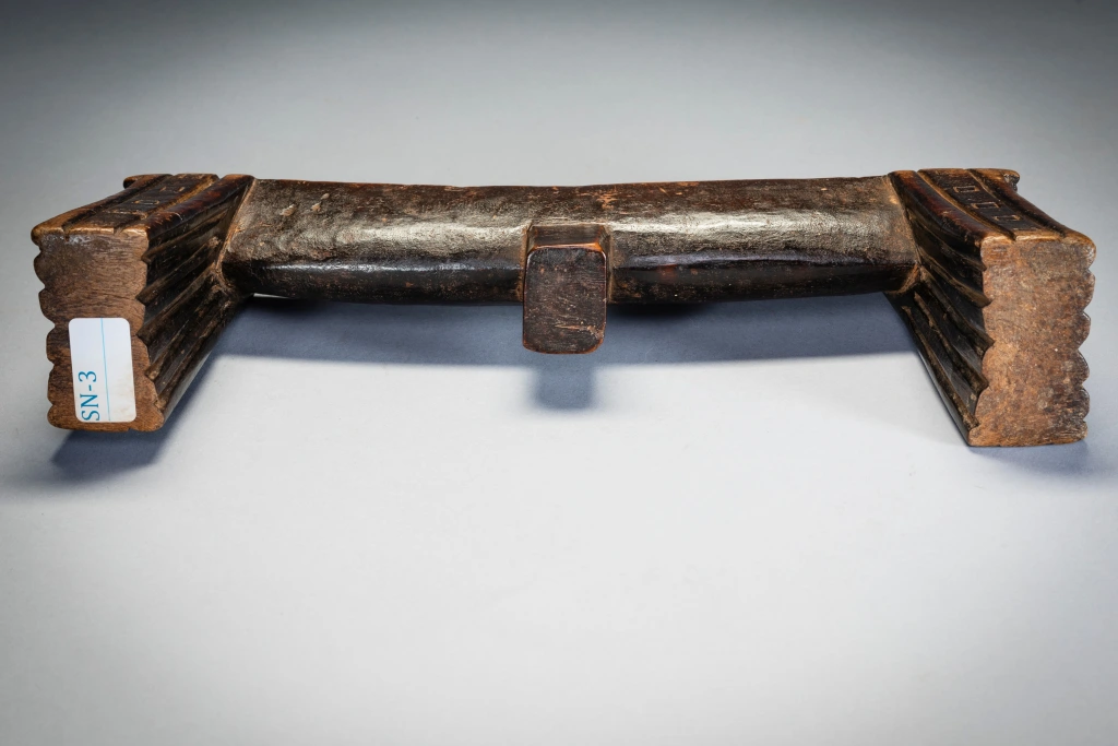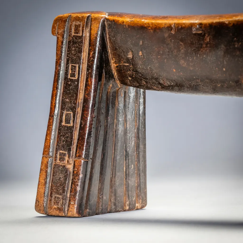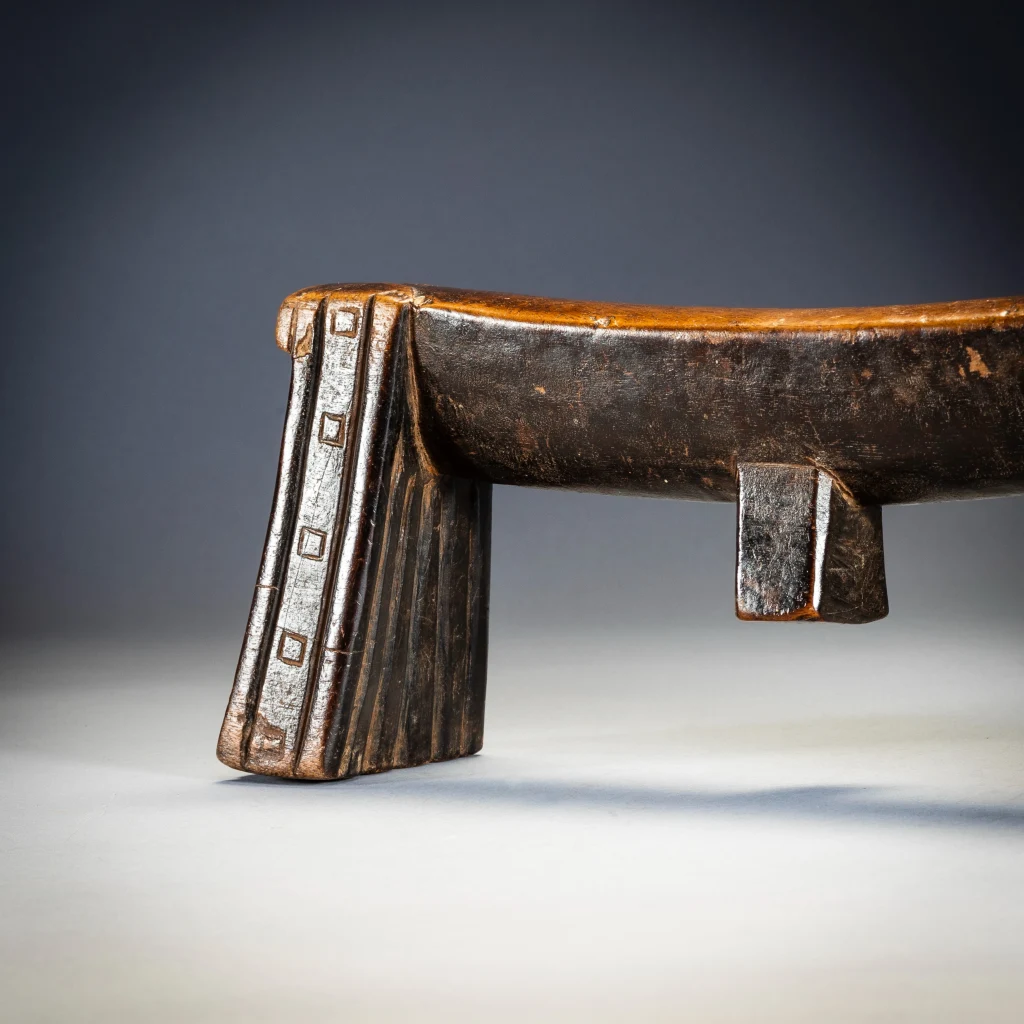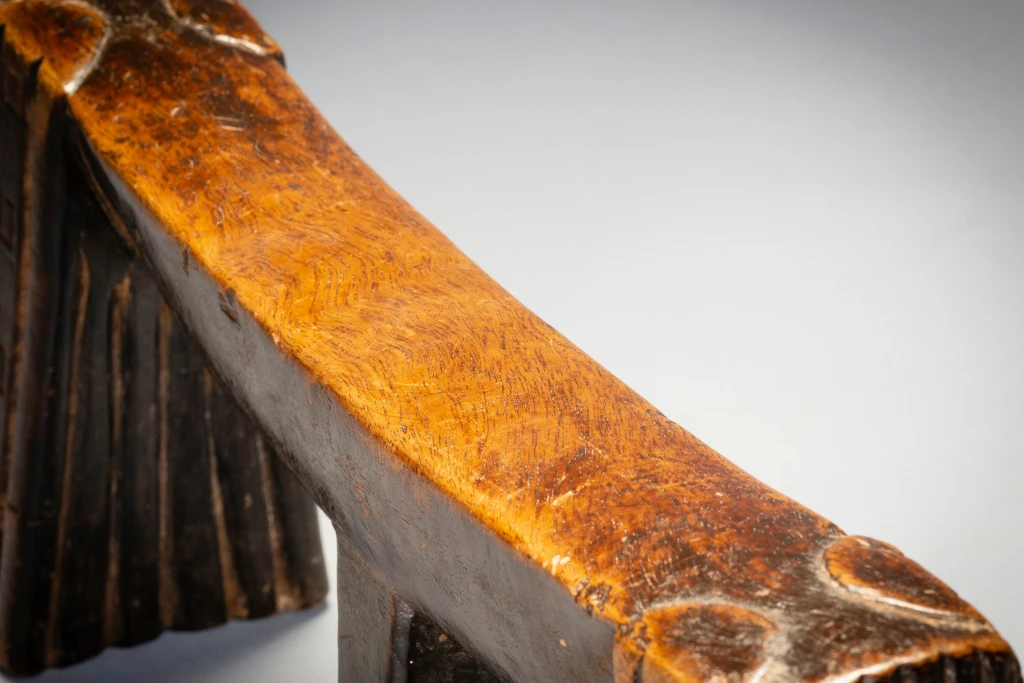 Zoomorphe signifie avoir la forme d’un animal. Et comme nous le savons, dans la culture nguni, et dans la culture swazi, le bétail était les animaux les plus importants. La vie des gens était intimement liée à celle de leur bétail, et la consommation de lait au quotidien et de viande lors des cérémonies était à la fois destinée à nourrir les vivants et offerte en remerciement aux ancêtres. Ce vieux sicamelo à une splendide forme bovine. Sa plate-forme incurvée avec son sibhono carré semble pendre lourdement comme un estomac massif entre des jambes angulaires, le tirant vers l’intérieur. Les pieds sont décorés d’une combinaison de cannelures et de motifs carrés qui reprennent la forme de l’ergot. Il a été collecté par Bert Garrebeck personnellement près de Tugela Ferry en 1972 auprès d’une femme très âgée qui l’avait reçu en dot.