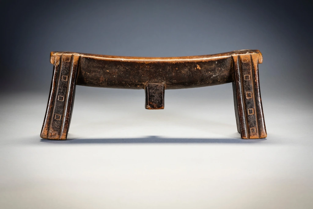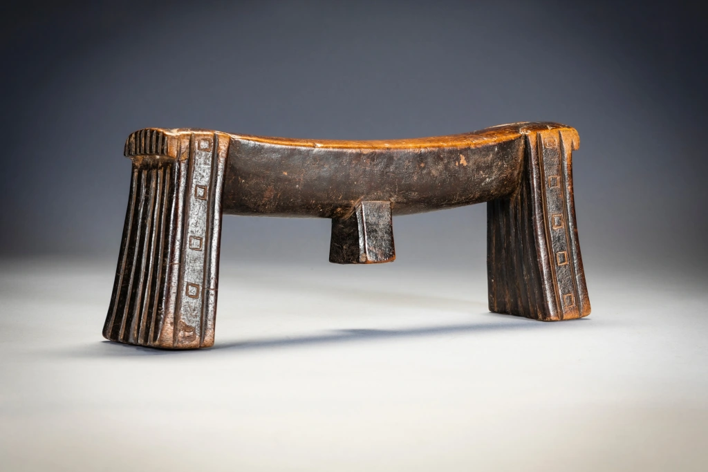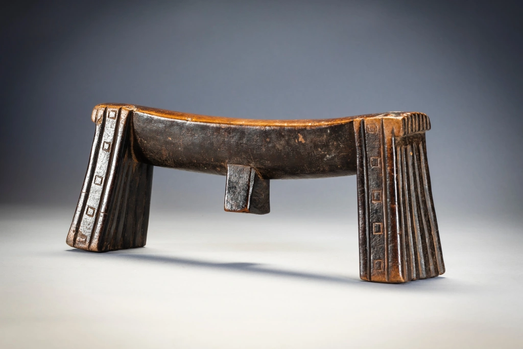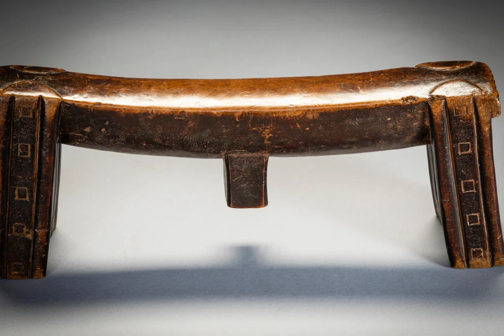 Zoomorphe signifie avoir la forme d’un animal. Et comme nous le savons, dans la culture nguni, et dans la culture swazi, le bétail était les animaux les plus importants. La vie des gens était intimement liée à celle de leur bétail, et la consommation de lait au quotidien et de viande lors des cérémonies était à la fois destinée à nourrir les vivants et offerte en remerciement aux ancêtres. Ce vieux sicamelo à une splendide forme bovine. Sa plate-forme incurvée avec son sibhono carré semble pendre lourdement comme un estomac massif entre des jambes angulaires, le tirant vers l’intérieur. Les pieds sont décorés d’une combinaison de cannelures et de motifs carrés qui reprennent la forme de l’ergot. Il a été collecté par Bert Garrebeck personnellement près de Tugela Ferry en 1972 auprès d’une femme très âgée qui l’avait reçu en dot.