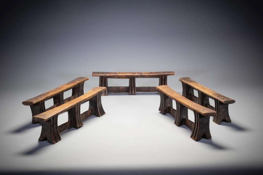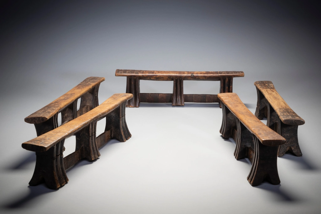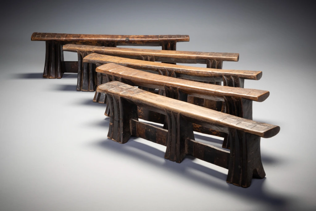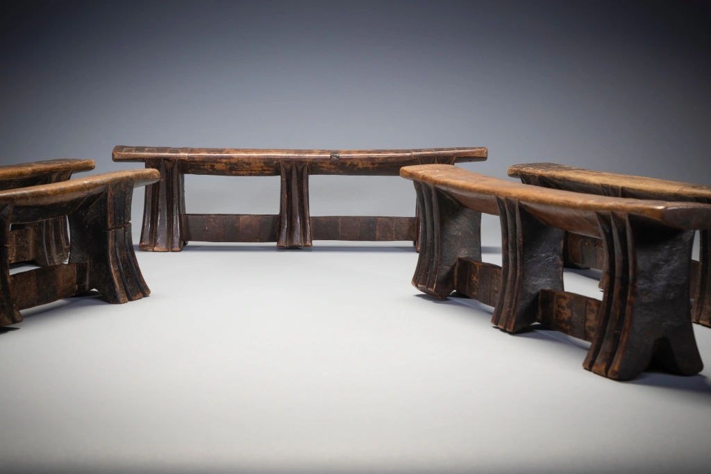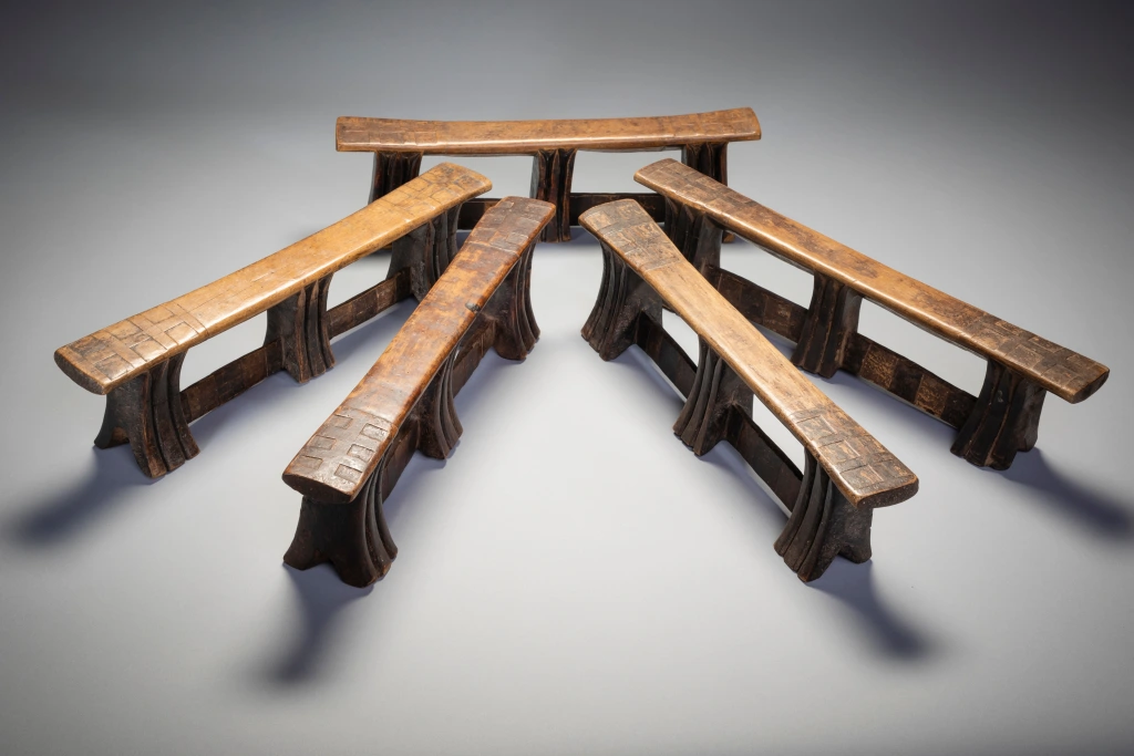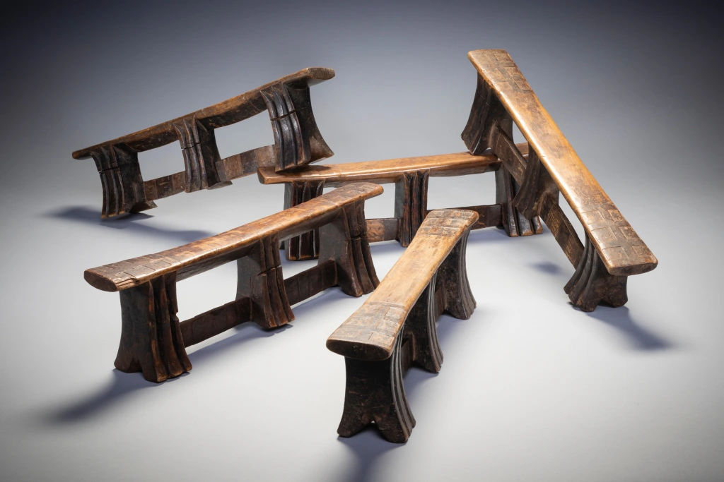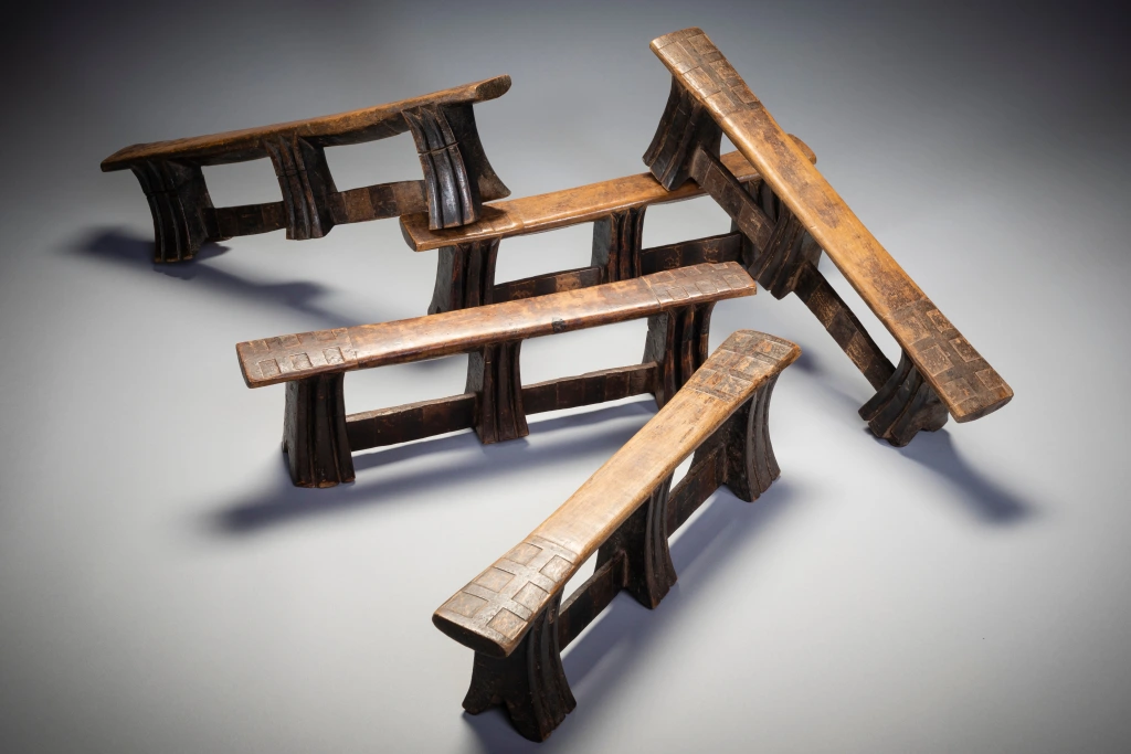 Le mystère de la collection Stekemani : il semblerait que ce célèbre sculpteur swazi ait réalisé 10 appuis-tête de ce style, pour ses 5 enfants et leurs conjoints selon une hypothèse non vérifiée. Un peu comme le trésor de la licorne dans les bandes dessinées de Tintin, sur les dix appuis-tête de Steckemani 5 appartiennent à la collection Zimer, 2 à celle de Bruce Goodall et 1 au musée MFA de Boston vendue par les collectionneurs suisses Udo et Waltraut Hortmann en septembre 2013.Mais qui détient les 2 dernières pièces de la célèbre collection Stekemani ? Quel villageois au fin fond du KwazuluNatal ? Quel collectionneur ? Dans quel musée du globe? Dans quel pays ?Feu Stekemani Ntshangase était un sculpteur qui vivait dans la région de Ngwavuma, dans le nord du KwaZulu-Natal. Il appartenait au clan Ntshangase, qui vit de part et d’autre des montagnes Lebombo, aujourd’hui frontière entre l’Afrique du Sud et l’Eswatini. À l’époque précoloniale, les membres du clan se déplaçaient avec leur bétail, vivant au sommet de l’escarpement pendant la saison chaude, donc en Afrique du Sud, et migrant vers l’Eswatini pendant les mois plus frais. Les Ntshangase, bien que farouchement indépendants, se considèrent comme des Swazis, car ils n’ont jamais été intégrés au royaume zoulou. En 2005, sur une période de quelques semaines, plusieurs appuie-tête, dont six Stekemanis, ont été collectés par Gertude Dube à Durban. À cette époque, le Zoulouland avait déjà fait l’objet de nombreuses collectes et les appuis-tête devenaient difficiles à trouver. Gertude est donc allée jusqu’à Ngwavuma, à la frontière de l’Eswatini et du Mozambique. En s’enfonçant de plus en plus dans la région reculée des monts Lebombo, elle a eu la chance d’accéder à des terres appartenant à des Swazis, une région riche en appuie-tête. Gordon Crawford a eu la chance d’acheter un grand nombre d’entre eux, y compris les six Stekemanis. C’est Gertrude qui a identifié ces appuis-tête comme étant l’œuvre de Stekemani (cette information a été transmise à Gordon Crawford et inscrite dans son livre « Sicebile »), parmi eux seuls sept des dix pièces existantes ont été identifiés dans des collections à travers le monde. Ces appuis-tête de la période mature de Stekemanis présentent quelques caractéristiques distinctives. Ils ont trois pieds, avec des entailles en forme de V en dessous de la plateforme. Ils sont reliés, vers le bas où ils s’évasent, par deux contreforts plats. La jambe centrale, tout en ayant la même forme que les deux autres, ne touche généralement pas le sol, ce qui signifie qu’elle est à mi-chemin entre une jambe et un ergot prolongé. Les côtés incurvés des jambes ne présentent que deux rainures, exceptionnellement profondes, tandis que les côtés plats sont laissés lisses. Les contreforts qui relient les pieds sont décorés de carrés de différentes couleurs, et les extrémités supérieures de la plate-forme de couchage sont marquées d’un audacieux motif croisé.