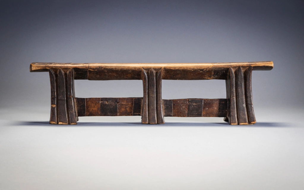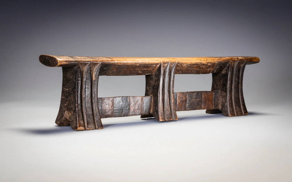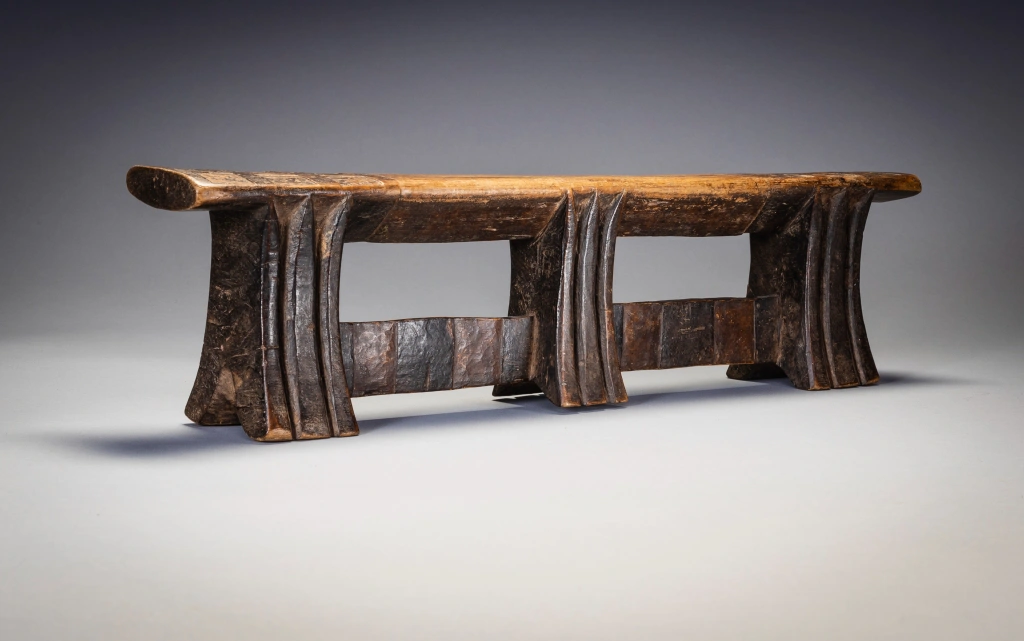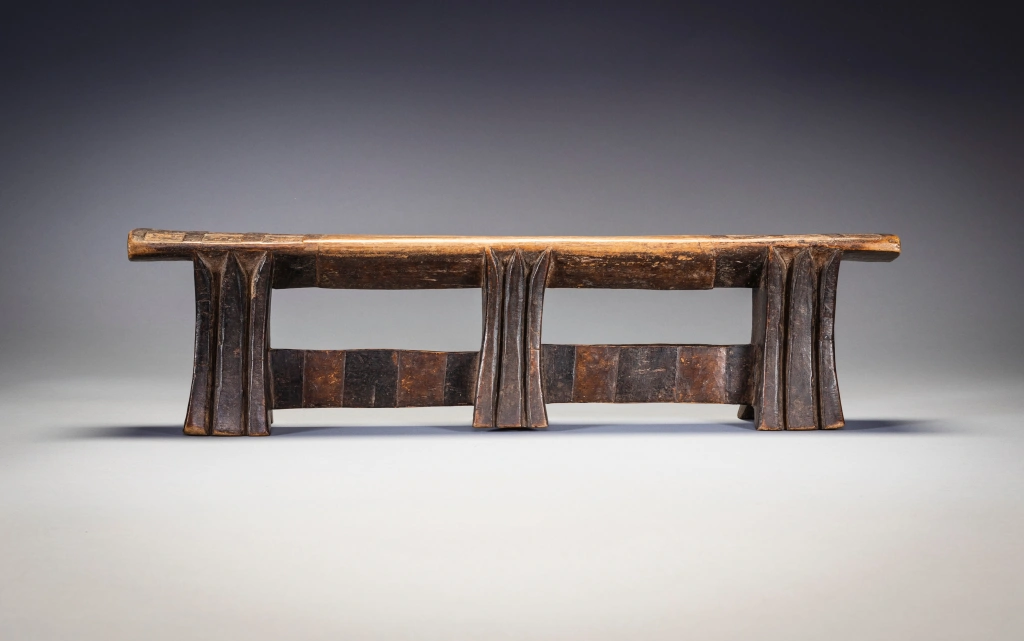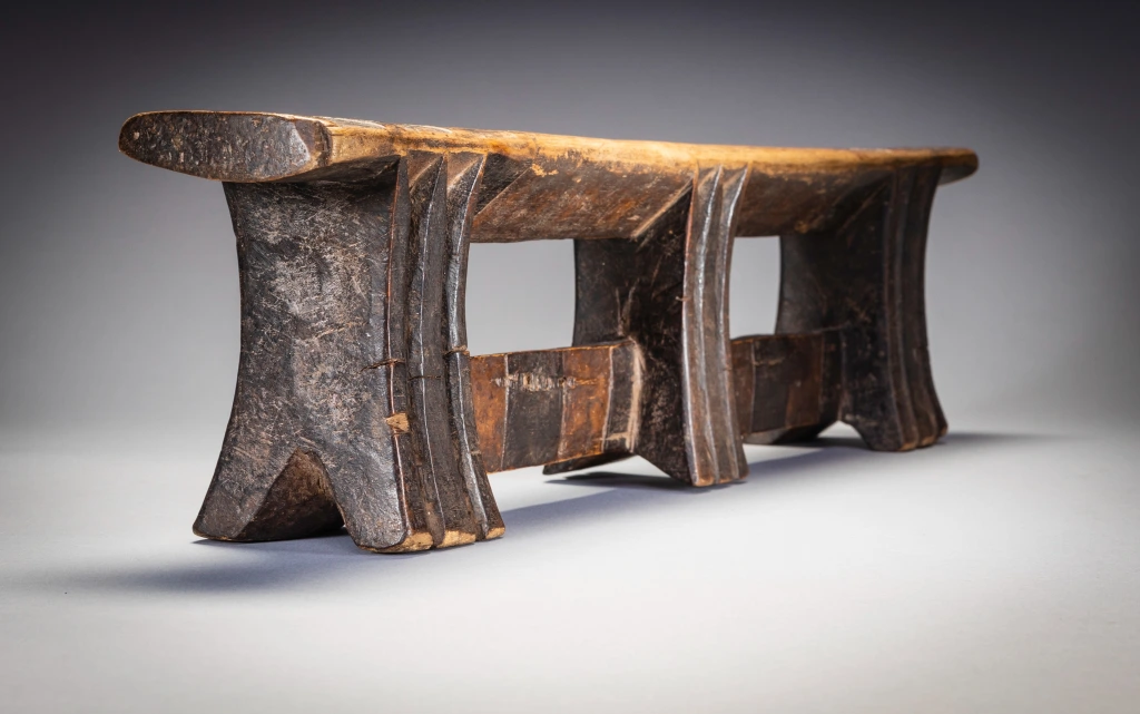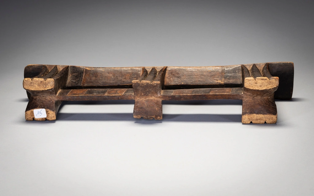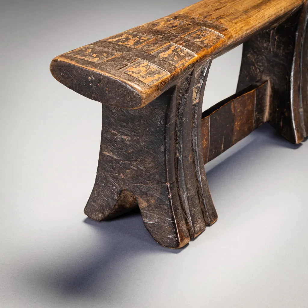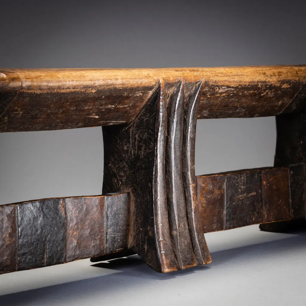 Il s’agit d’un des huit appuis-tête connus de ce style, réalisés par le même sculpteur et conservés dans des collections internationales. Bruce Goodall l’a acheté à Gertude Dube, il y a environ 10 ans. Elle l’a collecté dans un village swazi des montagnes Lebombo, à la frontière entre l’Afrique du Sud et le Swaziland. Stekemani, du clan Ntshangase, était le sculpteur de ces appuis-tête caractéristiques de style contrefort avec trois pieds crantés. Il a probablement été fabriqué vers 1930. Stekemani a vécu dans le sud du Swaziland et est décédé en 1960. Cette information, recueillie par Gertude Dube et communiquée à Bruce Goodall, a été utilisée dans le livre de Gordon Crawford sur les objets d’art swazis -Sicebile. Un coin de la partie supérieure est ébréché et il y a des traces d’anciennes réparations à l’aide de colle ou de mastic par endroits. Il s’agit néanmoins d’un bel objet original.