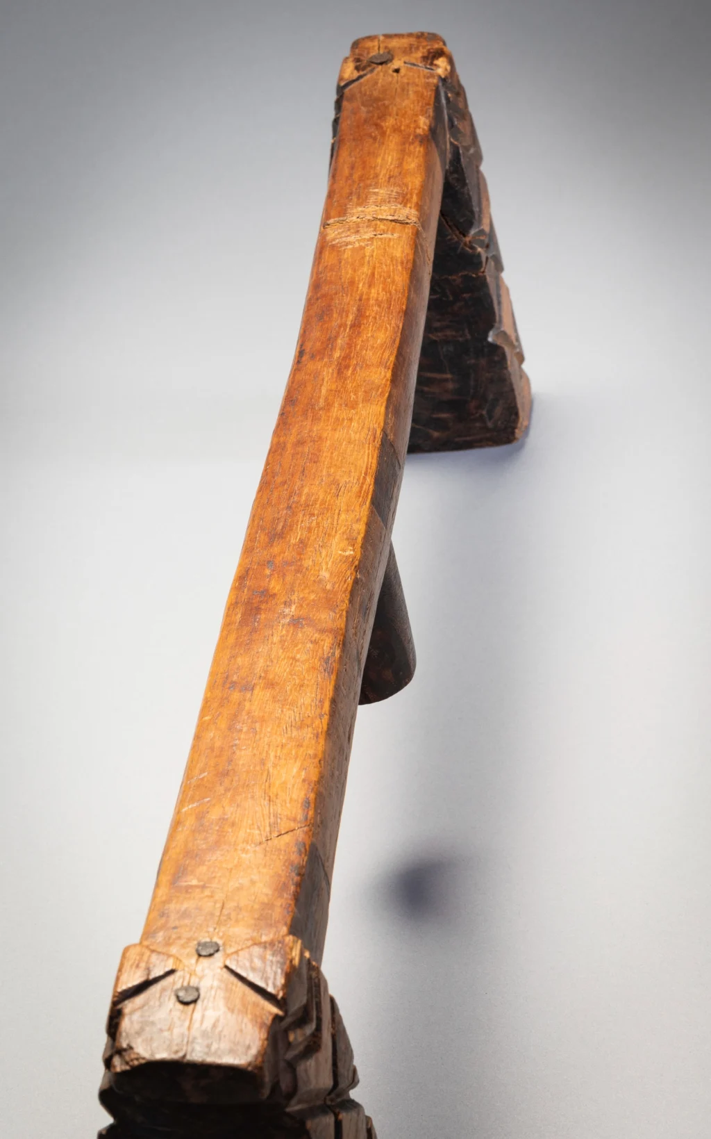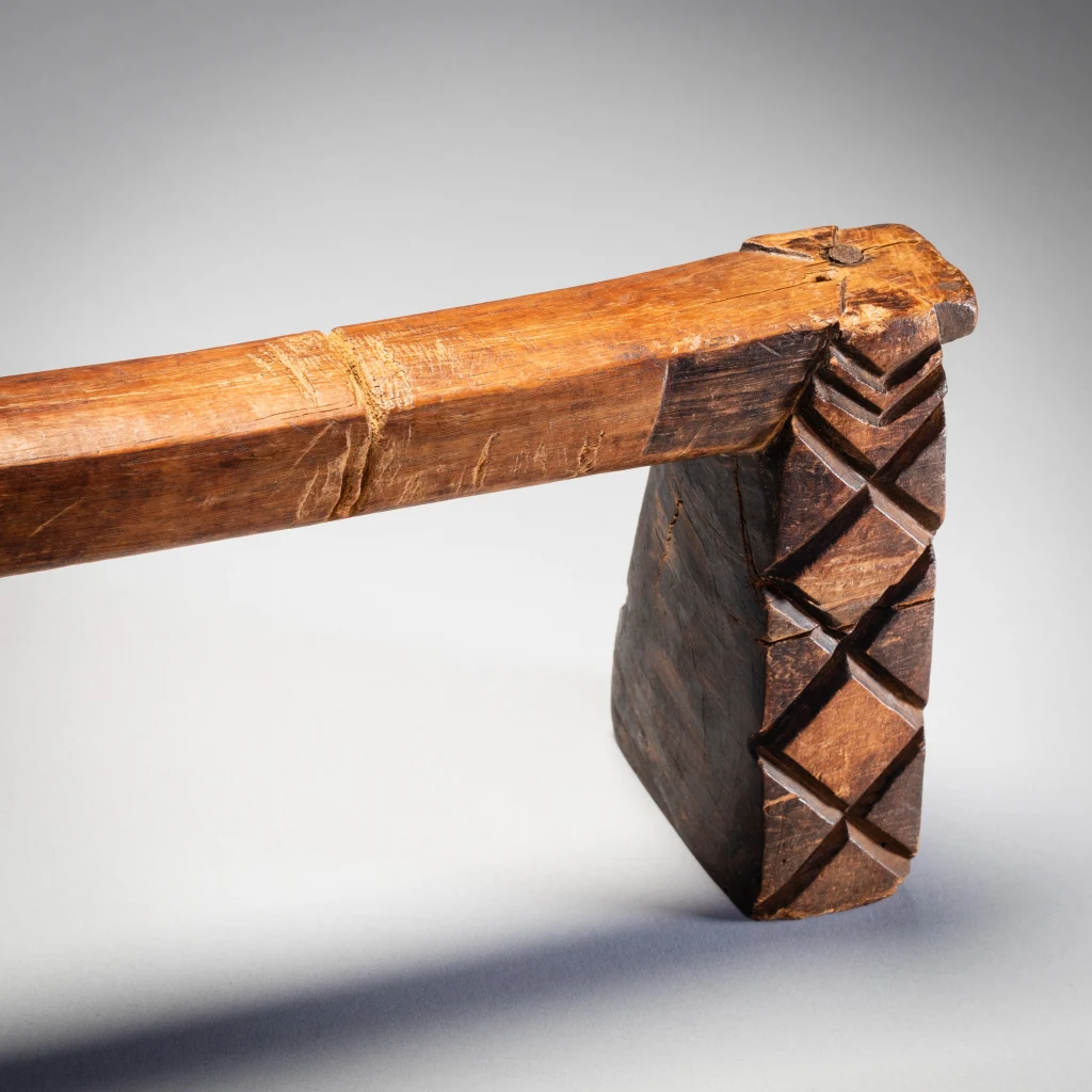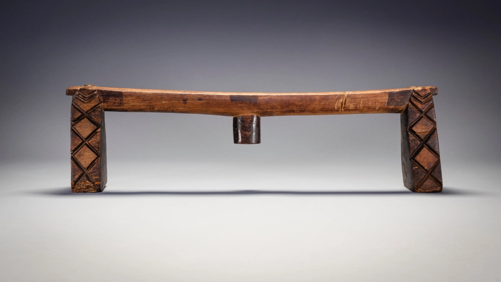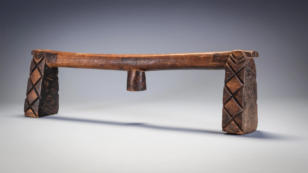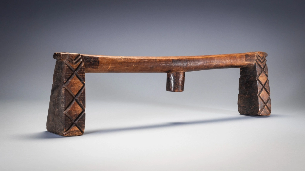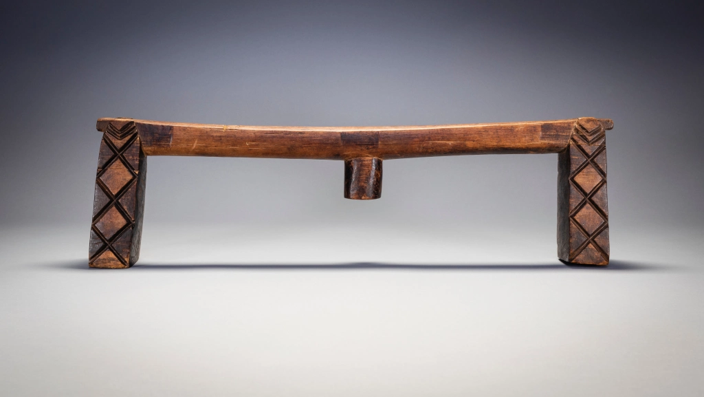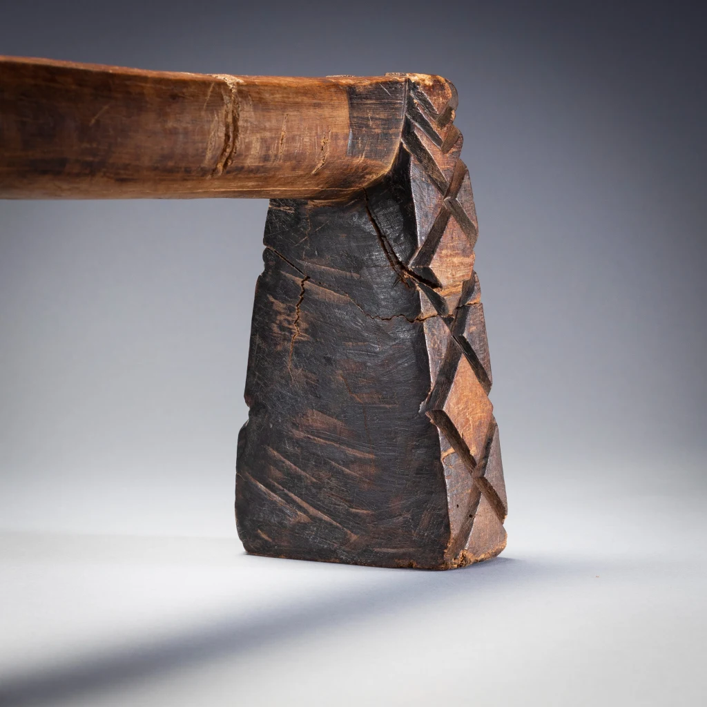 Un appui-tête swazi doté d’une plate-forme extrêmement longue et d’un ergot centrale à facettes. Les pieds présentent des rainures de type swazi aux extrémités intérieures et extérieures, et des motifs en forme de diamant de type zoulou sur les côtés. Ce mélange de caractéristiques zouloues et swazies montre qu’il est originaire du sud de l’Eswatini. Il a en effet été collecté dans le sud de l’Eswatini par Gordon Crawford. Il est en bone place dans le livre Sicebile de Gordon Crawford.