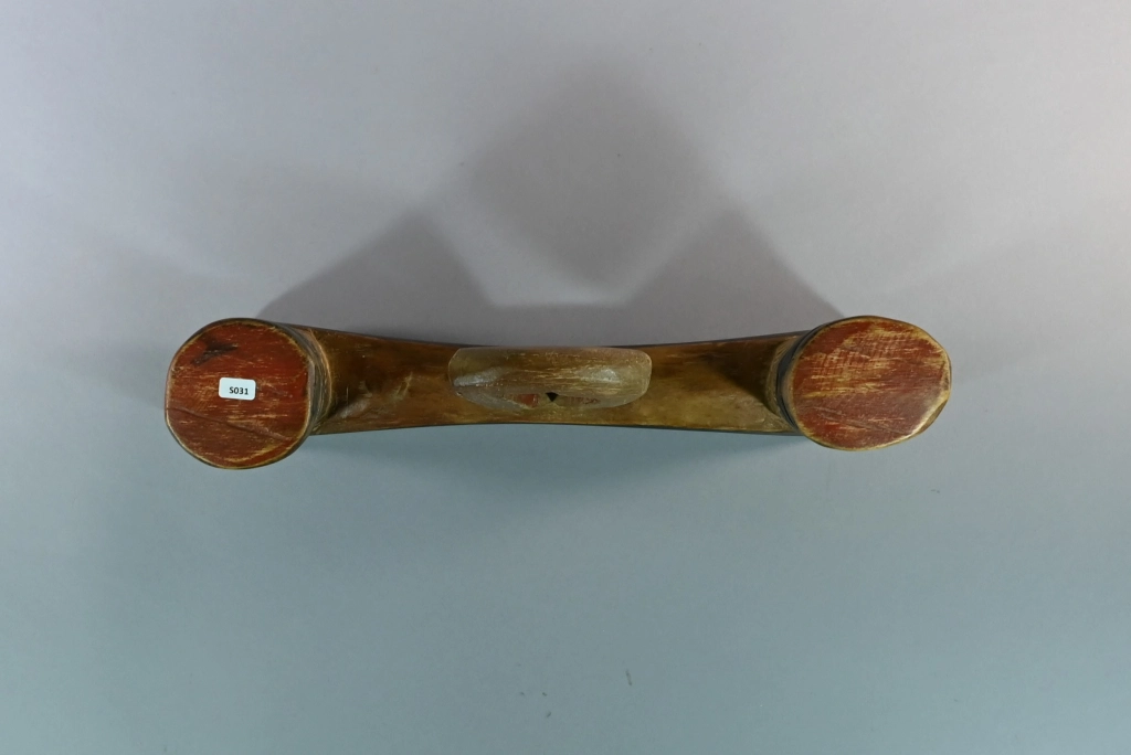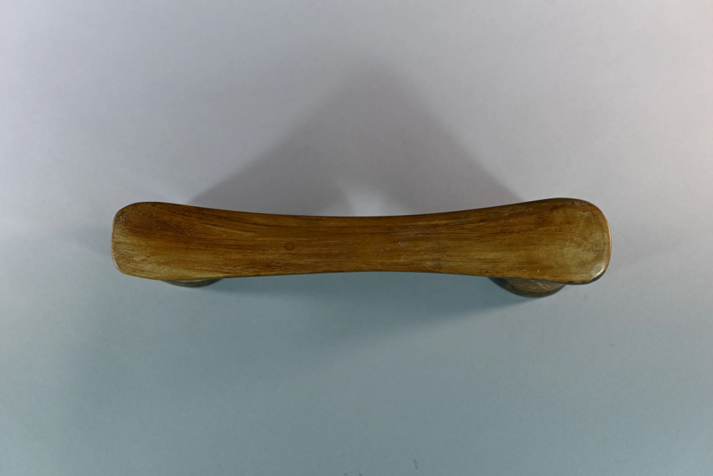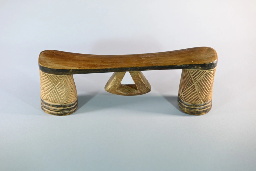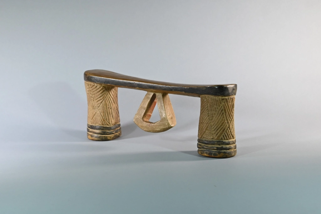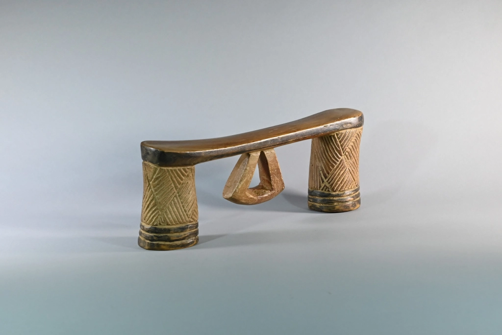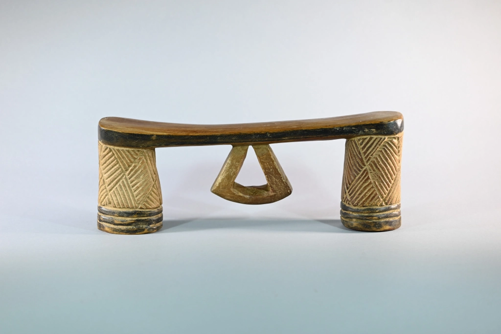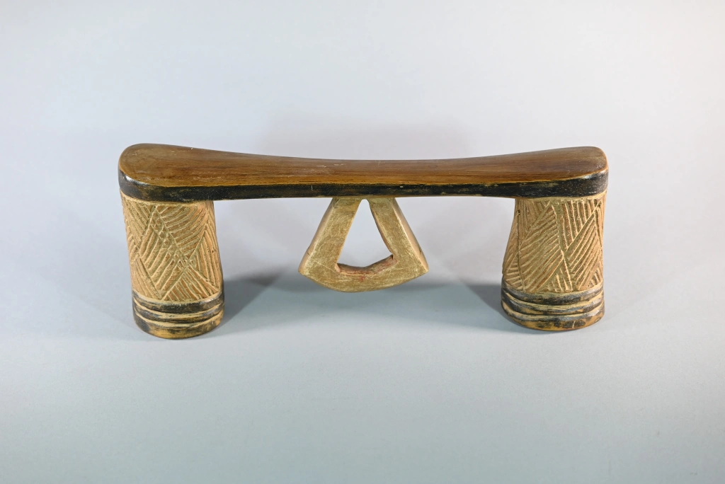 Une pièce atypique dès le premier coup d’œil. Son téton central triangulaire et évidé est une caractéristique particulièrement originale. Les deux pieds cylindriques, et non coniques, sont ornés de striures formant des triangles juxtaposés, encadrés à leur base par des cercles noirs et délimités par une barre d’appui noircie sur la tranche. Cette conception singulière témoigne du savoir-faire du sculpteur, dont l’identité reste malheureusement inconnue. Cette pièce a été collectée à Manhayane, une ville desservant la chefferie de Veleziweni, proche de la capitale Manzunu, en Eswatini, dans la zone du Haut Veld.