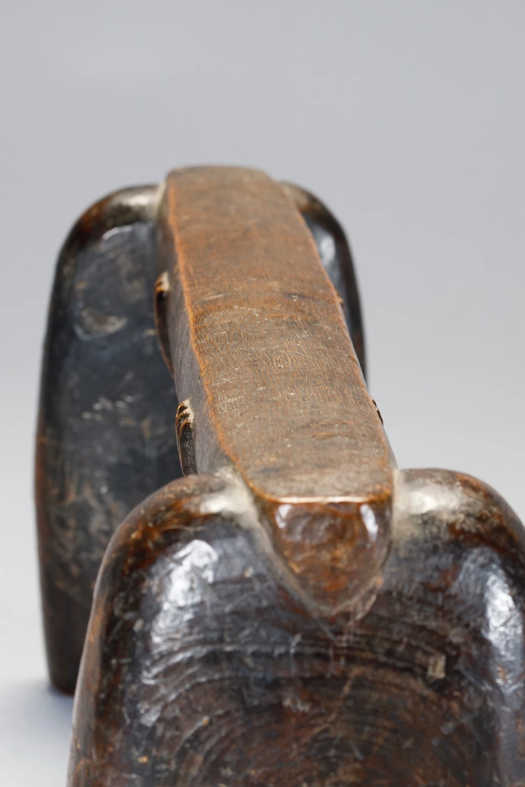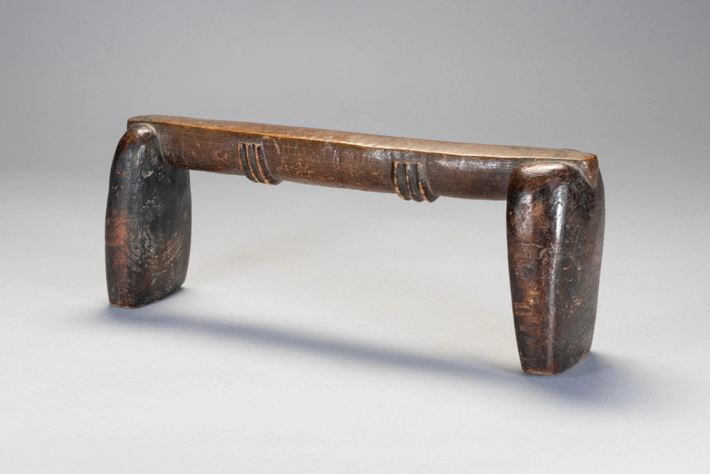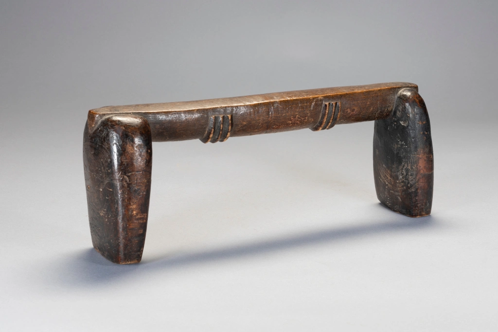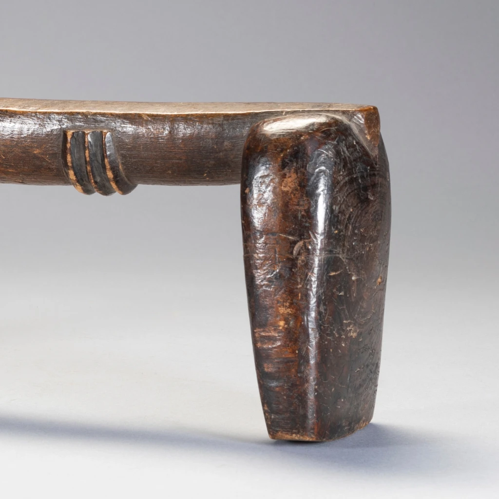 Nous avons peu d’informations sur cette pièce extrêmement rare et âgée. Elle comporte plusieurs particularités jamais rencontrées chez aucune autre collection : tout d’abord, ses pieds, d’une forme oblongue élégante ne ressemblent ni aux pieds swazis ni aux pieds Amasondo lisses. Enfin, les deux rangées de 3 cannelures sous la plateforme sont particulièrement esthétiques et réalisées avec une très haute technicité. Pour accroître au mystère de cette pièce, une étiquette est collée à l’extérieur d’un pied indiquant « MADENIRLON – ZULULAND – S.AFRICA ». Un certain nombre de tests pourraient situer cette pièce début ou mi-XIXe siècle. Son esthétique et ses caractéristiques nous la font classer avec certitude dans la catégorie des appuis-tête swazis.
