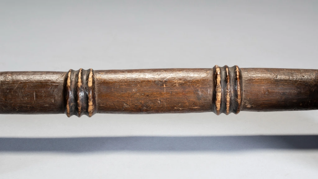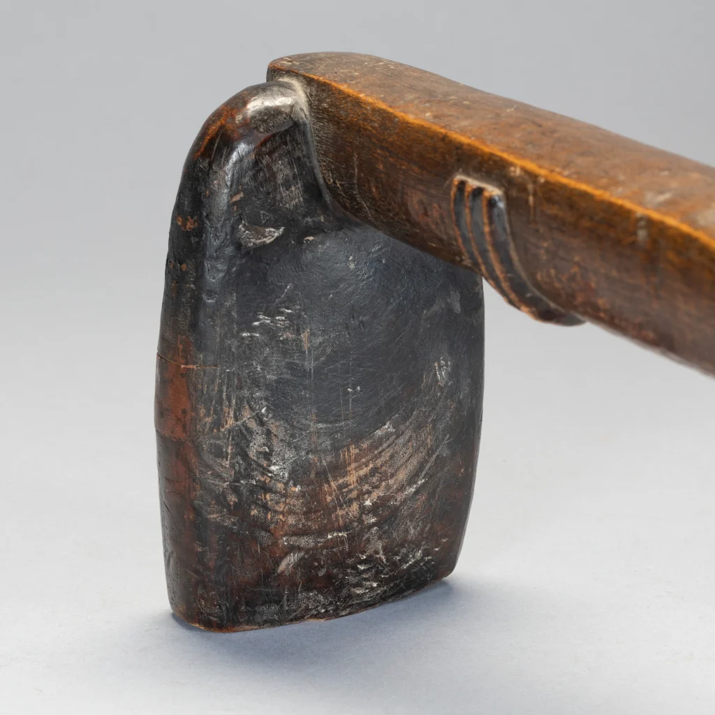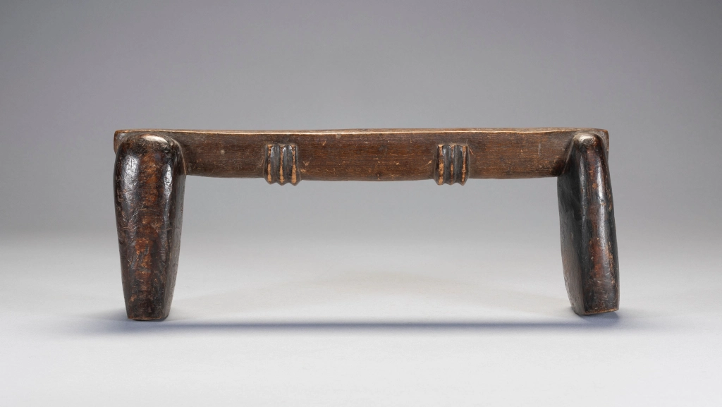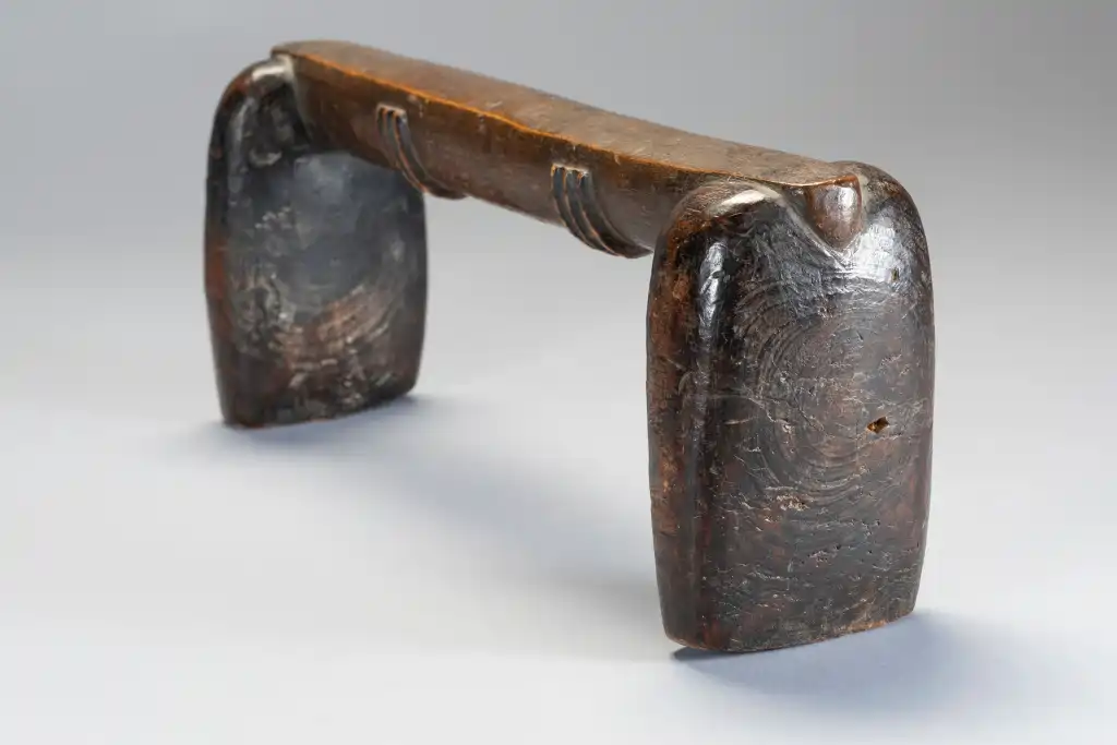 Nous avons peu d’informations sur cette pièce extrêmement rare et âgée. Elle comporte plusieurs particularités jamais rencontrées chez aucune autre collection : tout d’abord, ses pieds, d’une forme oblongue élégante ne ressemblent ni aux pieds swazis ni aux pieds Amasondo lisses. Enfin, les deux rangées de 3 cannelures sous la plateforme sont particulièrement esthétiques et réalisées avec une très haute technicité. Pour accroître au mystère de cette pièce, une étiquette est collée à l’extérieur d’un pied indiquant « MADENIRLON – ZULULAND – S.AFRICA ». Un certain nombre de tests pourraient situer cette pièce début ou mi-XIXe siècle. Son esthétique et ses caractéristiques nous la font classer avec certitude dans la catégorie des appuis-tête swazis.