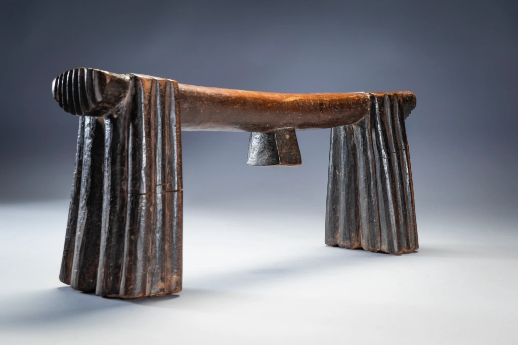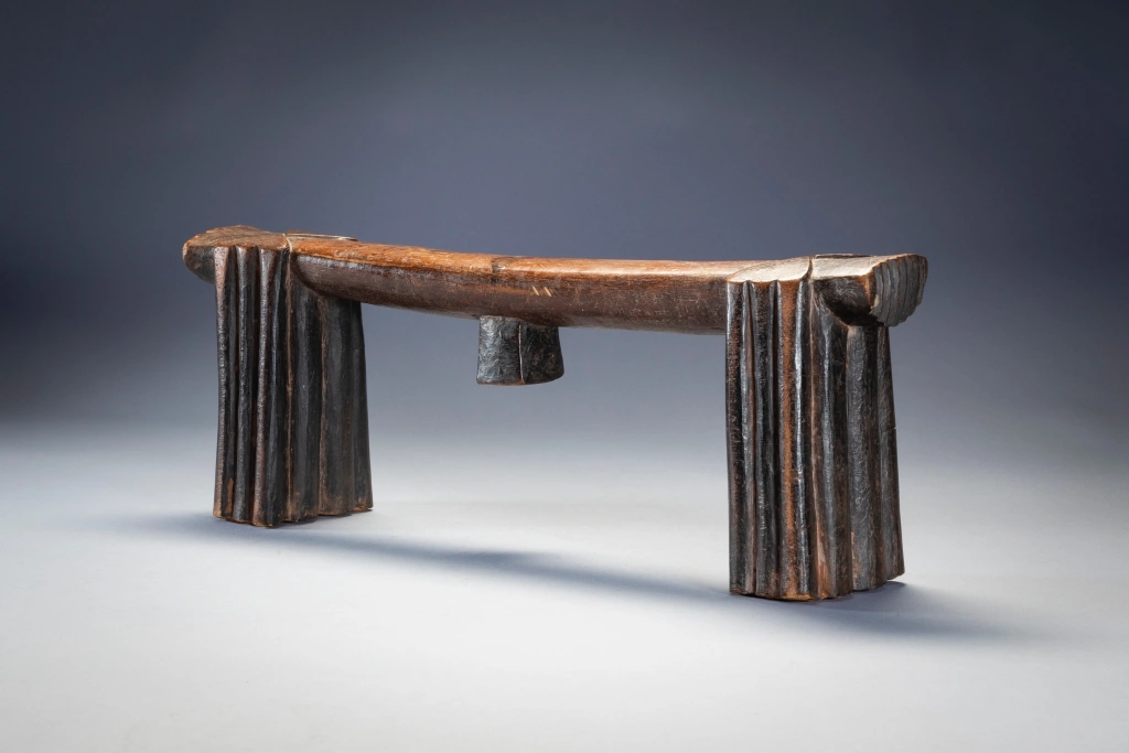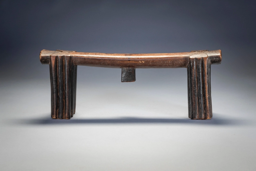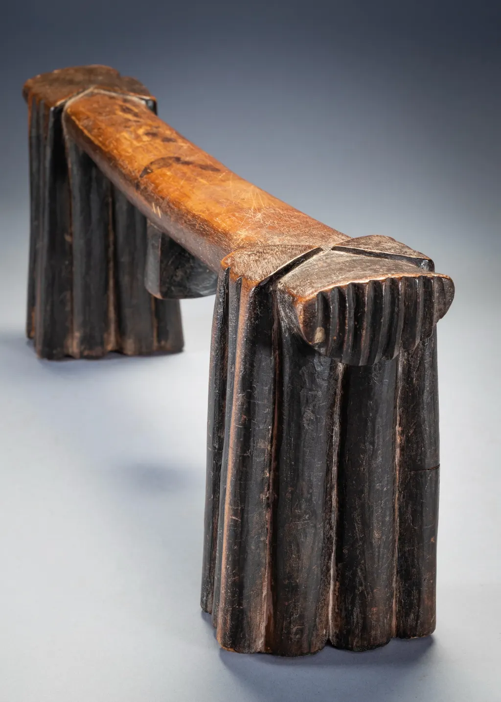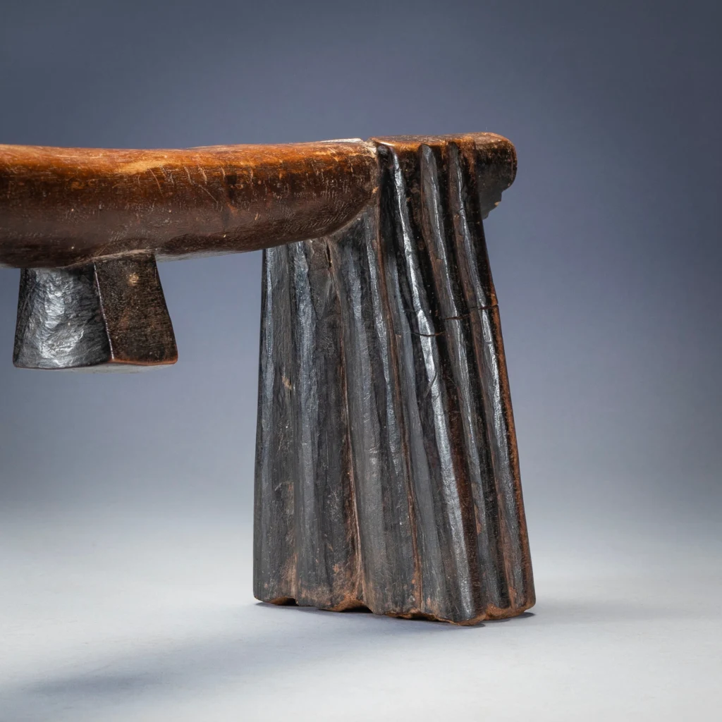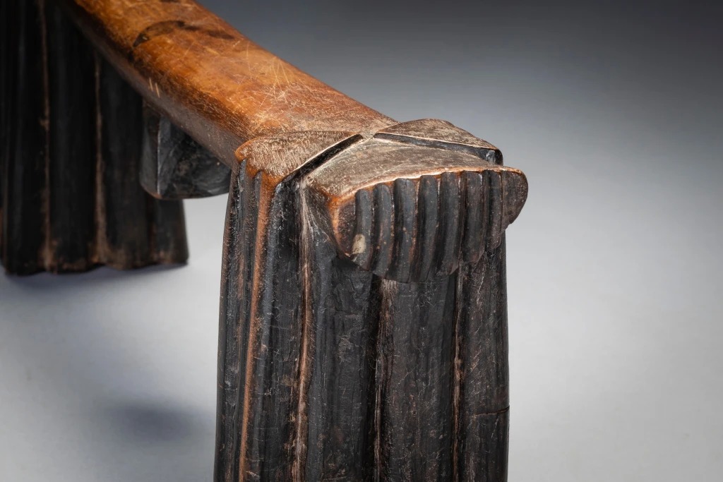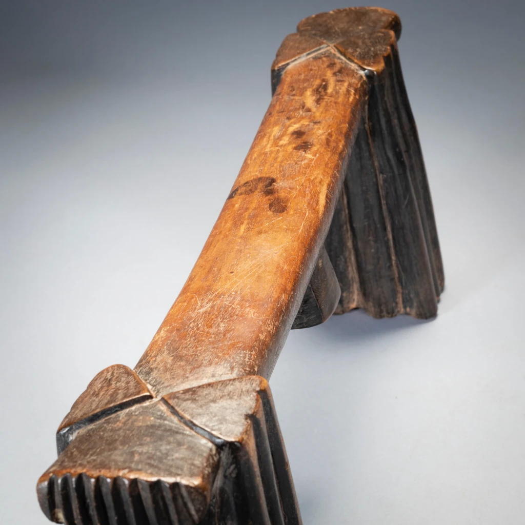 Un appui-tête du Swaziland, connu comme sicamelo ce type d’appui-tête a deux jambes, une à chaque extrémité de la barre transversale, similaire au style des voisins zoulous. La face inférieure de la traverse comprend une protubérance de la cosse au centre, souvent utilisée comme une poignée. Invariablement, les jambes sont cannelées avec de rainures verticales de balayage. Il est important de noter la section carrée du téton, ce qui est assez rare.