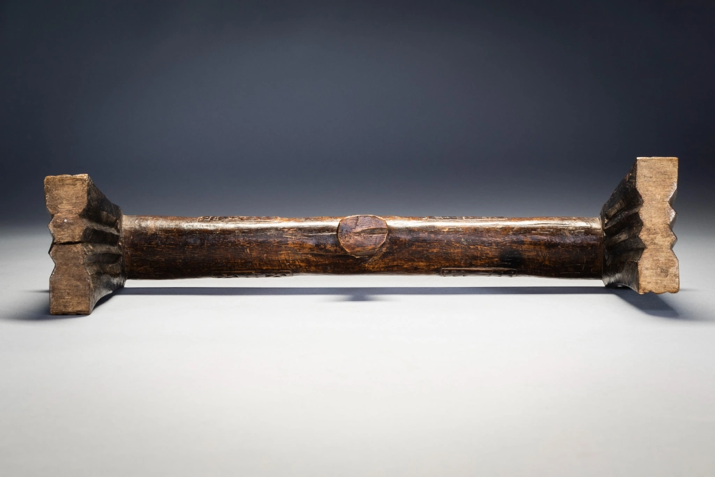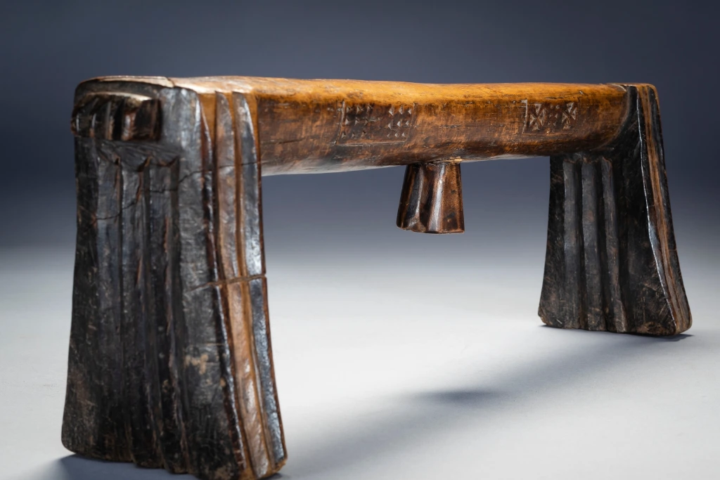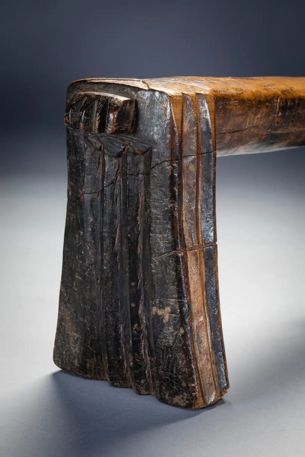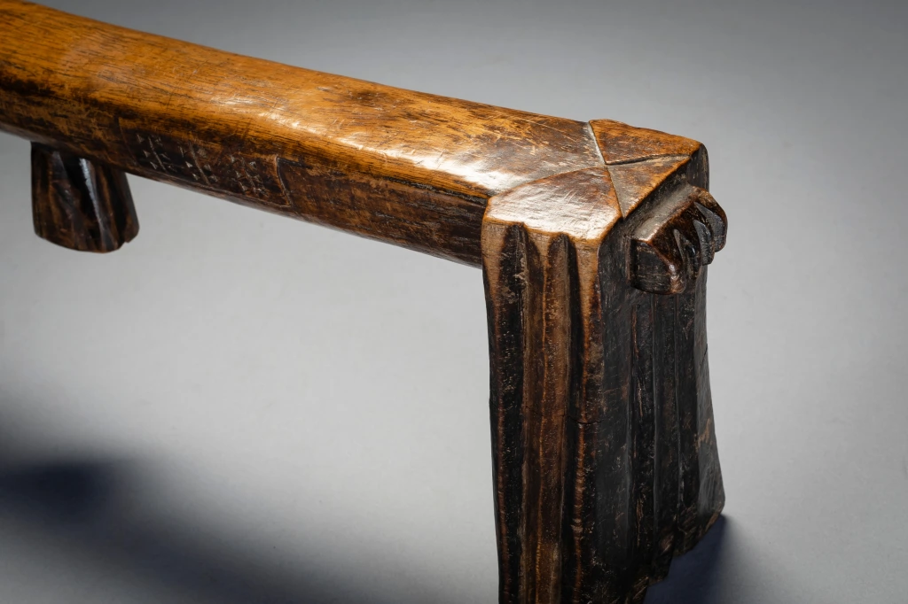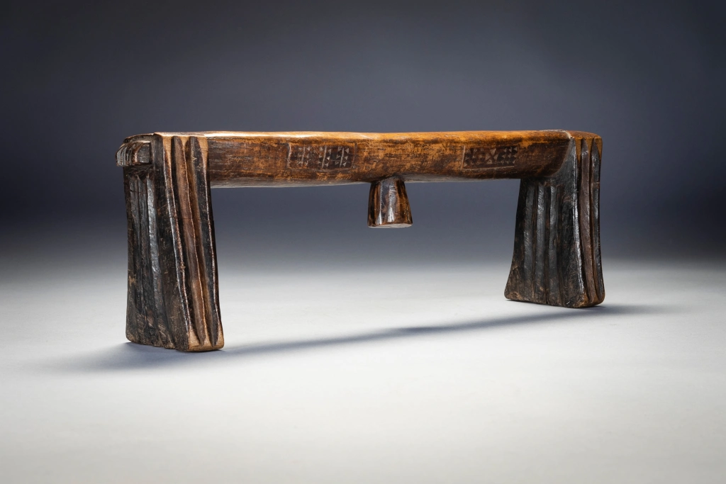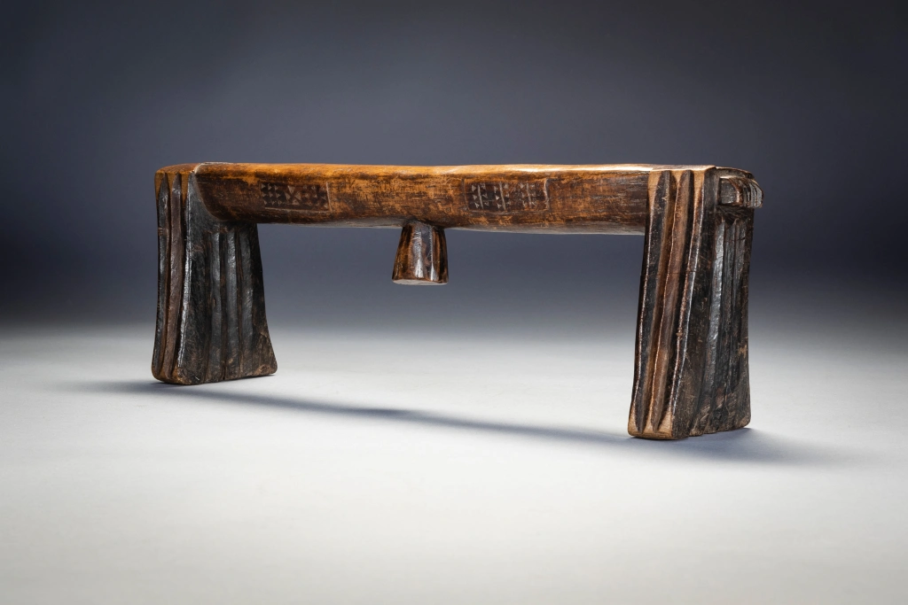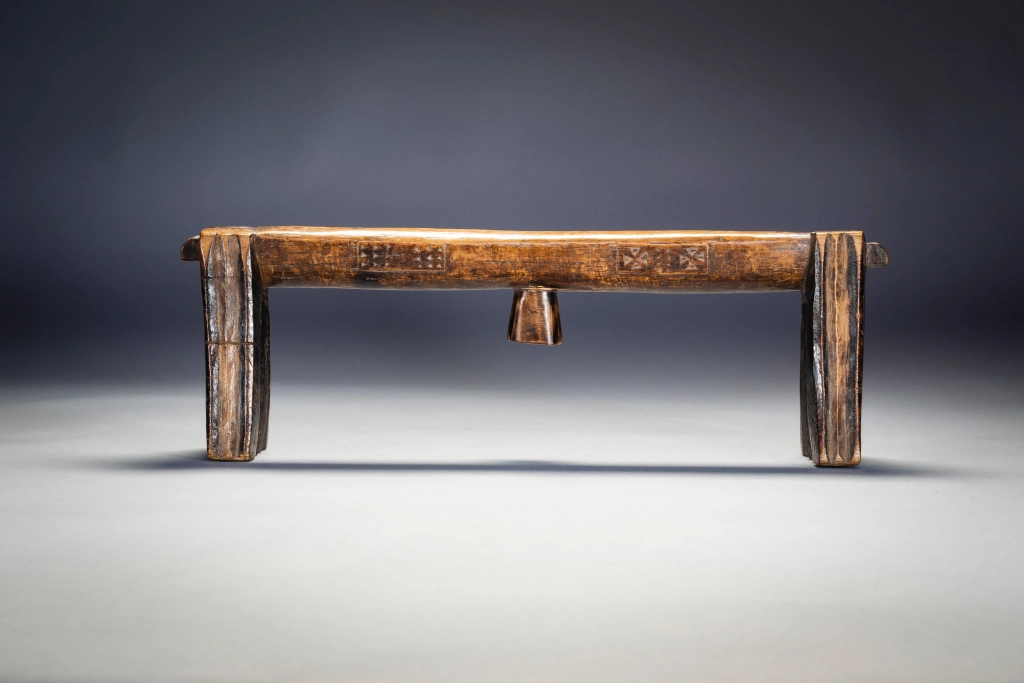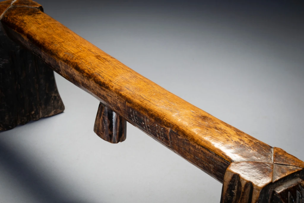 Un appui-tête swazi qualifié d’ « Embossed patern » selon Gordon Crawford. Les engravures sont de part et d’autre du téton et sur les deux faces de la plateforme. Il faut noter que la section du téton est ovale ce qui est assez particulier.