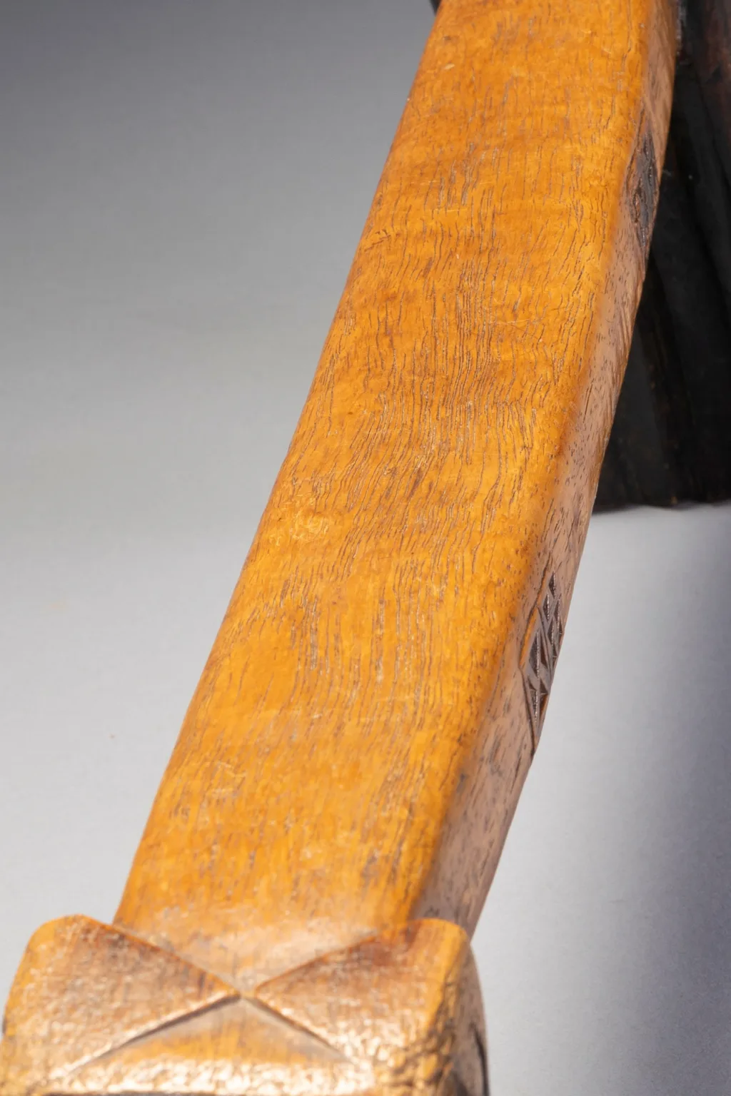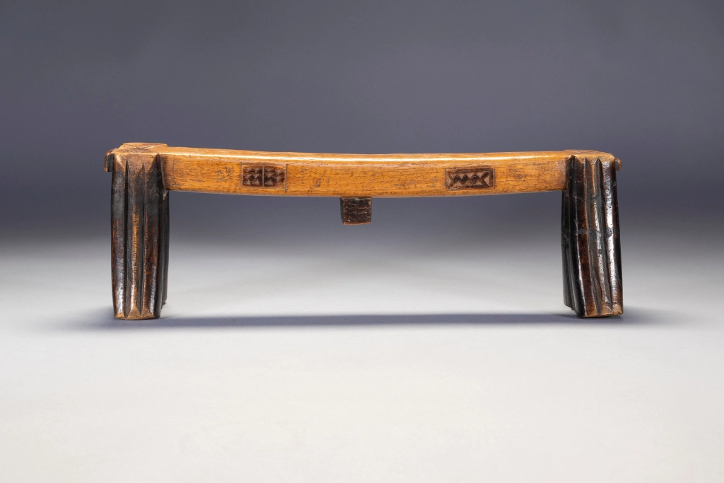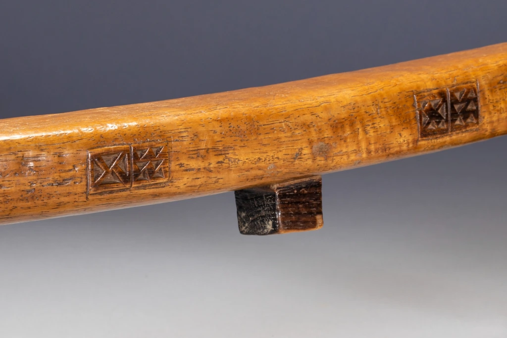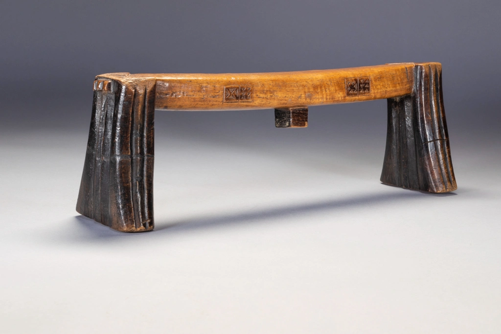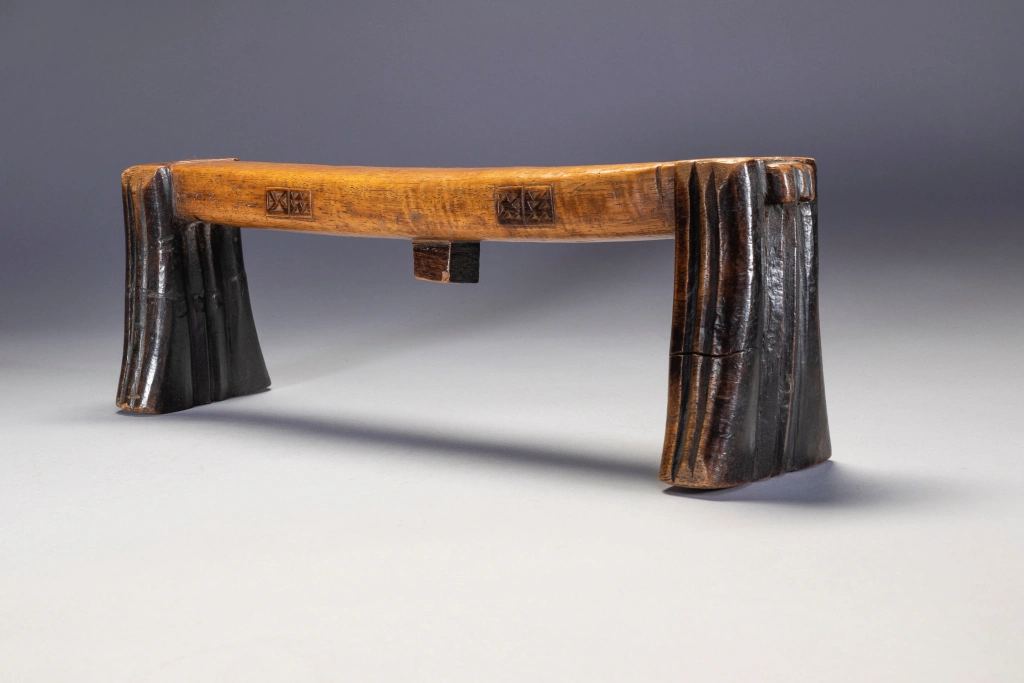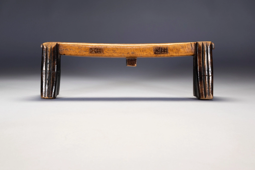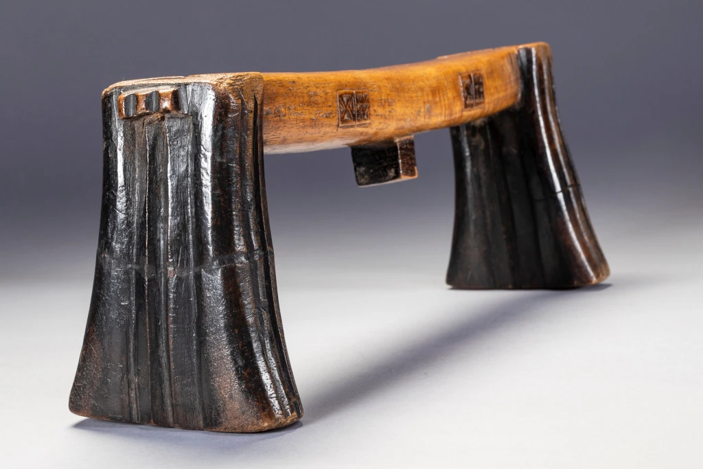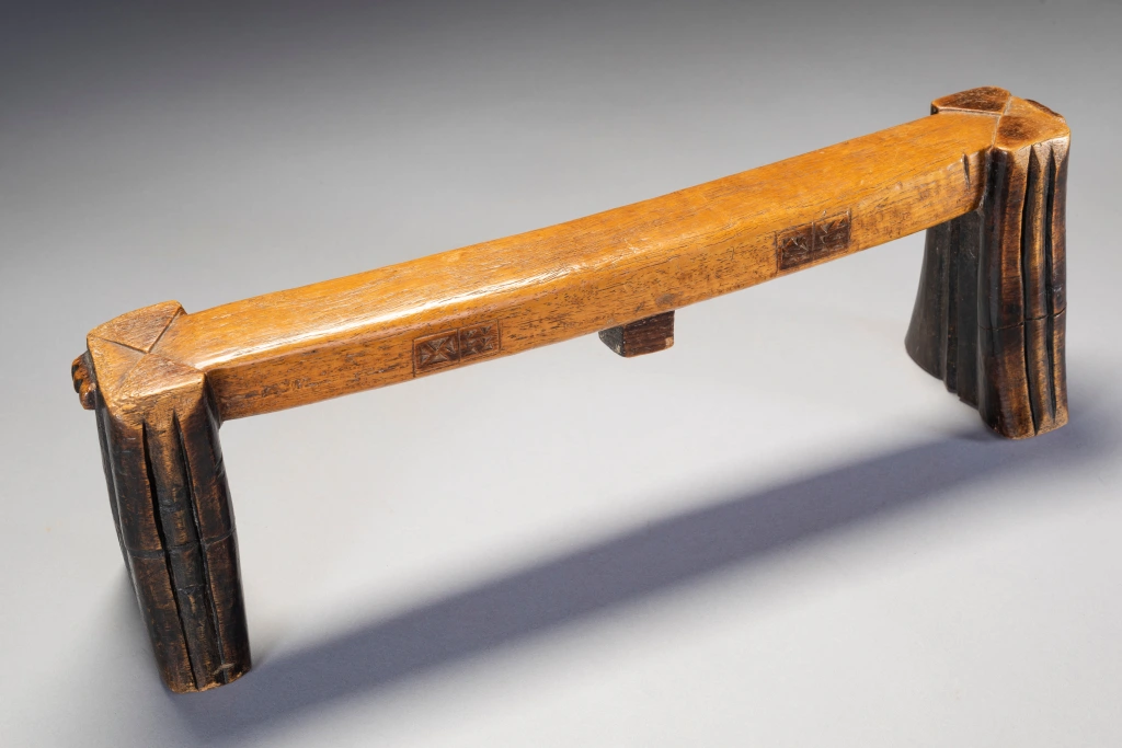 Un appui-tête avec des pyrogravures sur les deux côtés d’une plateforme parfaitement symétrique. Les engravures sont très foncées et ressortent bien grâce à la couleur miel claire et patinée de la plateforme. Il faut noter que la section carrée du téton est une caractéristique peu fréquente.