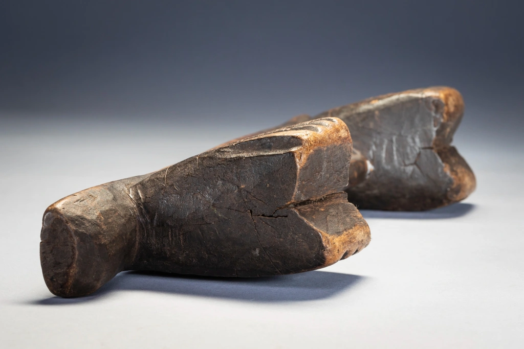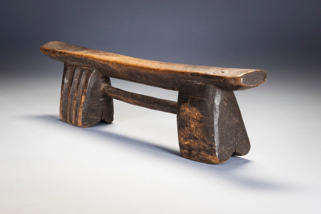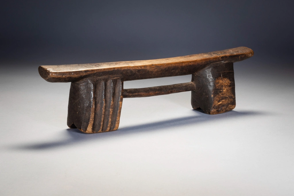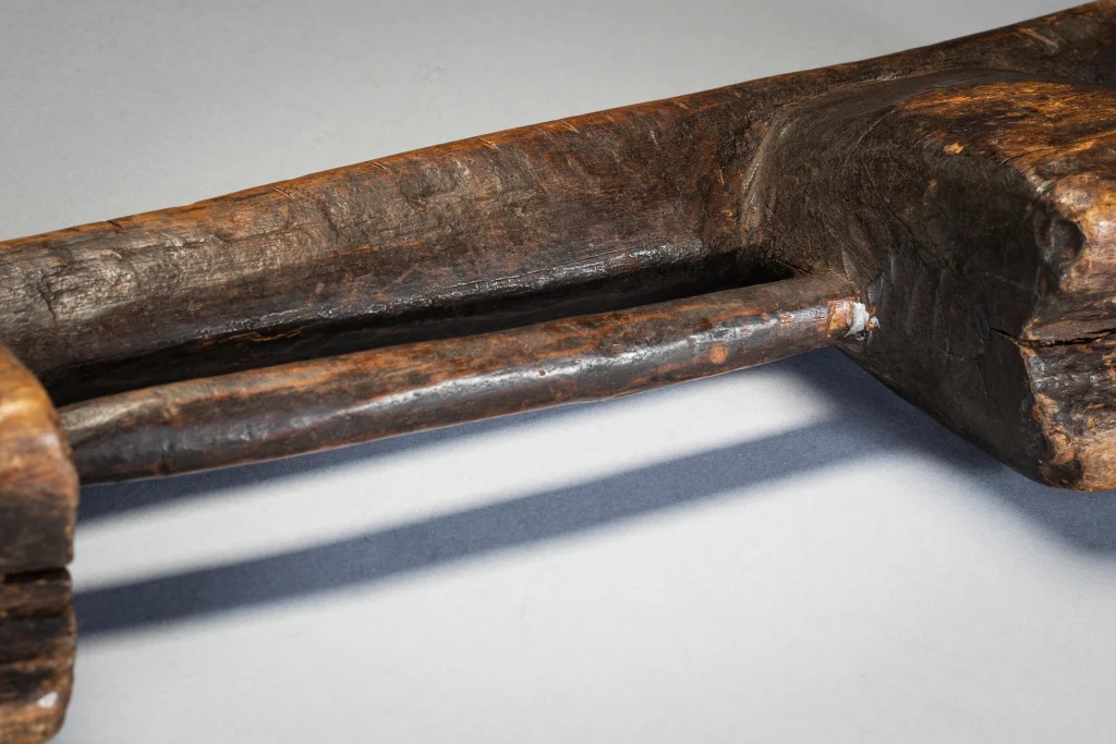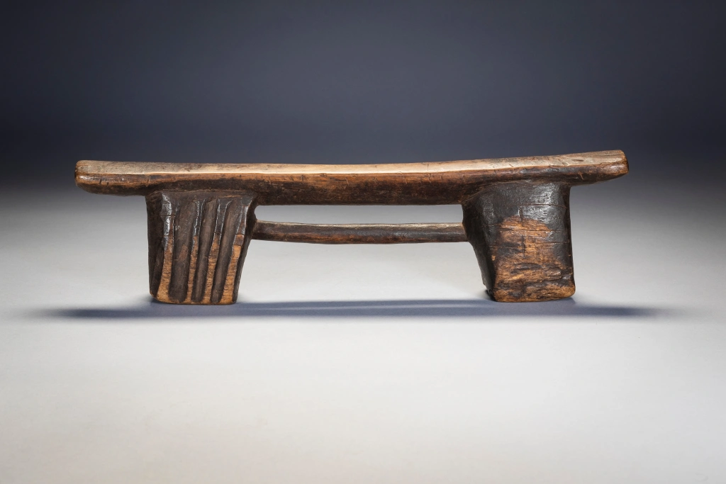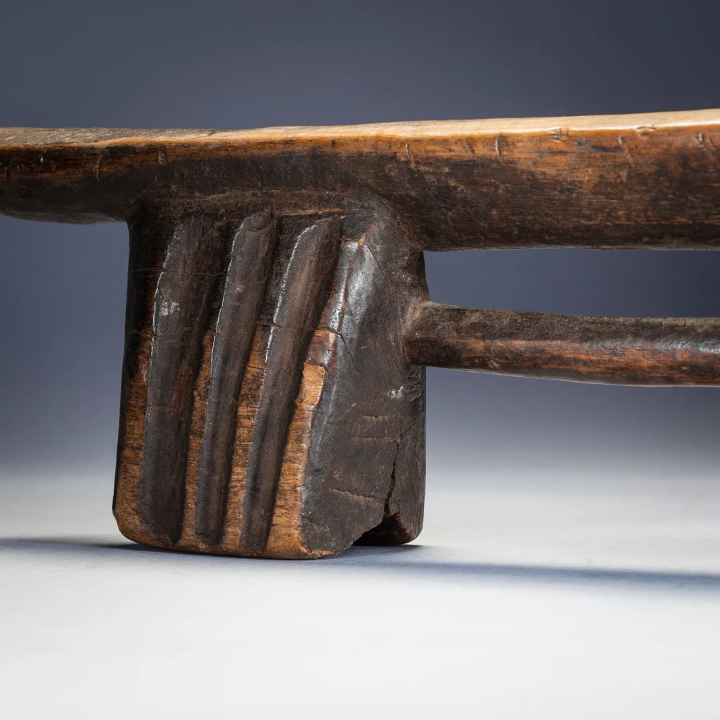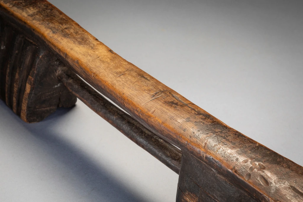 Une pièce rustique qui dégage une force primaire. Elle est d’un style mixte: D’abord swazi, avec ses pieds cannelées , mais aussi zoulou par son profil trapu et sa barre parallèle à la barre d’appui.
