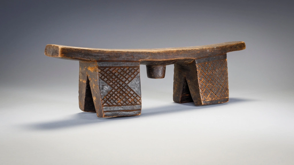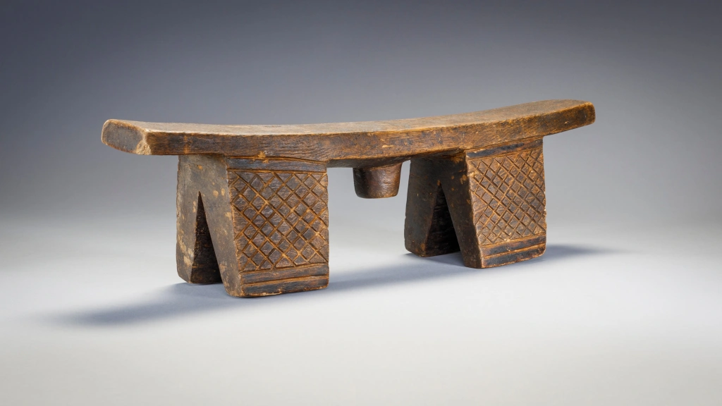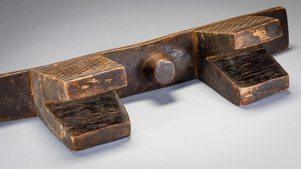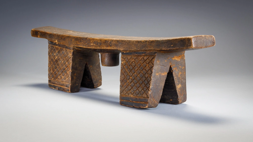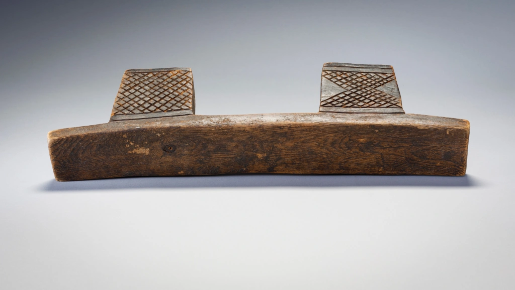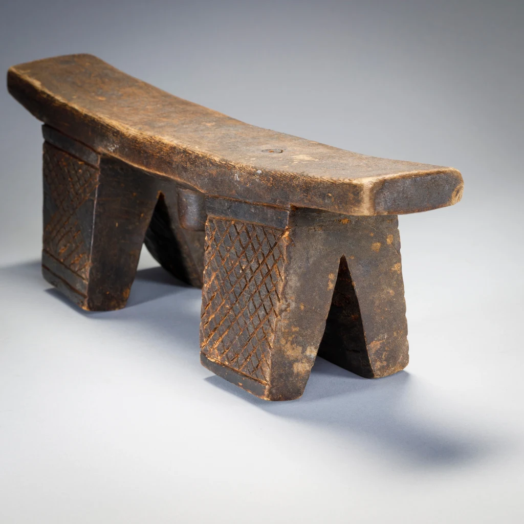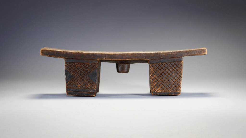 Le mélange des influences swazi et zoulou saute aux yeux. Le téton et l’amasumpa cohabite sur cette pièce solide et trapue. La barre d’appui est légèrement courbée pour un meilleur confort lors du repos.