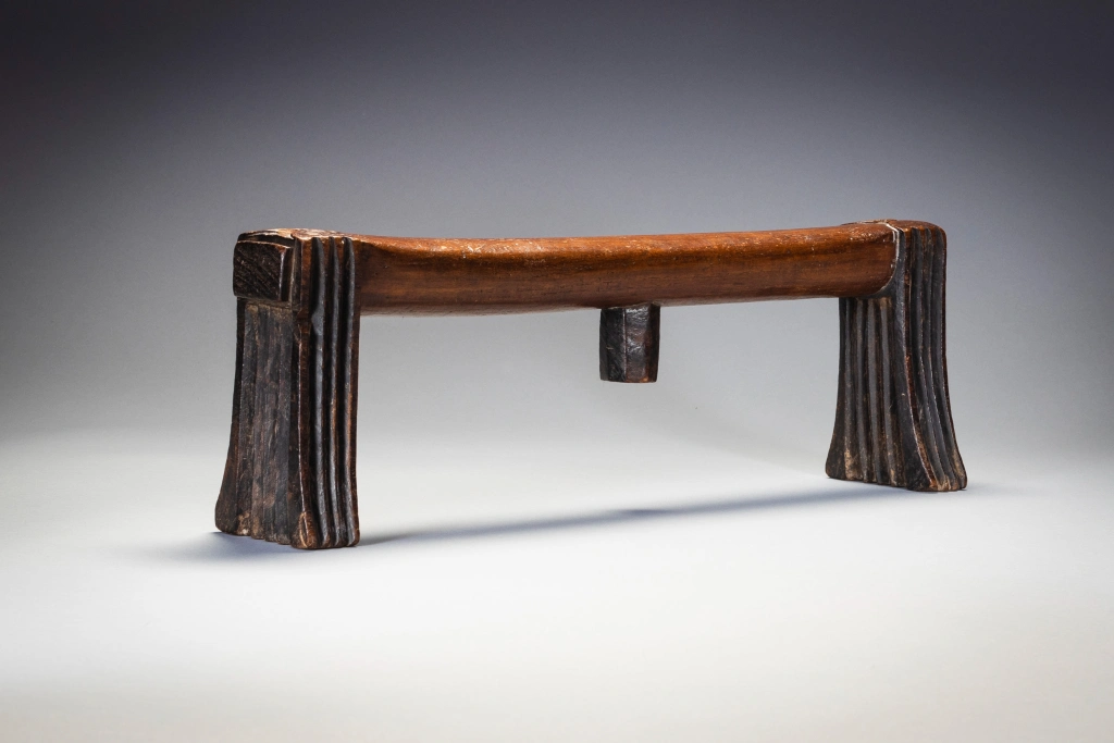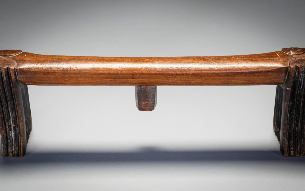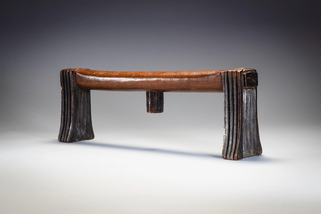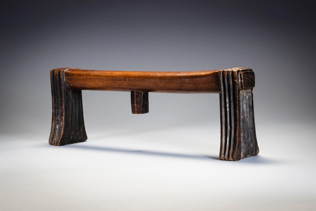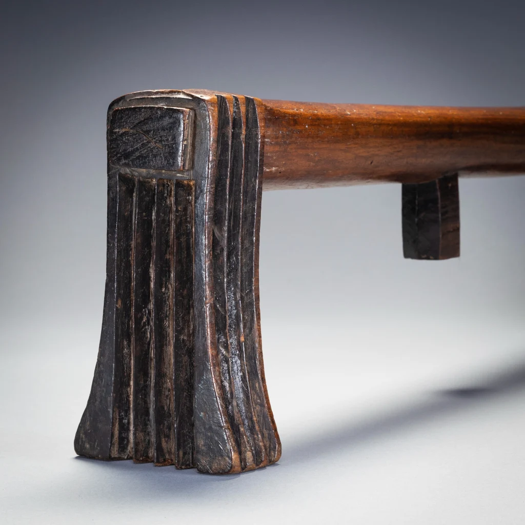 Un puissant appui-tête avec une superbe patine miel. Il possède également une barre quasiment de section circulaire avec à mi-distance un téton de section hexagonale. Sous ses deux pieds, des engravures rectangulaires sont creusées. Contrairement à ce que certains vendeurs prétendent, cela est en aucune sorte une marque d’appartenance à une famille royale. En effet, ces engravures seraient les signatures d’un sculpteur ou d’une école de sculpteurs ayant produit des pièces durant la première partie du XXe siècle.