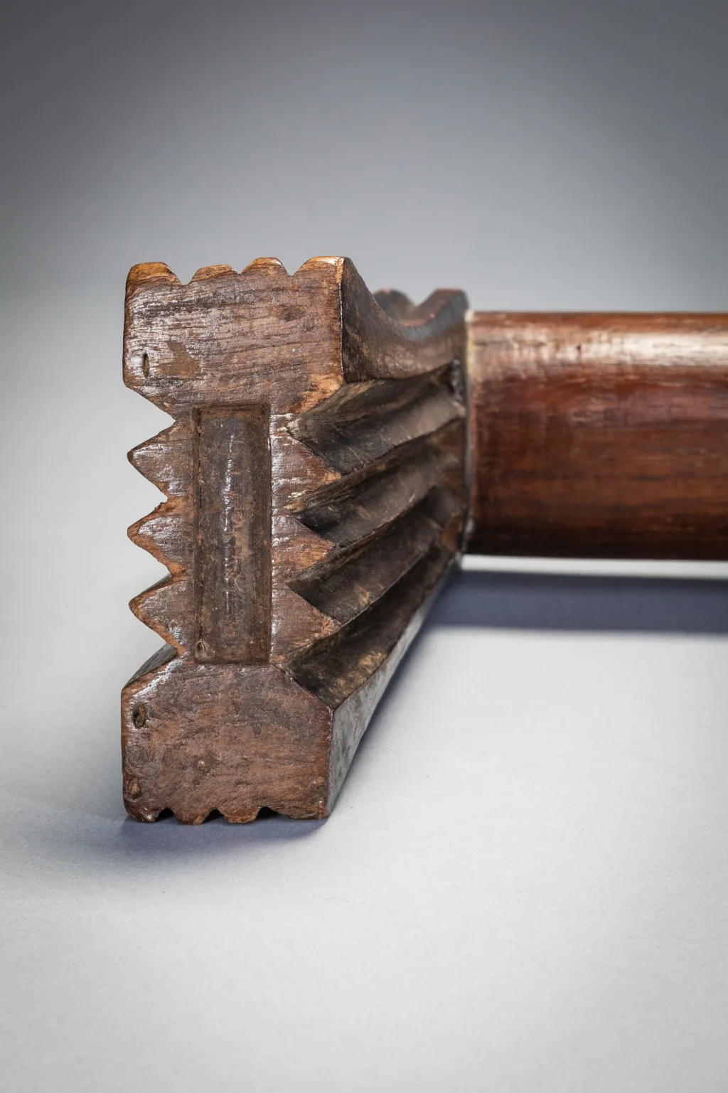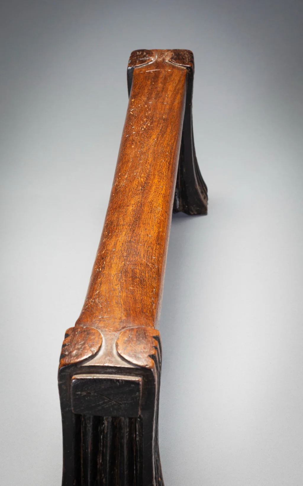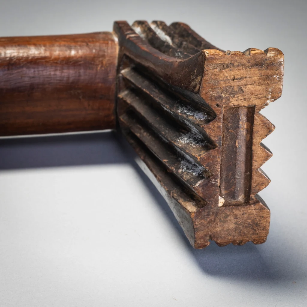 Un puissant appui-tête avec une superbe patine miel. Il possède également une barre quasiment de section circulaire avec à mi-distance un téton de section hexagonale. Sous ses deux pieds, des engravures rectangulaires sont creusées. Contrairement à ce que certains vendeurs prétendent, cela est en aucune sorte une marque d’appartenance à une famille royale. En effet, ces engravures seraient les signatures d’un sculpteur ou d’une école de sculpteurs ayant produit des pièces durant la première partie du XXe siècle.