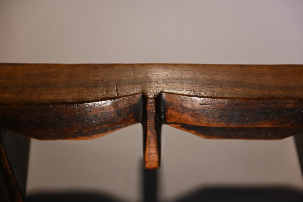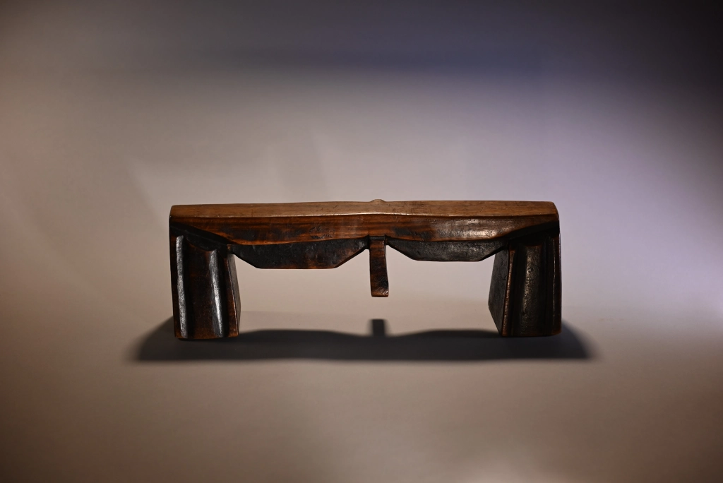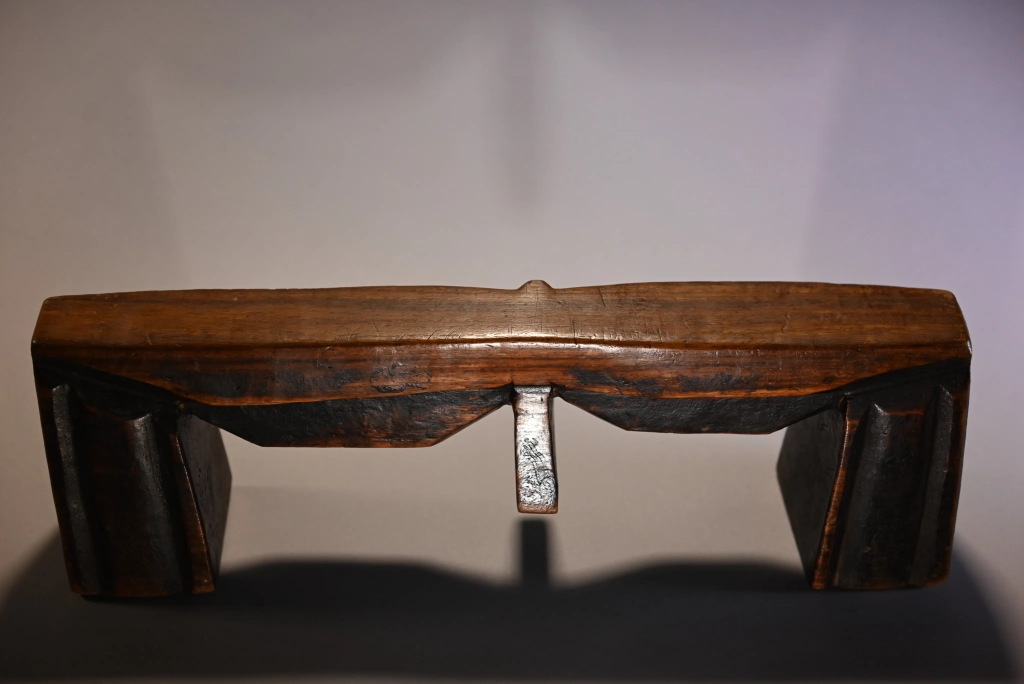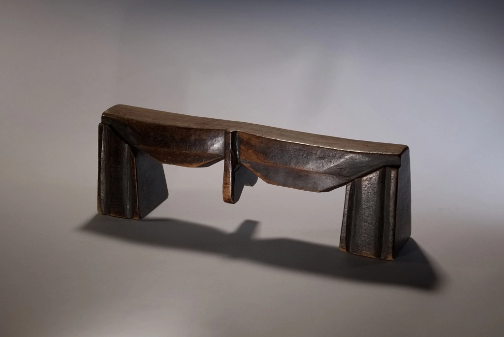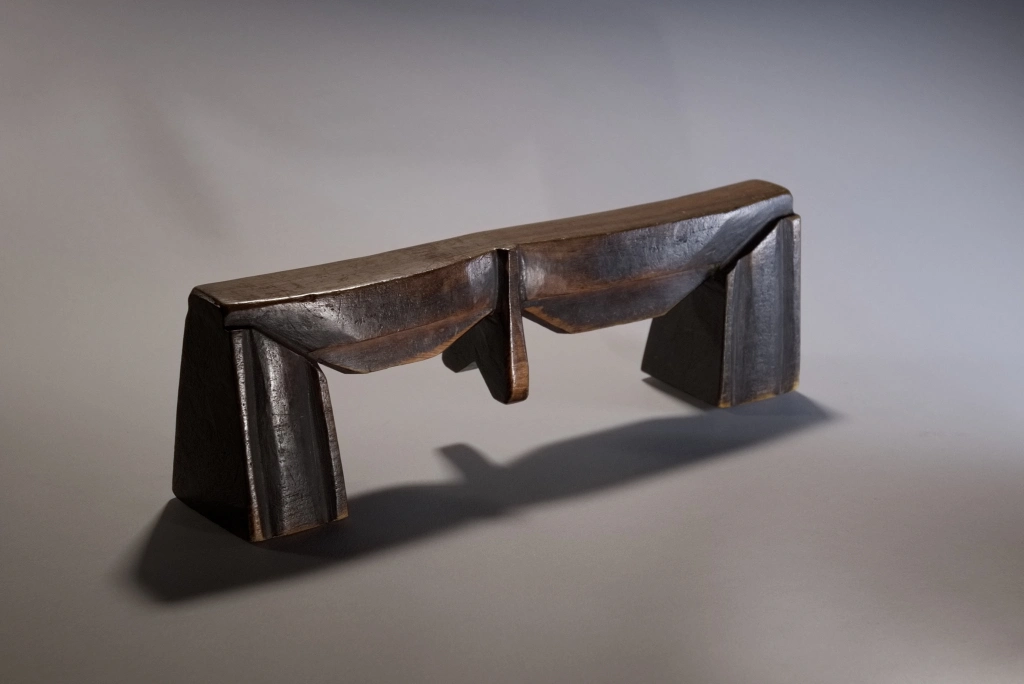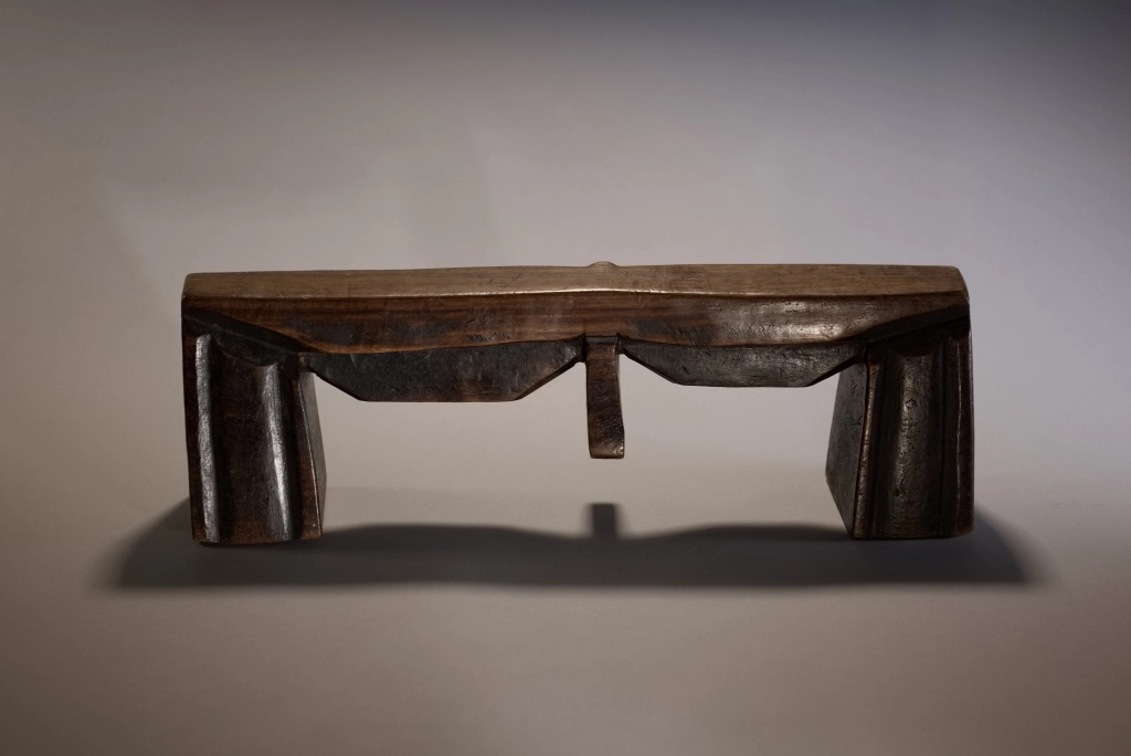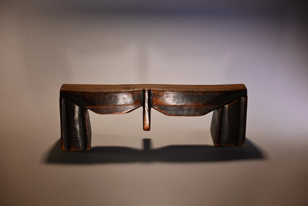Une pièce unique n’ayant aucune similitude avec la totalité des milliers de swazis examinée : Sa particularité provient, tout d’abord, de son téton axial. En forme de languette, lorsque l’on regarde la pièce de face et en forme de cœur lorsqu’on regarde la pièce d’une vue perpendiculaire. Ensuite, par les deux cannelures verticales de ses pieds et la cannelure horizontale sous la barre transversale, les deux donnent un aspect de dragée épuré et particulièrement esthétique. Le village d’origine et le sculpteur de cette pièce, du début du XIXe siècle, n’ont pas été retrouvés.