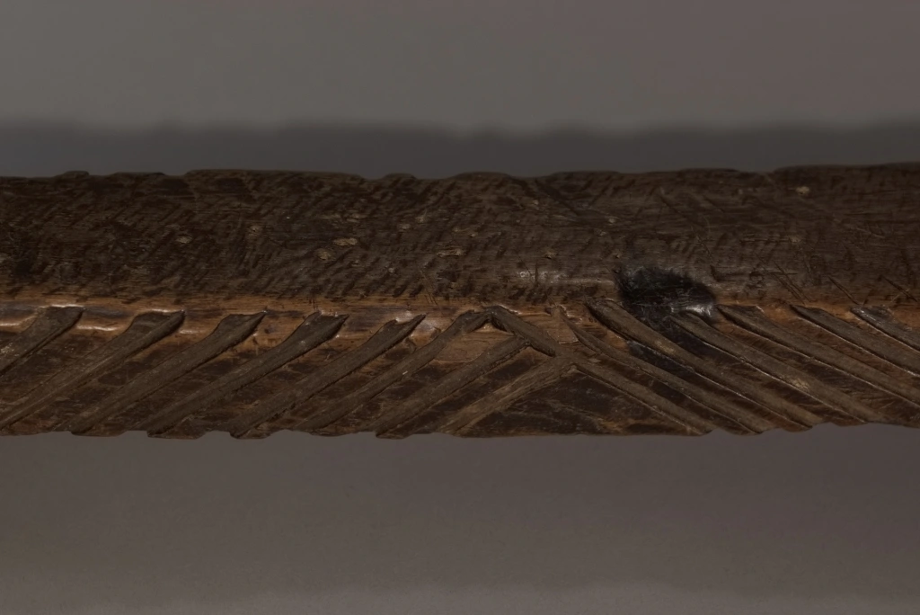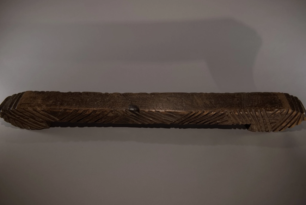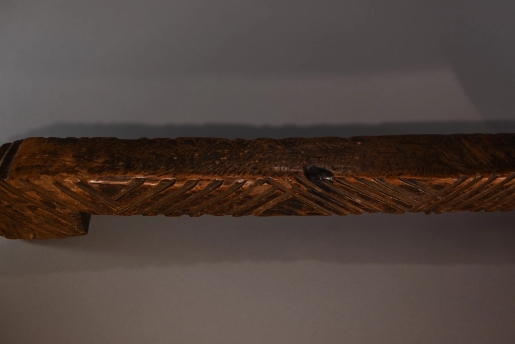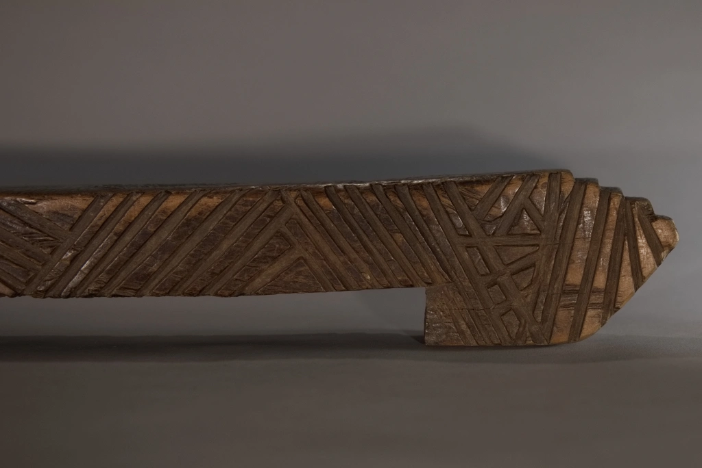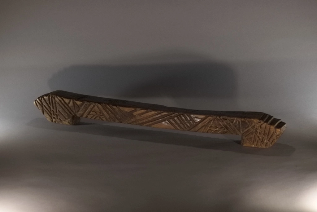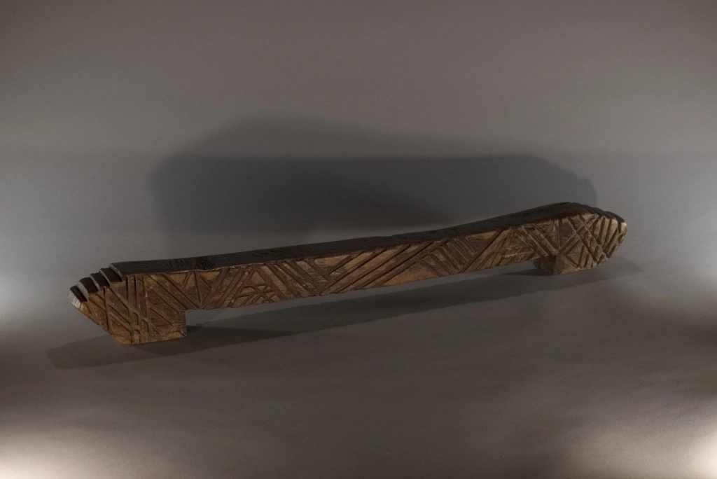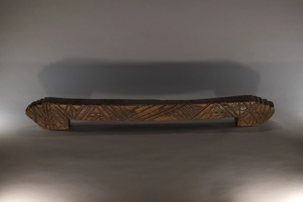 Une pièce muséale réalisée pour un couple. Bien que collectée en pays zoulou, cette pièce est, sans conteste, de style swazi ancestral existant depuis la fin du XVIIIe siècle. En bois massif, finement sculpté et avec des dessins tribaux. La patine brillante montre l’âge extérieur de la pièce. Sur ces pièces aussi vieilles, on note très souvent l’absence de tétons, l’absence d’oreilles et la présence de stries sculptée dans du bois de sang, typique de la région. Sa particularité se trouve dans sa faible hauteur (inférieure à 10 cm) ce qui est très rare et met en valeur la longueur ainsi que la finesse de cette pièce de 70 cm.