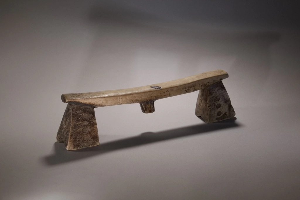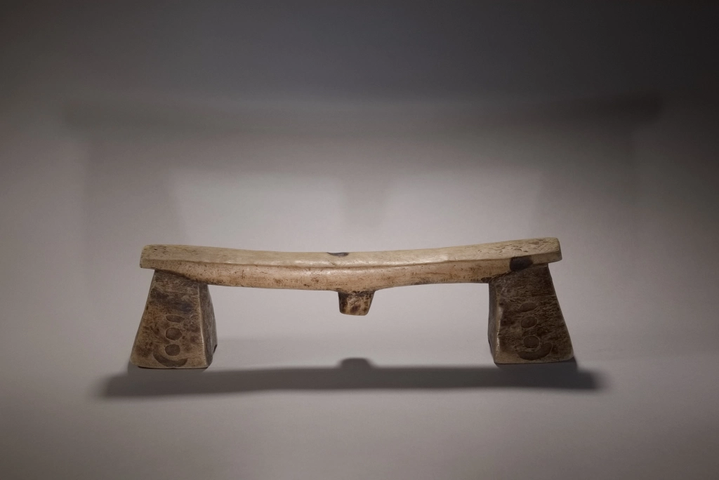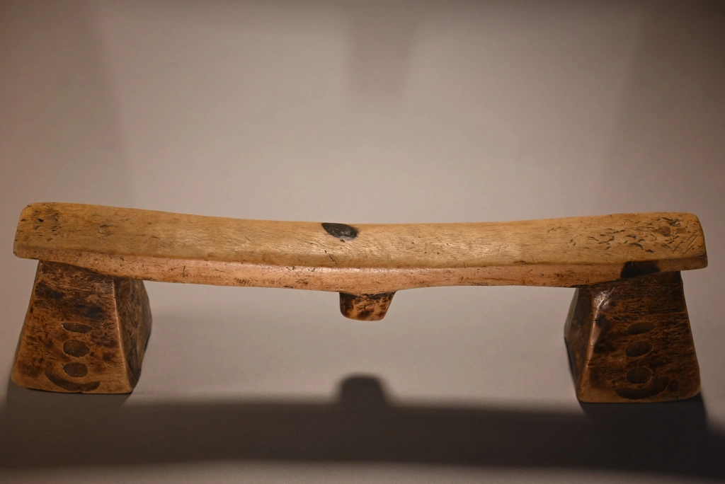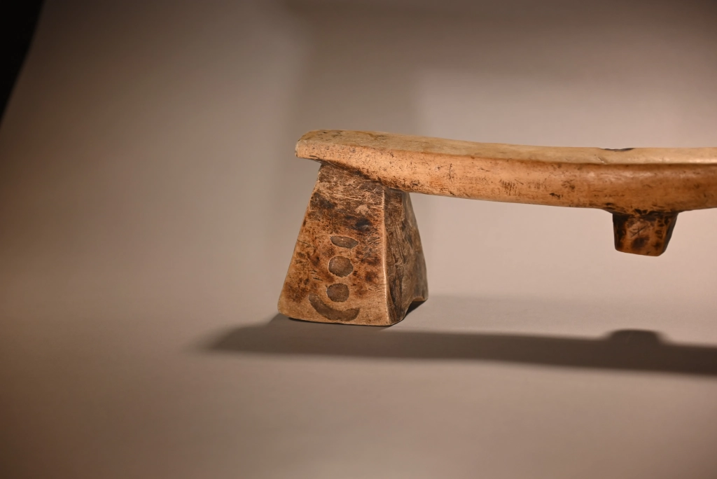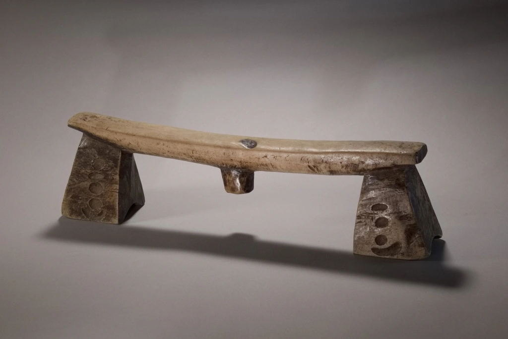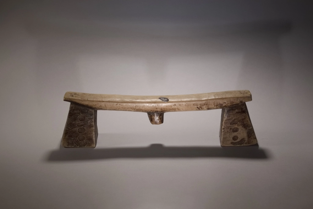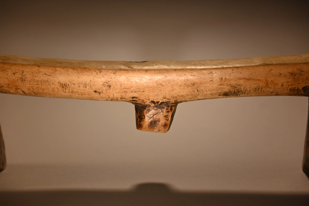Une pièce très atypique de par la couleur très claire de son bois, mais aussi par ses décorations, des petites cavités creusées par le sculpteur sur les pieds. Ces derniers sont évasés, épatés et ont la forme de sabots. L’originalité de cette pièce a donné lieu à une négociation longue et acharnée avec Michel Fascio qui était fortement attaché à cet appui-tête.