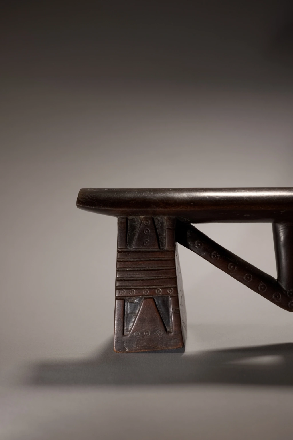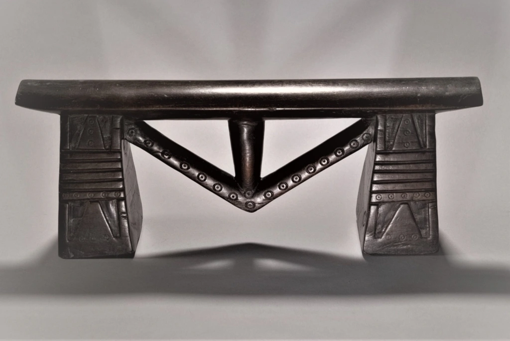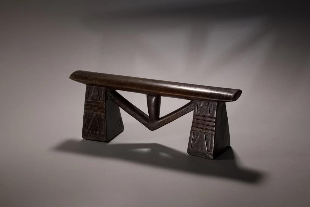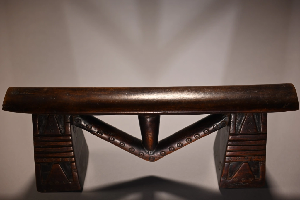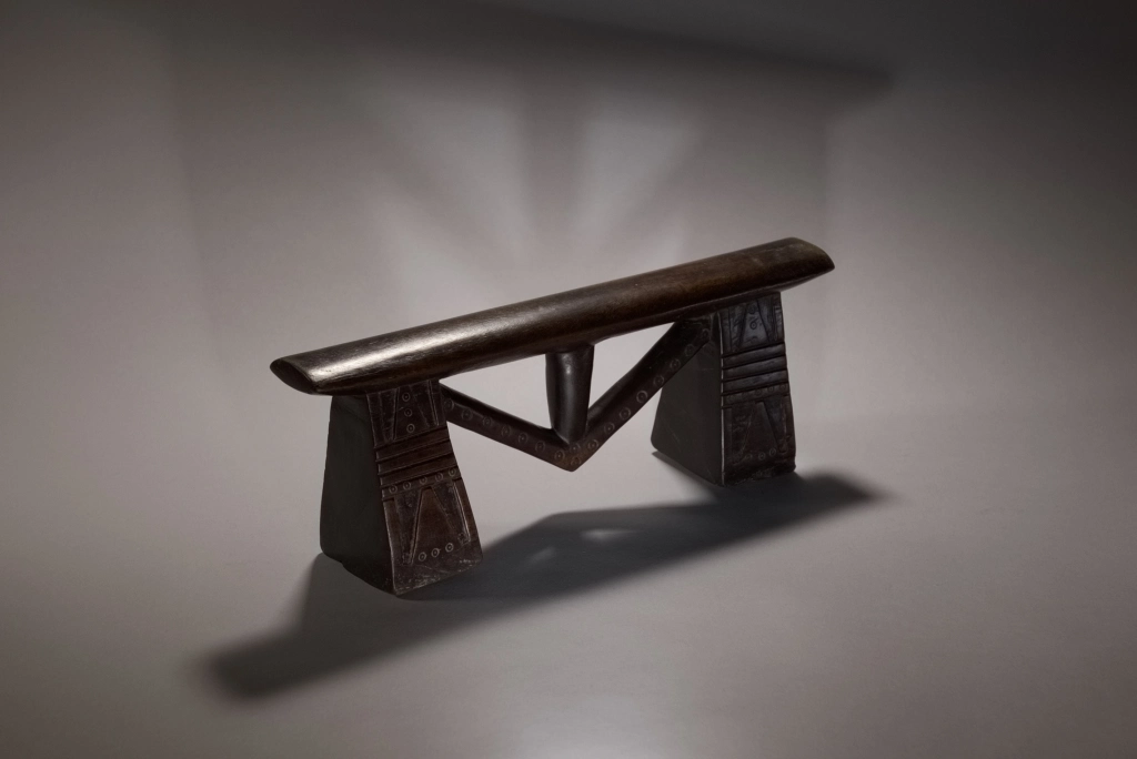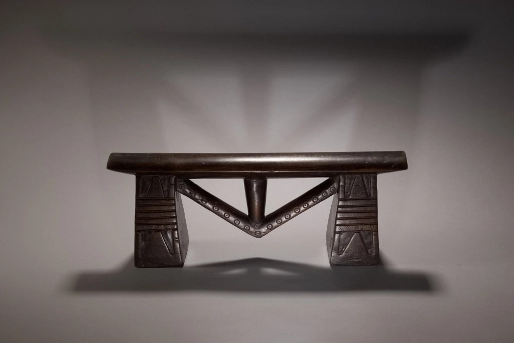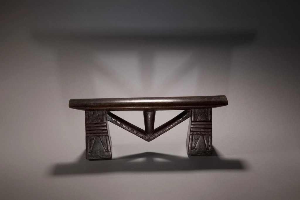 Un appui-tête swazi à flèche exceptionnel. Ses pieds sont incroyablement ciselés. On y aperçoit des alternances de stries horizontales et des engravures recouvert de décorations de poinçons qu’on retrouve également sur la flèche. La technique du sculpteur et la pureté du design en font une pièce largement muséale.