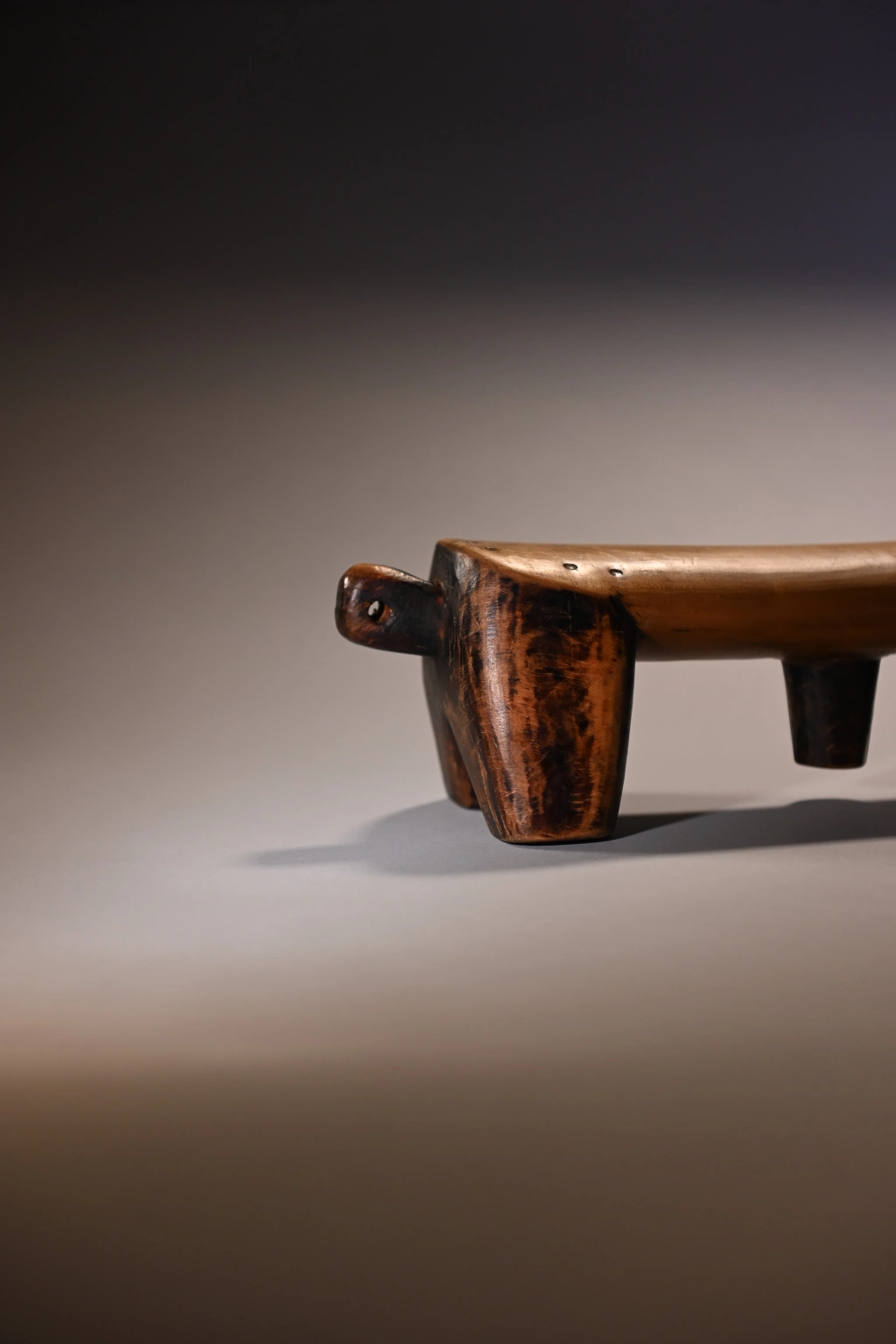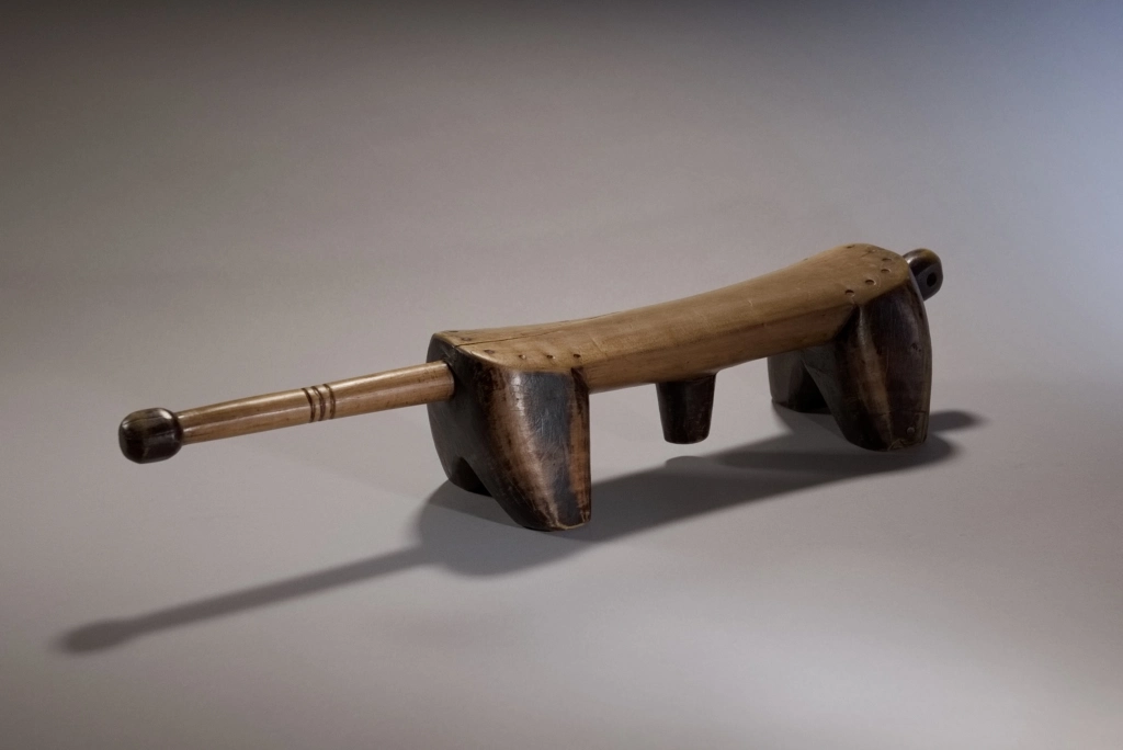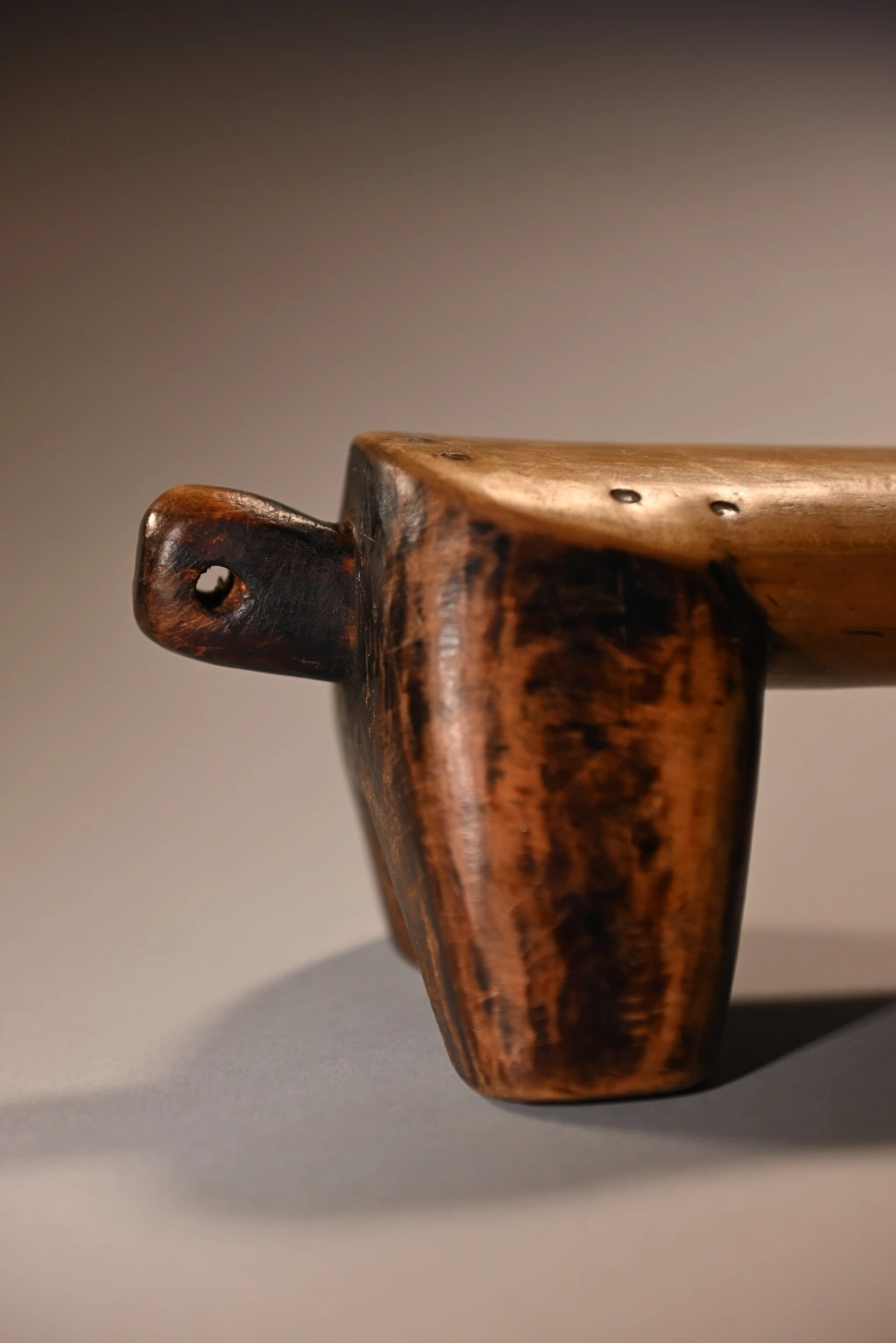 Cette pièce est un mix des styles swazi et zoulou. Elle a été trouvée à Pongola, dans le KwazuluNatal, mais à quelques kilomètres de la frontière de l’Eswatini. Cet appui-tête représente un quadrupède stylisé avec une petite tête sphérique noire au bout d’un cou étiré ainsi qu’une queue représentée par une boule noire, ou l’inverse, à l’imagination de chacun de choisir.