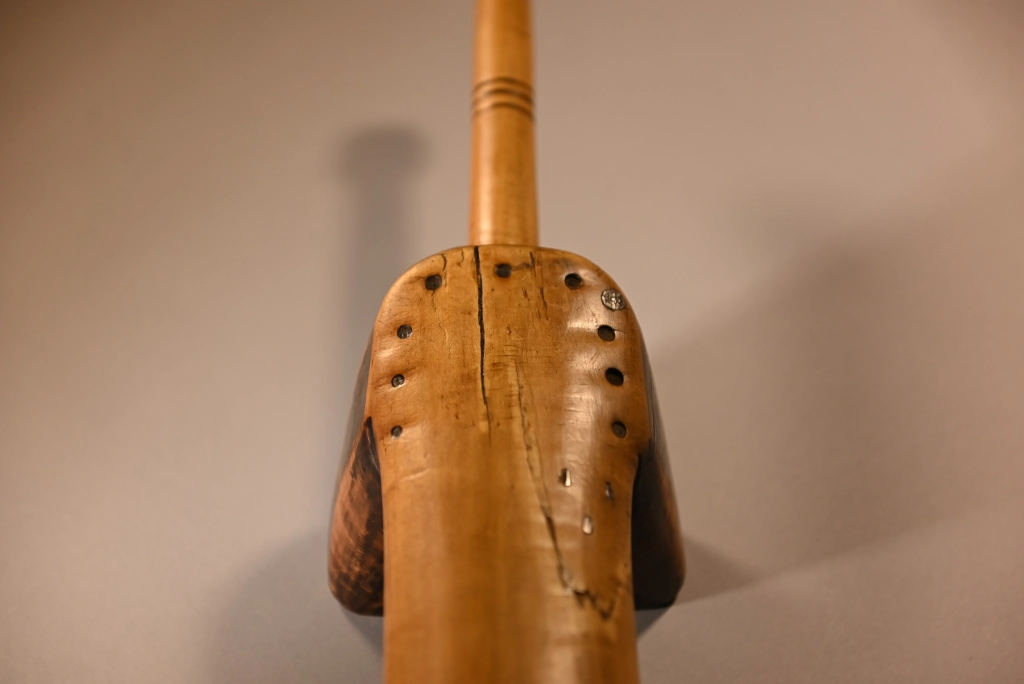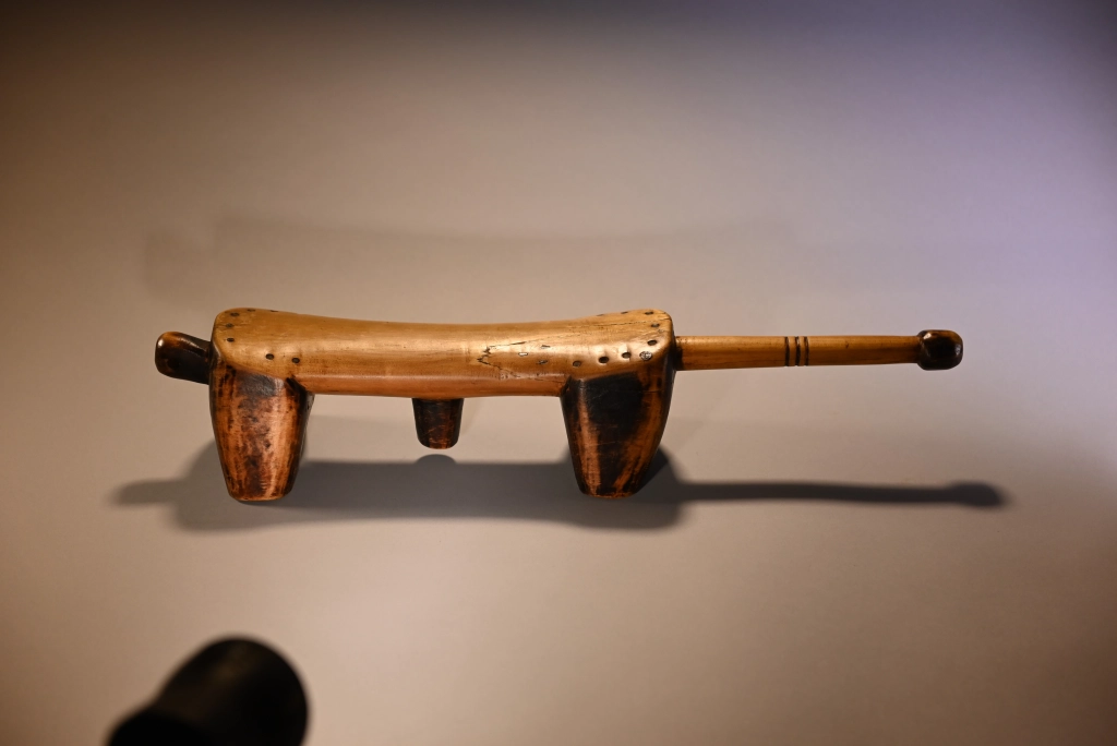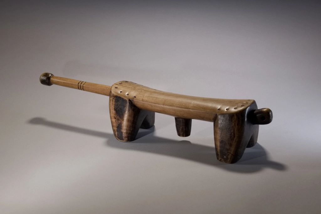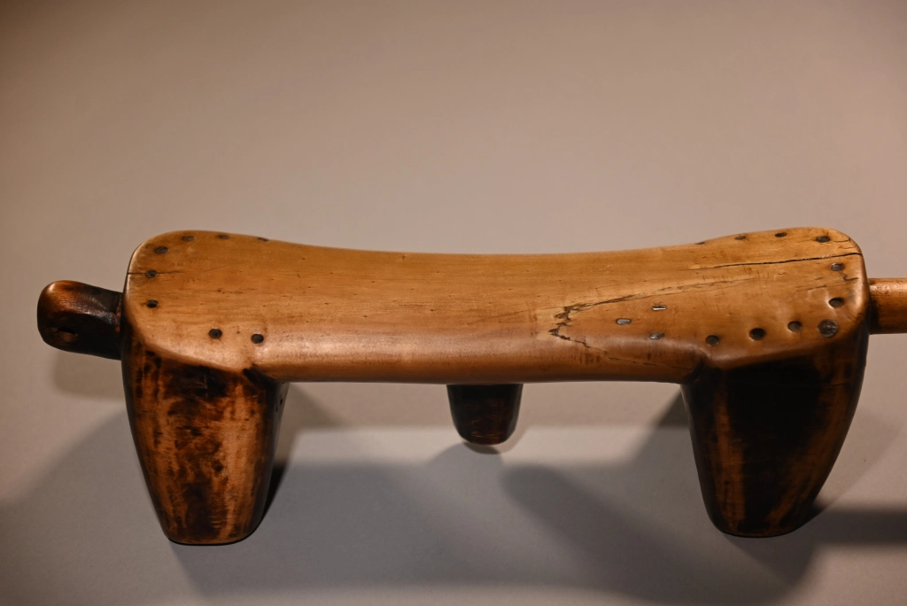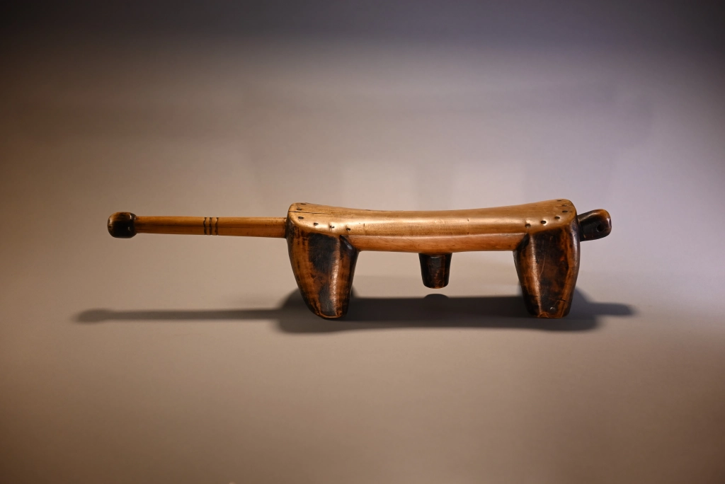 Cette pièce est un mix des styles swazi et zoulou. Elle a été trouvée à Pongola, dans le KwazuluNatal, mais à quelques kilomètres de la frontière de l’Eswatini. Cet appui-tête représente un quadrupède stylisé avec une petite tête sphérique noire au bout d’un cou étiré ainsi qu’une queue représentée par une boule noire, ou l’inverse, à l’imagination de chacun de choisir.