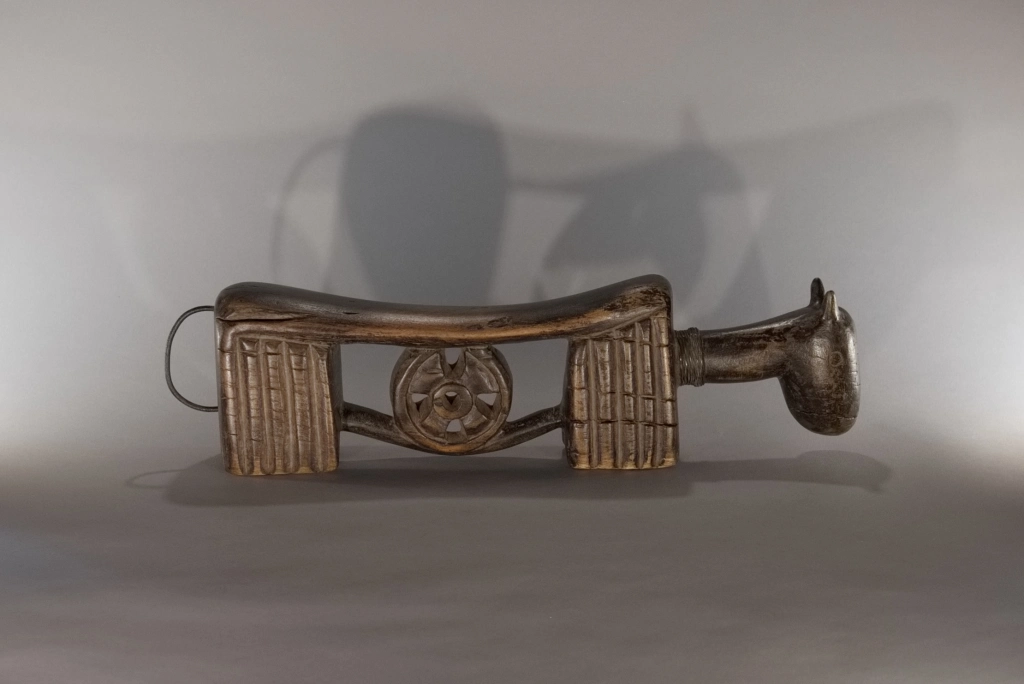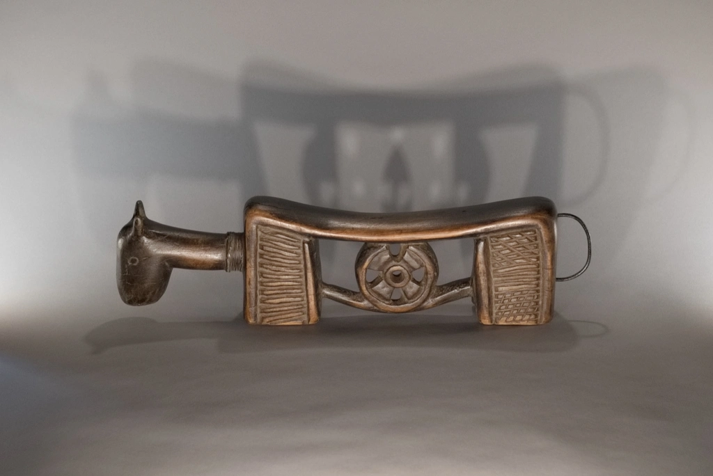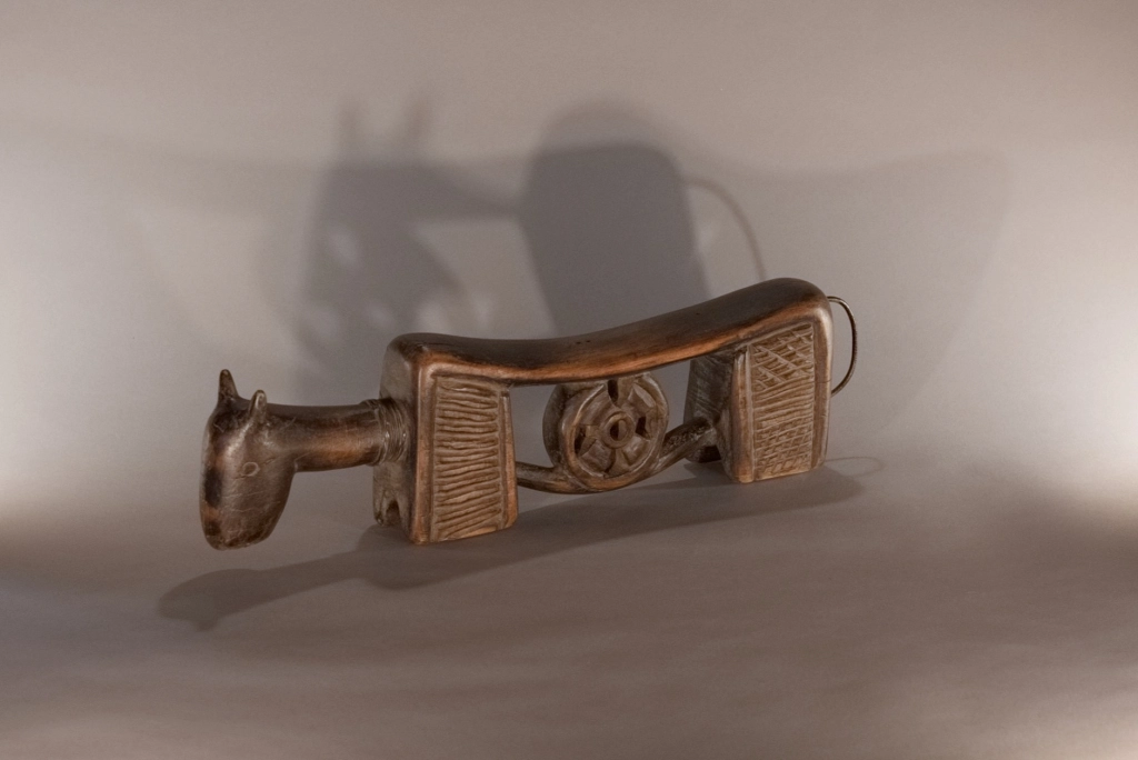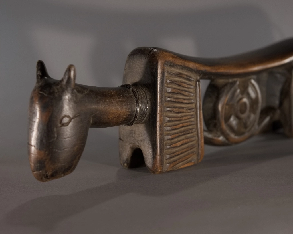 Une superbe pièce aux style mélangés swazi et shangaan. Sa structure n’est pas sans rappeler S066 le célèbre appui-tête à damier. Ici, les deux pieds traditionnels à cannelures sont rejoints par une barre en partie basse et une roue de train. Cet appui-tête zoomorphe possède une tête de cheval comme si le concept de cheval-vapeur était une évidence pour le sculpteur. Il faut noter que cette pièce possède une queue représentée par une tige métallique qui sert aussi de poignée, le téton a lui disparu de cette pièce. Plus âgée que S066, on peut sans conteste situer cette œuvre vers la fin du XIXe siècle.