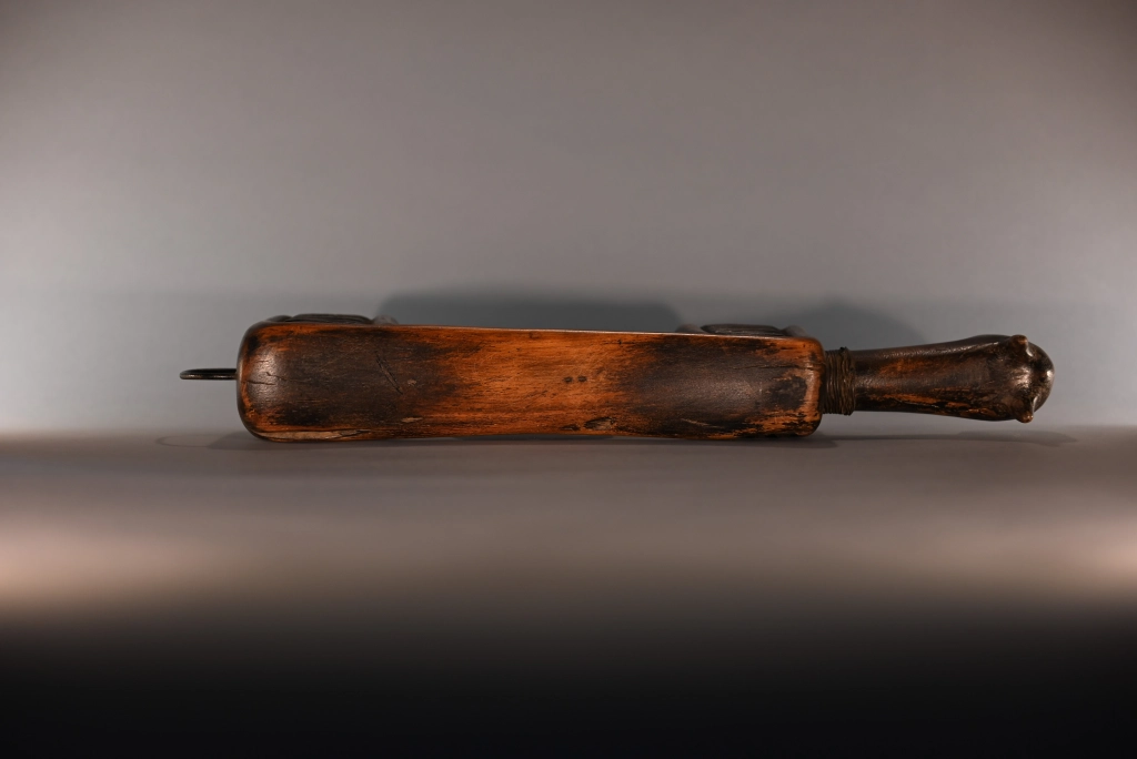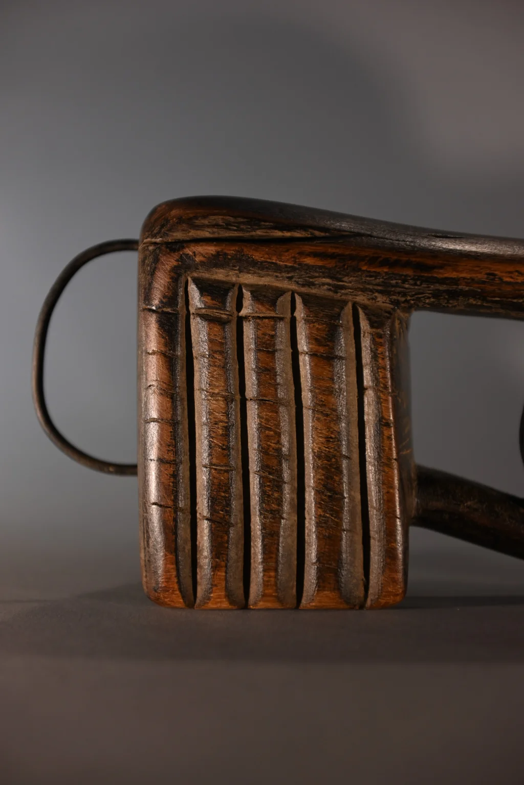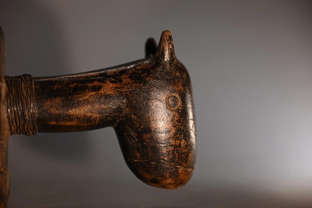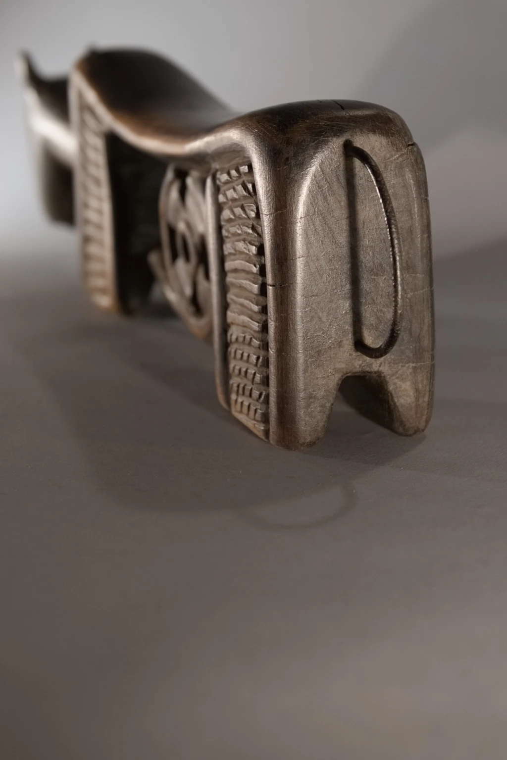 Une superbe pièce aux style mélangés swazi et shangaan. Sa structure n’est pas sans rappeler S066 le célèbre appui-tête à damier. Ici, les deux pieds traditionnels à cannelures sont rejoints par une barre en partie basse et une roue de train. Cet appui-tête zoomorphe possède une tête de cheval comme si le concept de cheval-vapeur était une évidence pour le sculpteur. Il faut noter que cette pièce possède une queue représentée par une tige métallique qui sert aussi de poignée, le téton a lui disparu de cette pièce. Plus âgée que S066, on peut sans conteste situer cette œuvre vers la fin du XIXe siècle.