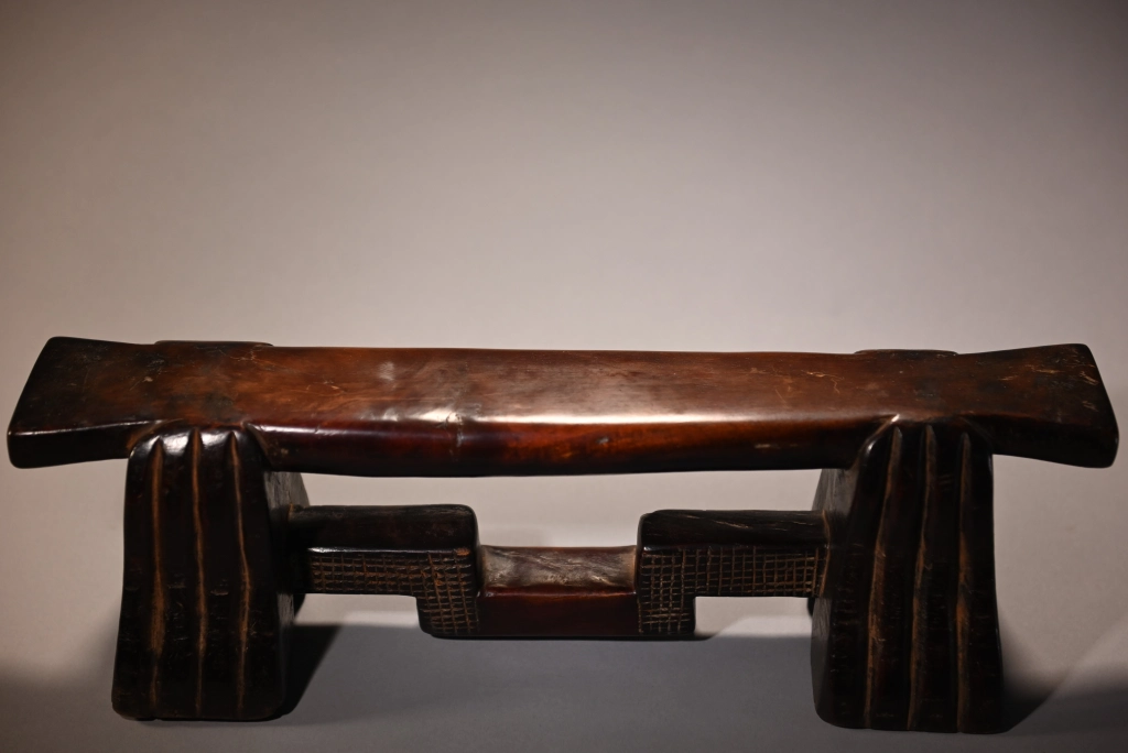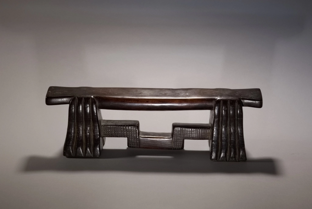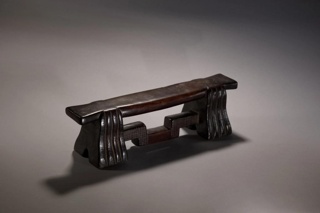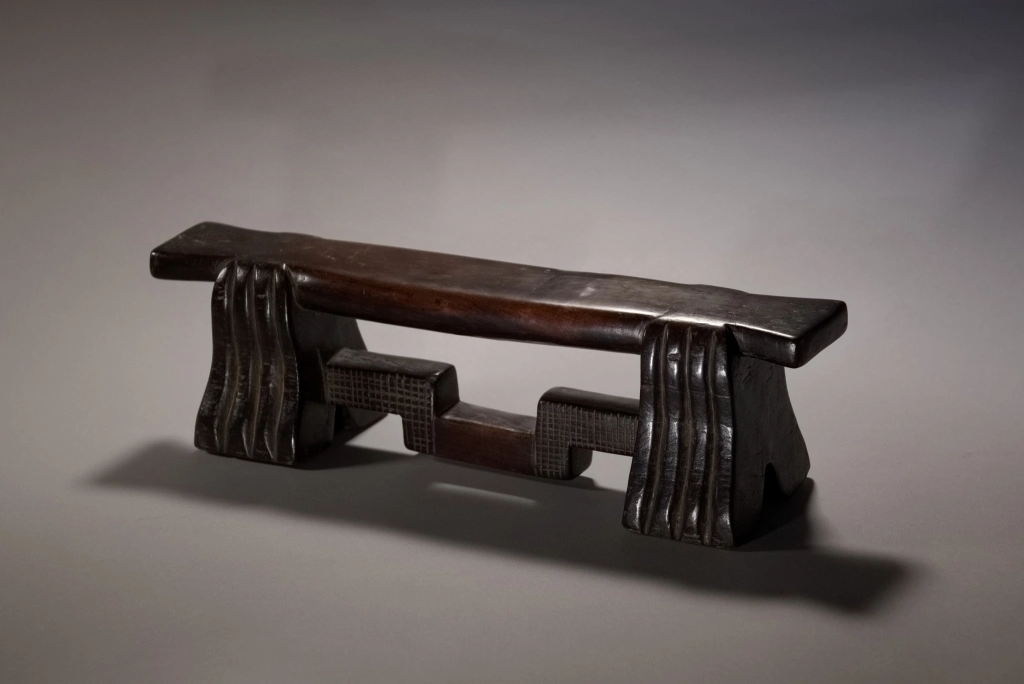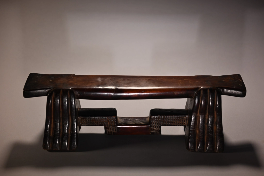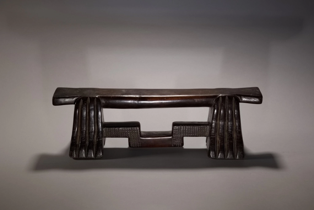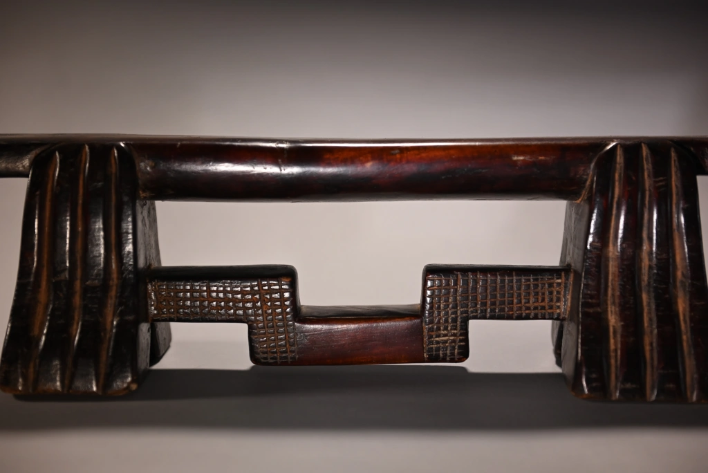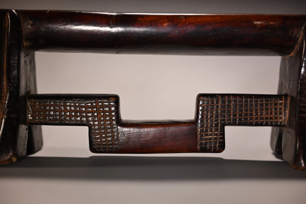 D’influence mixte, entre zoulou et swazi, les cannelures typiques des pieds l’emportent sur les décorations en amasumpa de la barre de renfort. On reconnaît la même école de sculpteurs que la pièce S032 dans des dimensions et teintes extrêmement différentes. Cette pièce a été longuement détenue par Jurgen Witt, un citoyen allemand arrivé en Afrique du Sud en 1952 et devenu rapidement le conservateur du Musée Tzaneen pour de très longues années, jusqu’à son décès, à près de 90 ans, en 2019, laissant son adjointe Florence Tshibeyahope à la tête de ce beau musée.